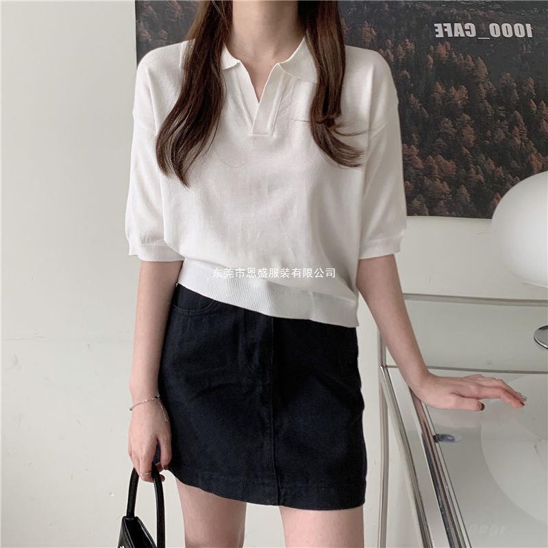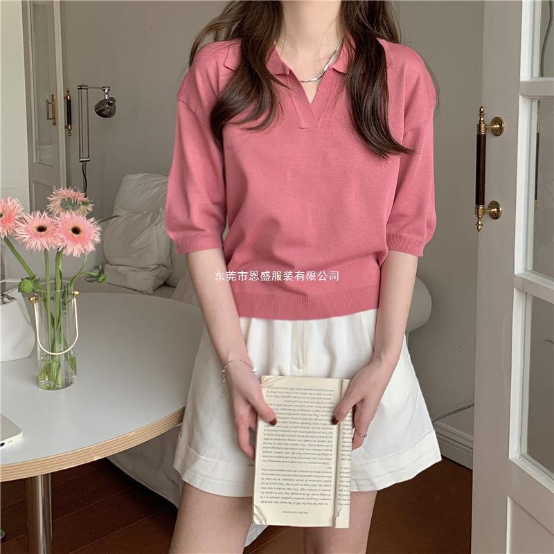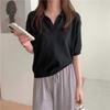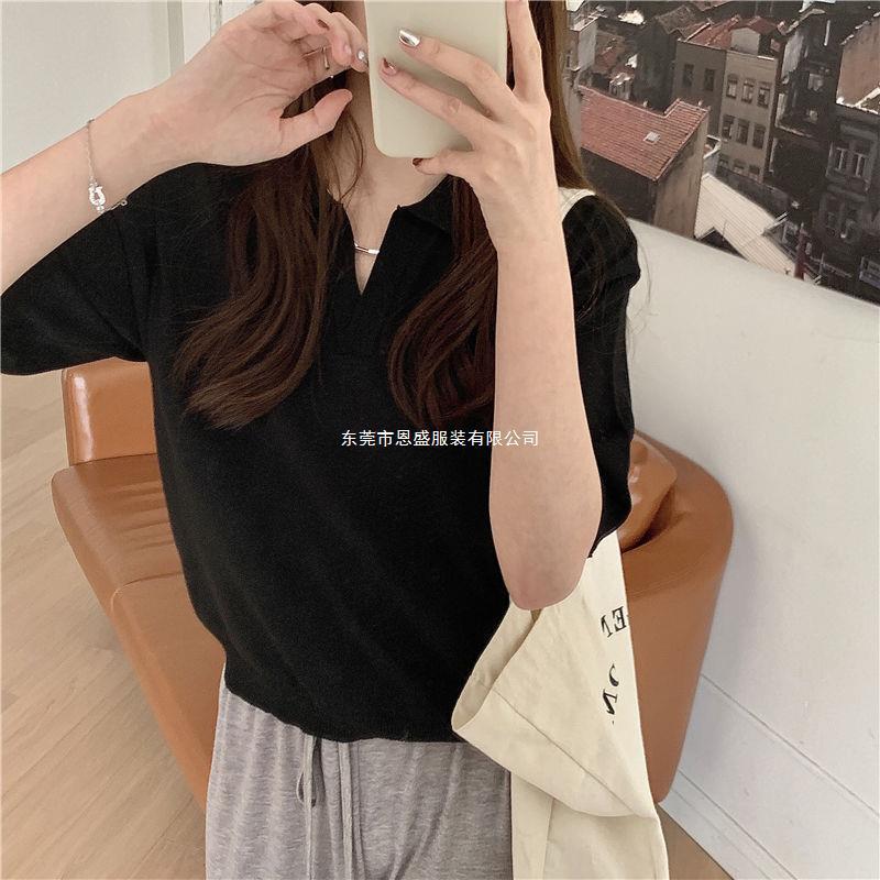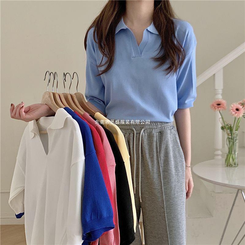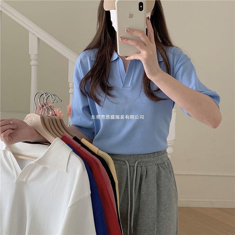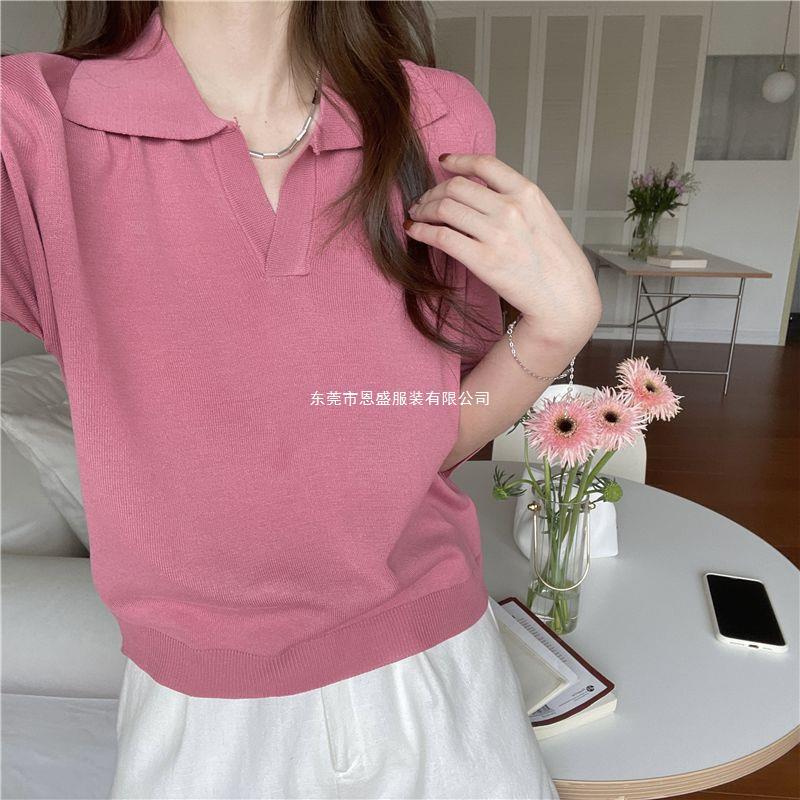 Verano 2024 Nuevo Estilo Coreano Holgado Adelgazante Top Cuello Polo Estilo Suave Seda de Hielo Manga Corta Camiseta Tejida para Mujer