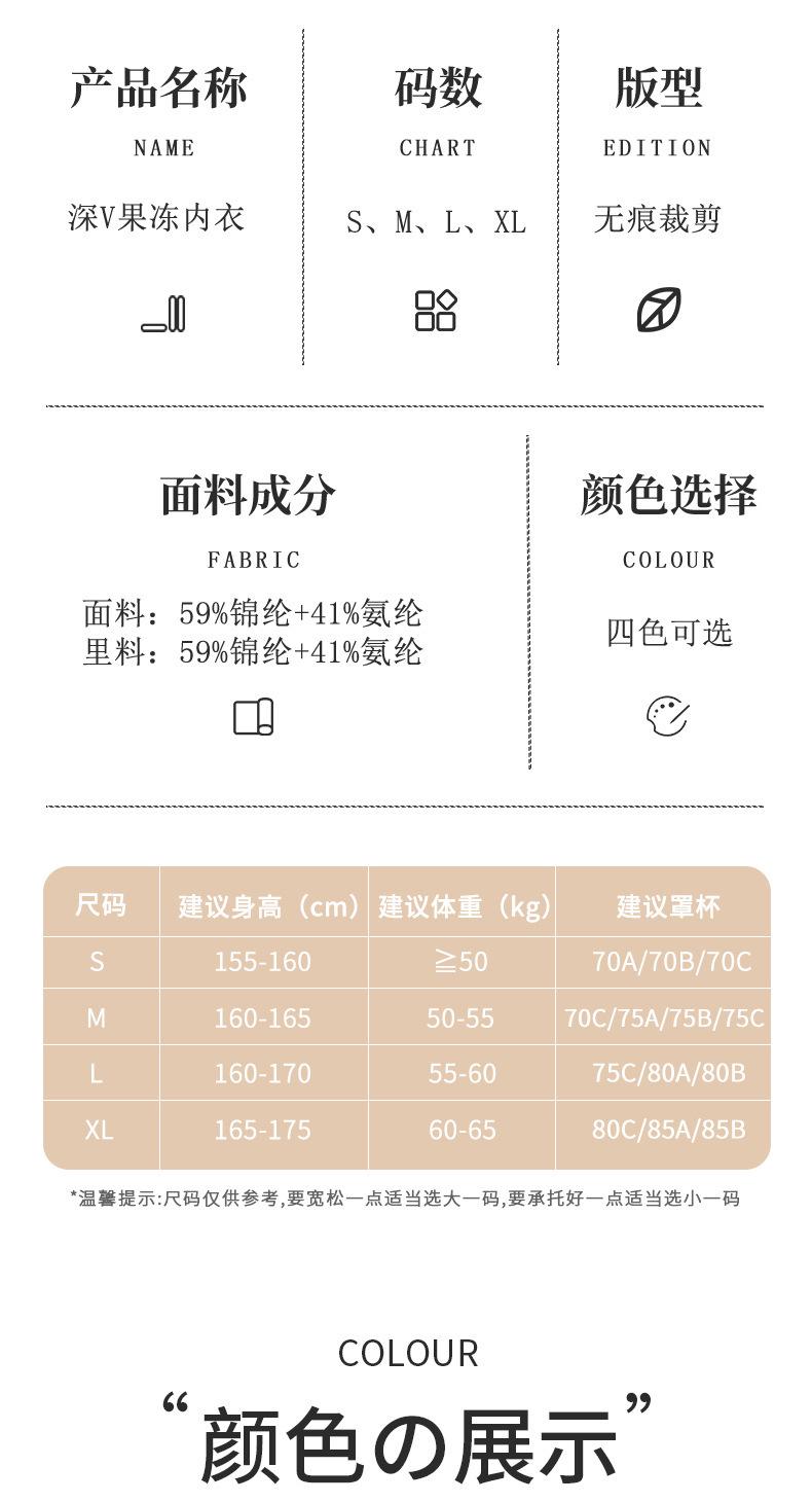S (32/70ABC), M (34/75ABC), L (36/80ABC), XL (38/85ABC), XXL(42/ABC)