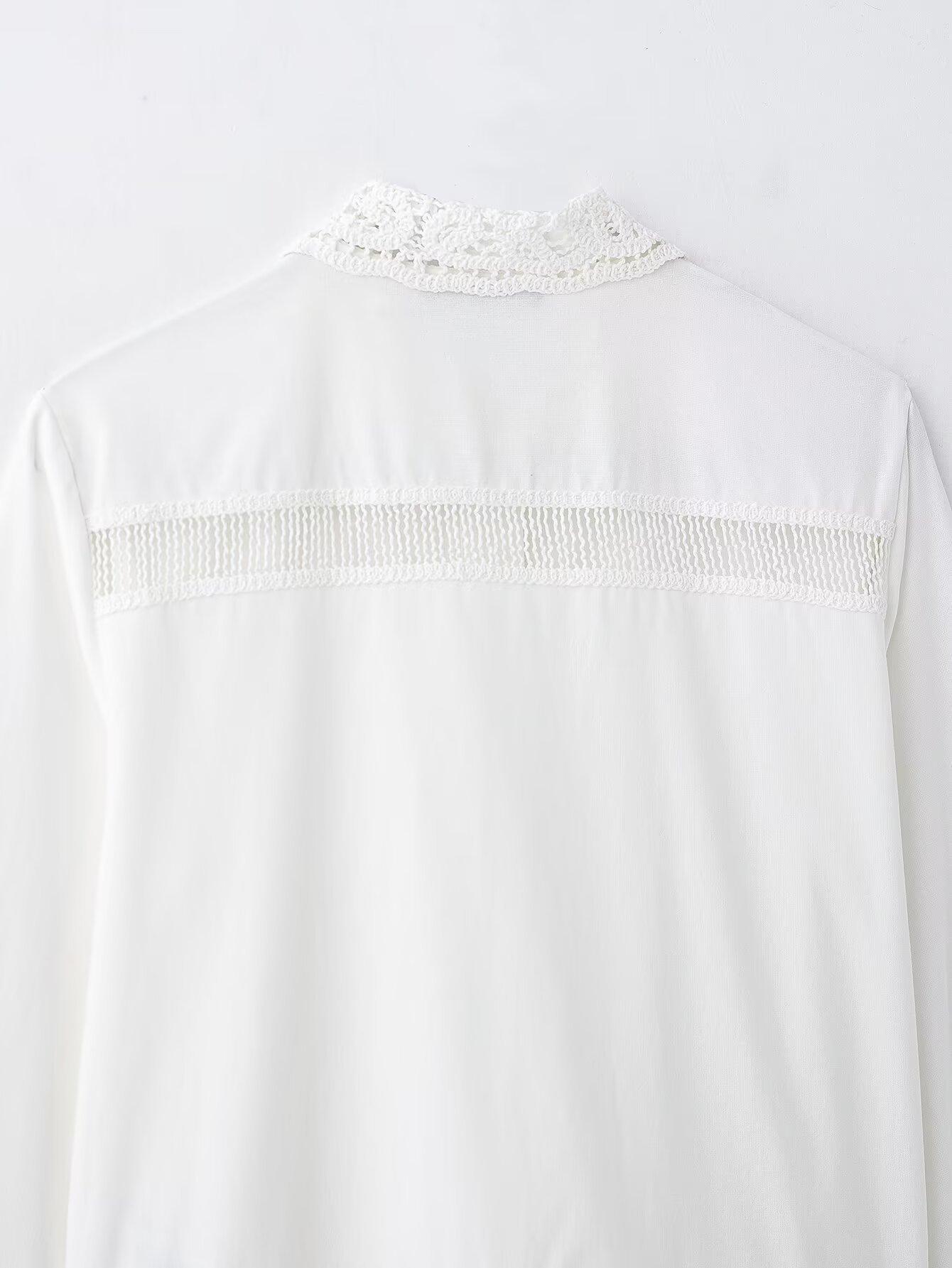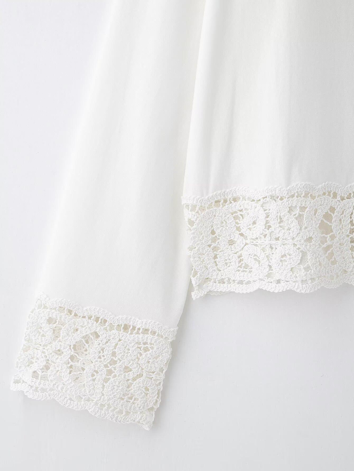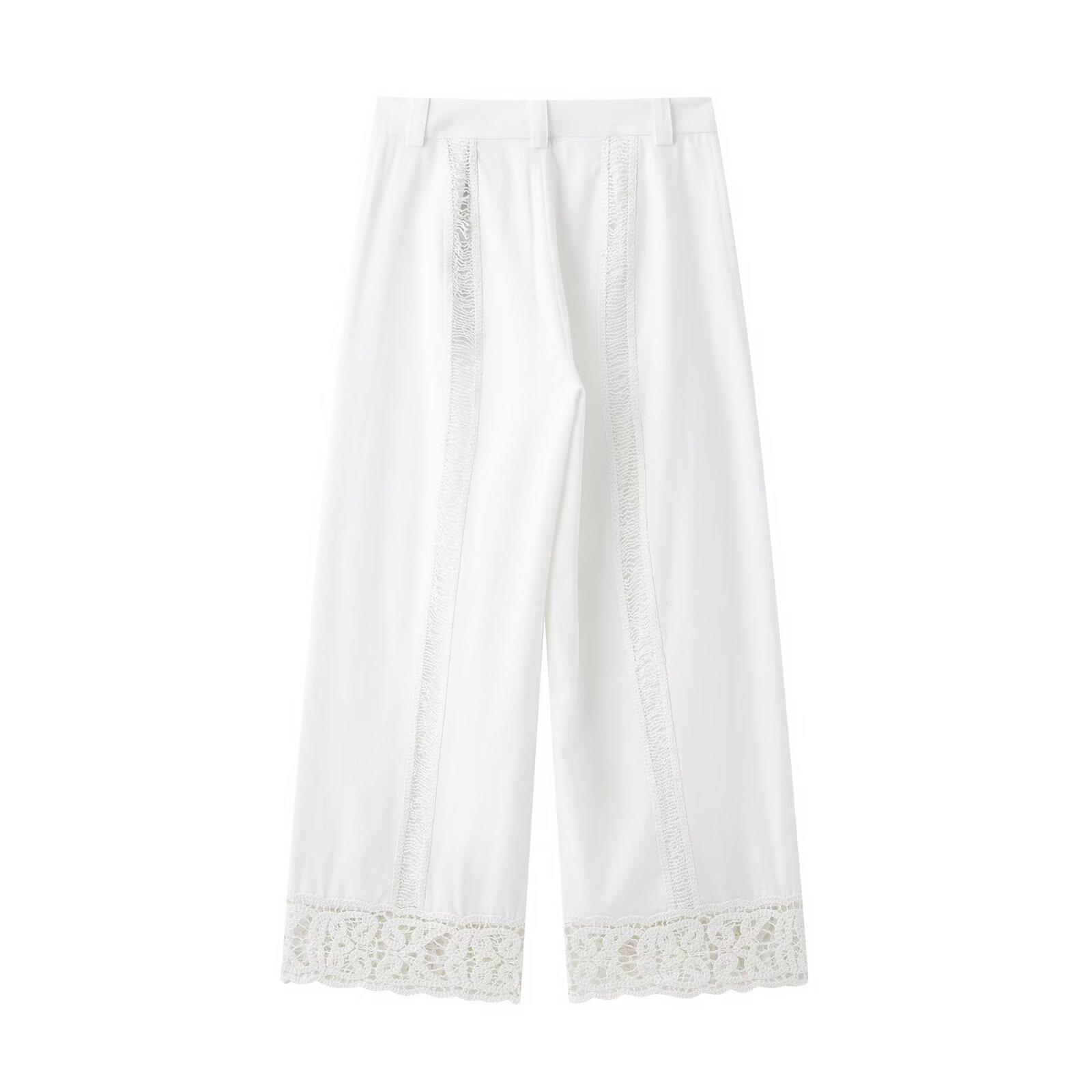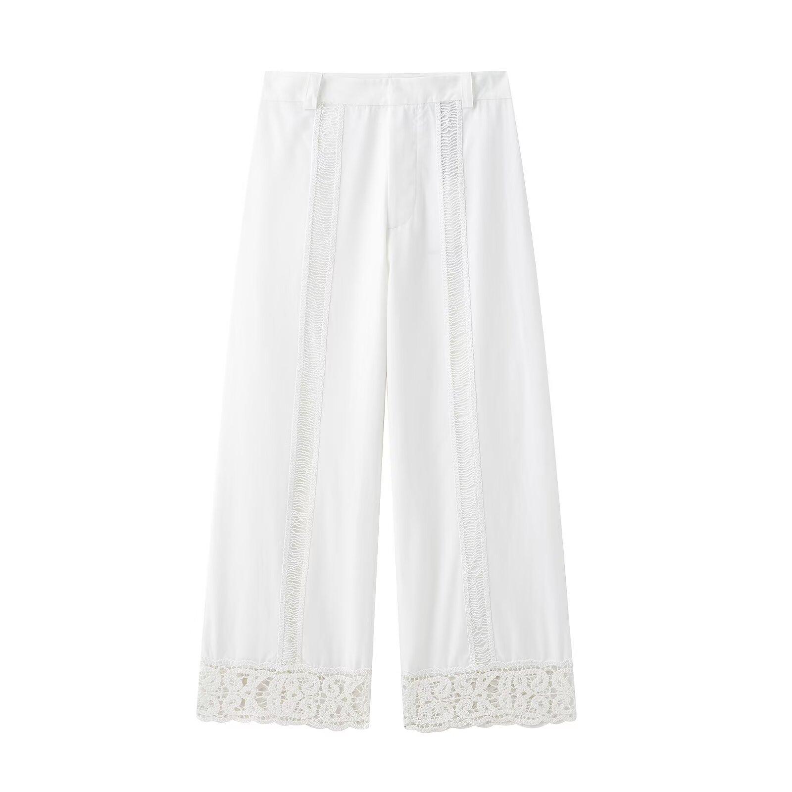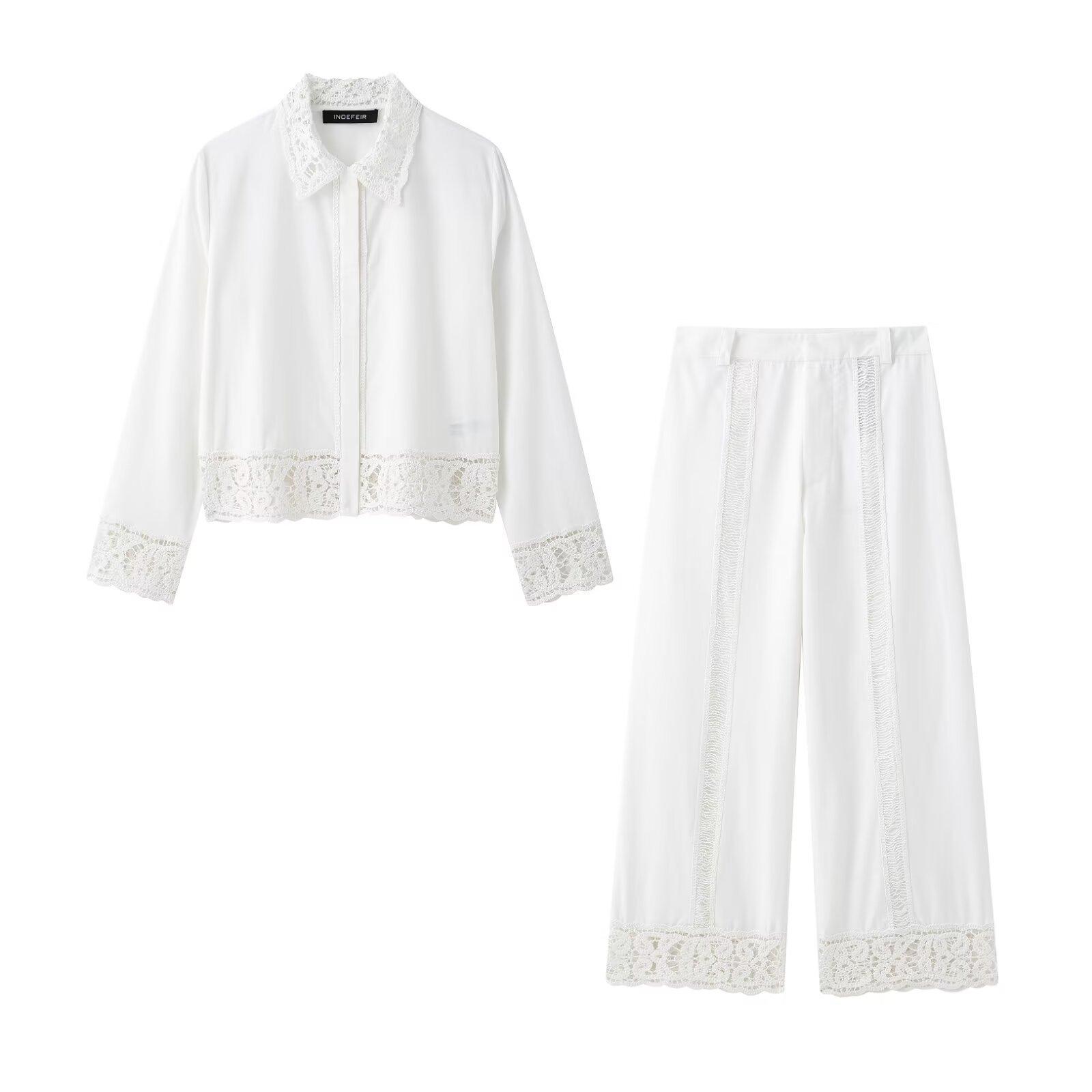2025 Primavera Nuevo Europeo y Americano Transfronterizo para Mujer Camisa de Manga Larga con Empalme de Crochet + Pantalón Recto Drapeado