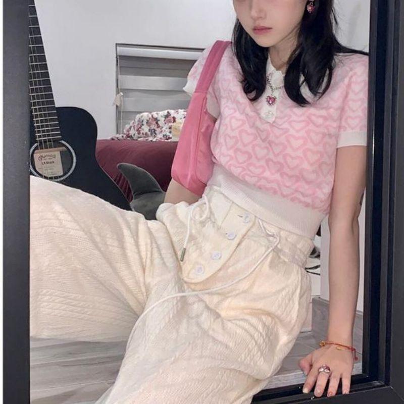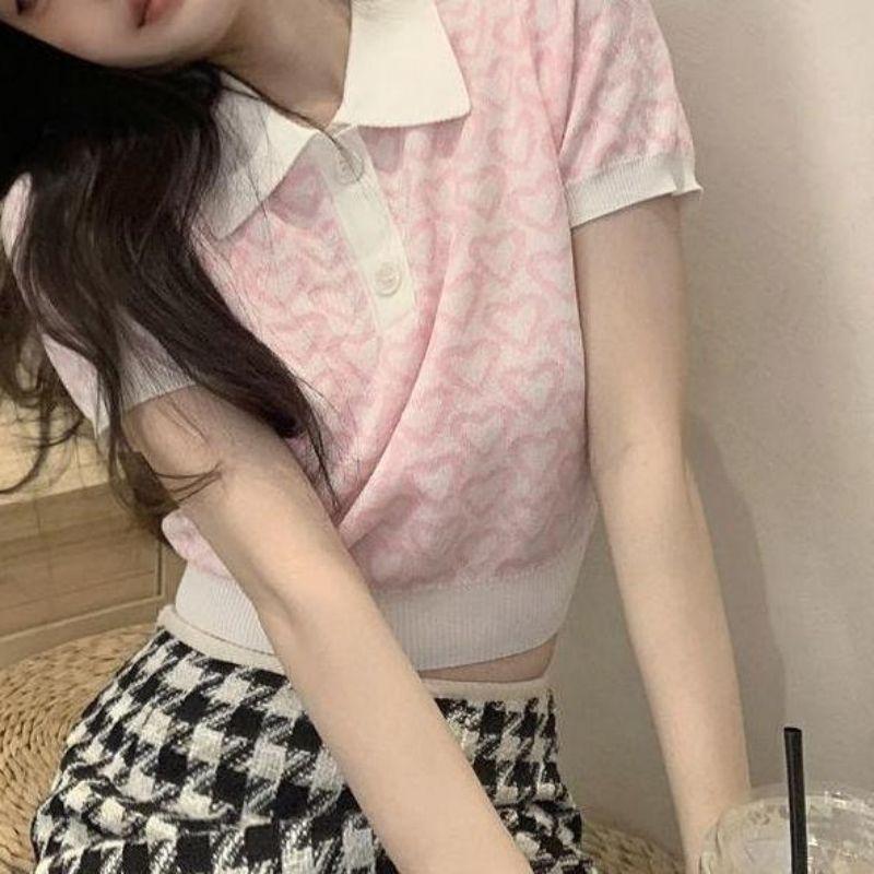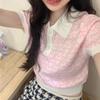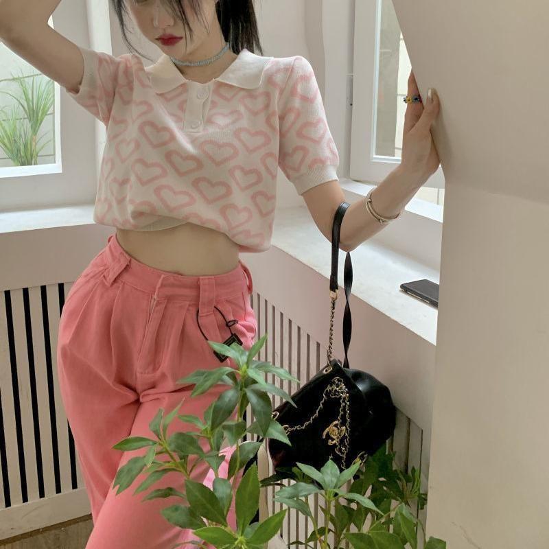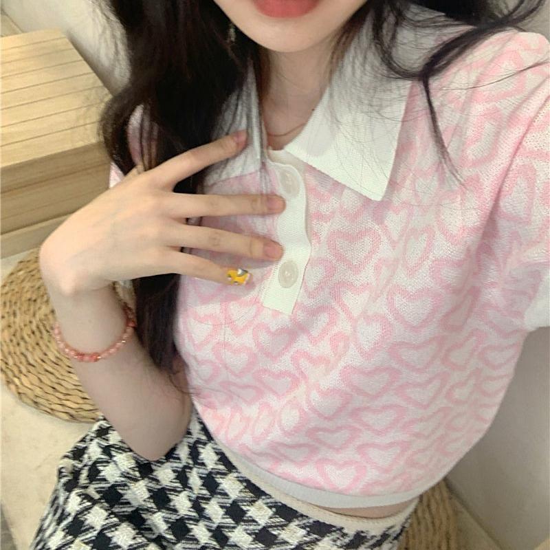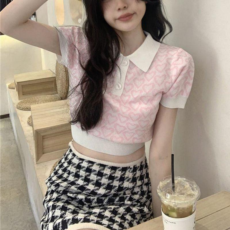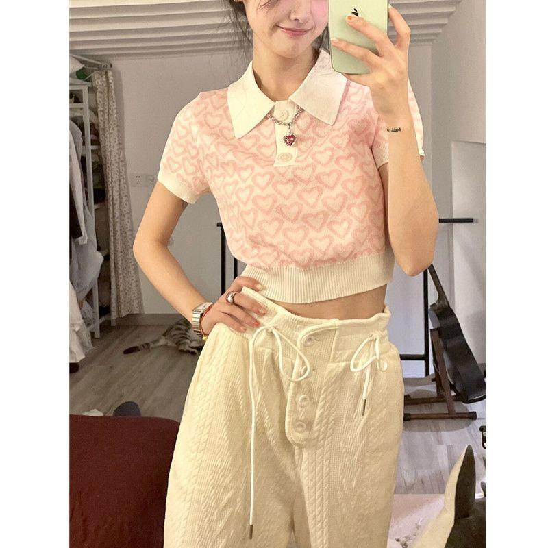 Suéter de Punto Jacquard Rosa Amor de Manga Corta para Mujer Verano Nuevo Dulce Reductor de Edad Cuello Polo Ajustado Top Corto