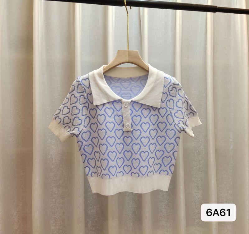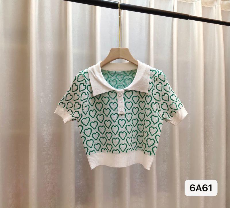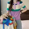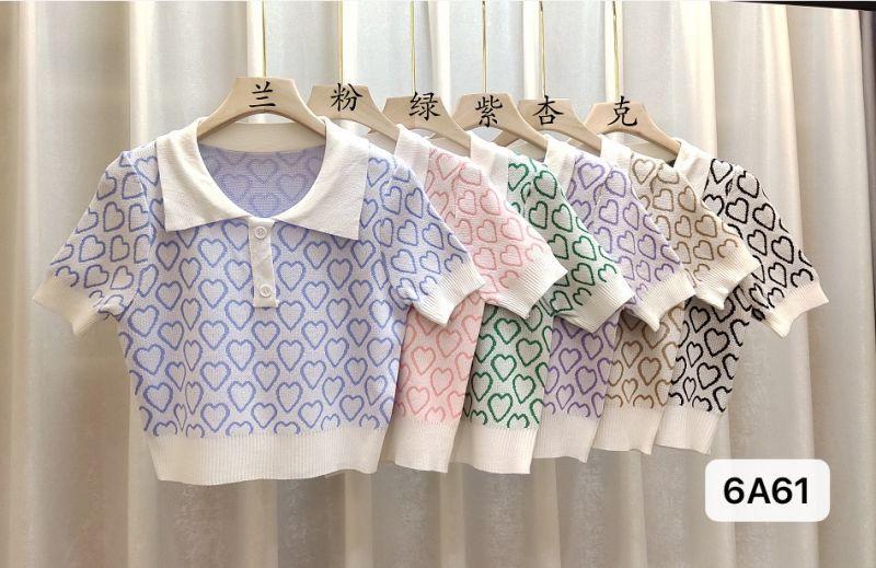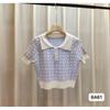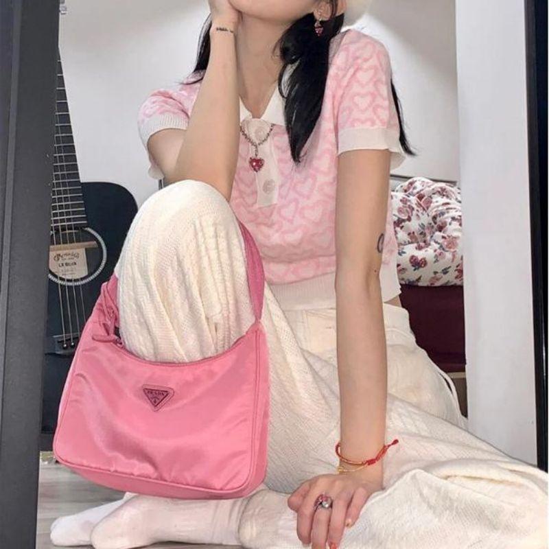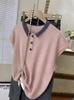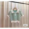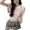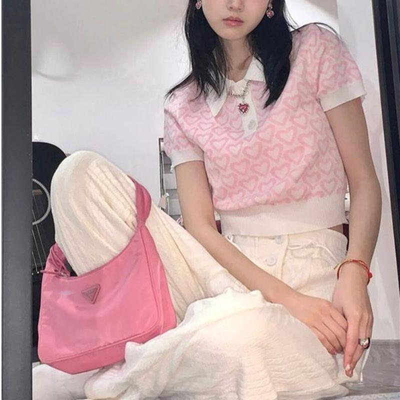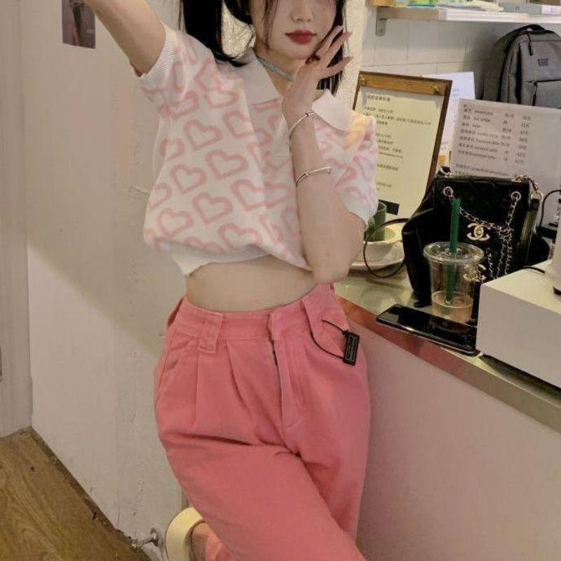 Suéter de Punto Jacquard Rosa Amor de Manga Corta para Mujer Verano Nuevo Dulce Reductor de Edad Cuello Polo Ajustado Top Corto