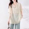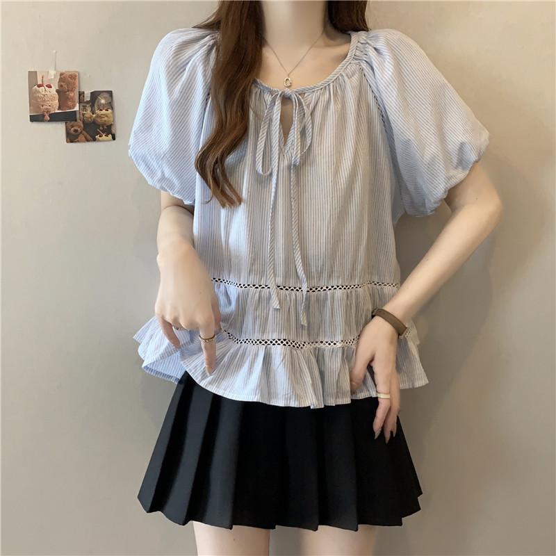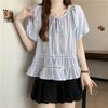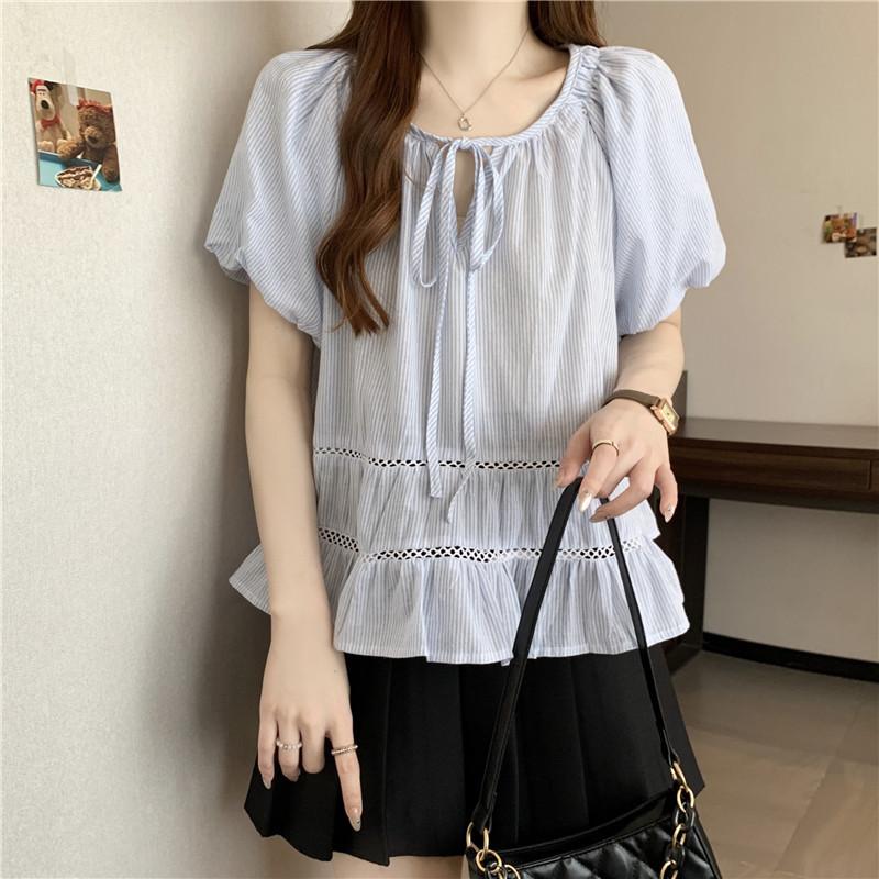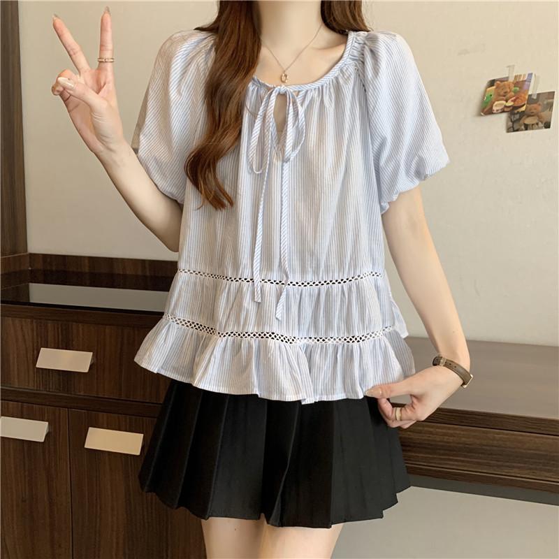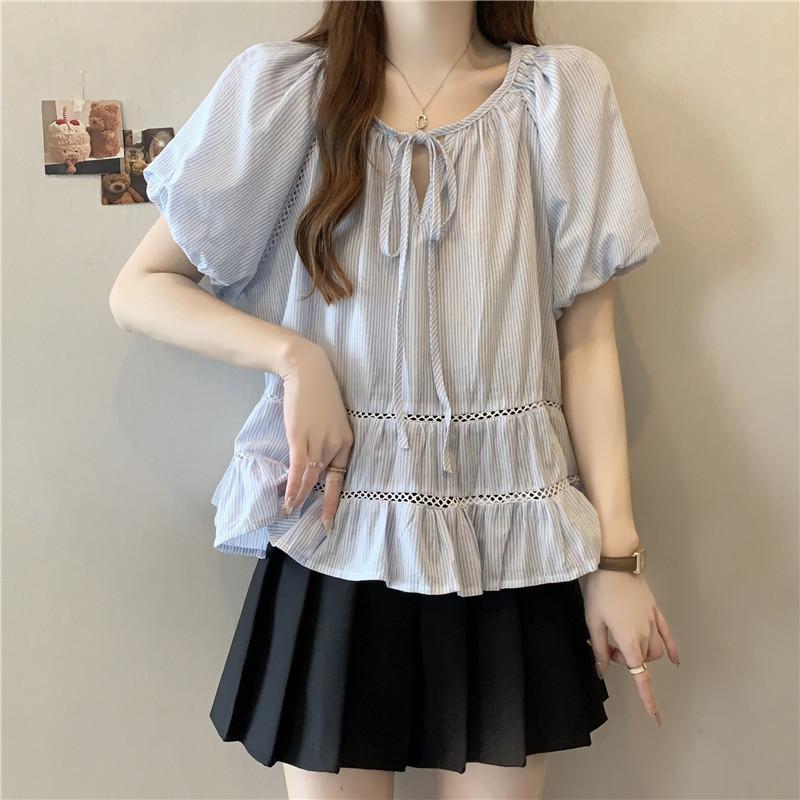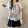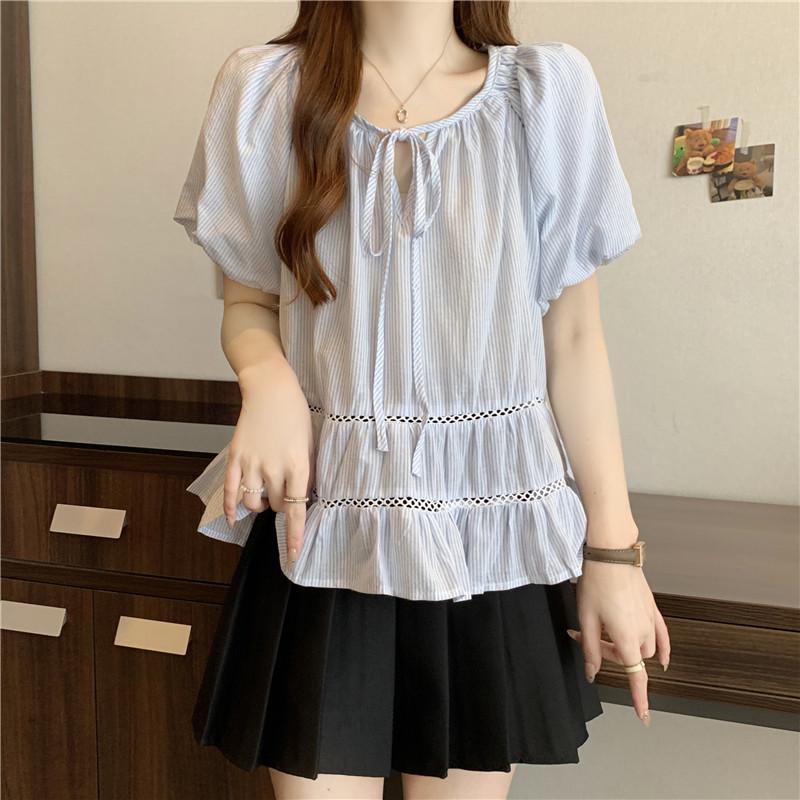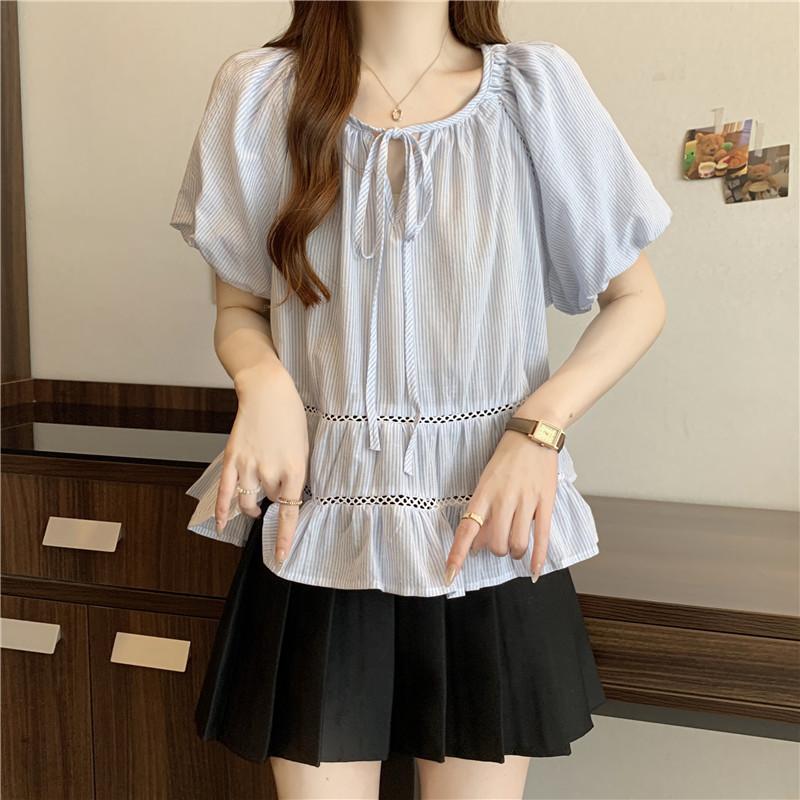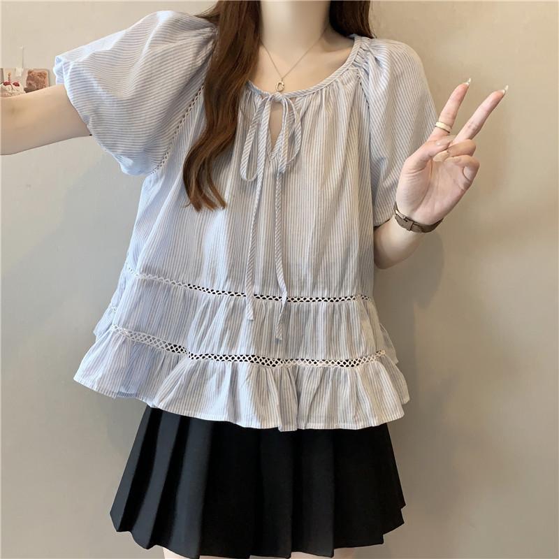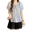 Foto Real de Ropa de Verano para Mujer de Talla Grande Lista para Usar, Diseño Nuevo, a la Moda, Tops de Rayas de Manga Corta de Aspecto Holgado y Adelgazante