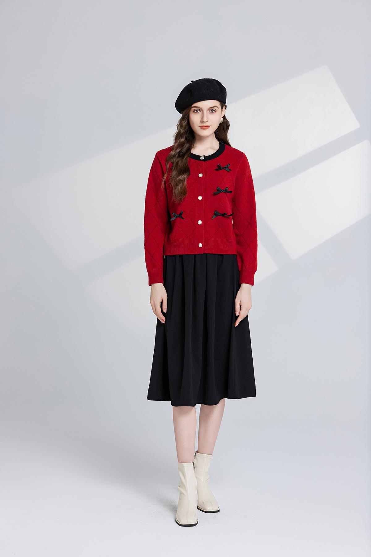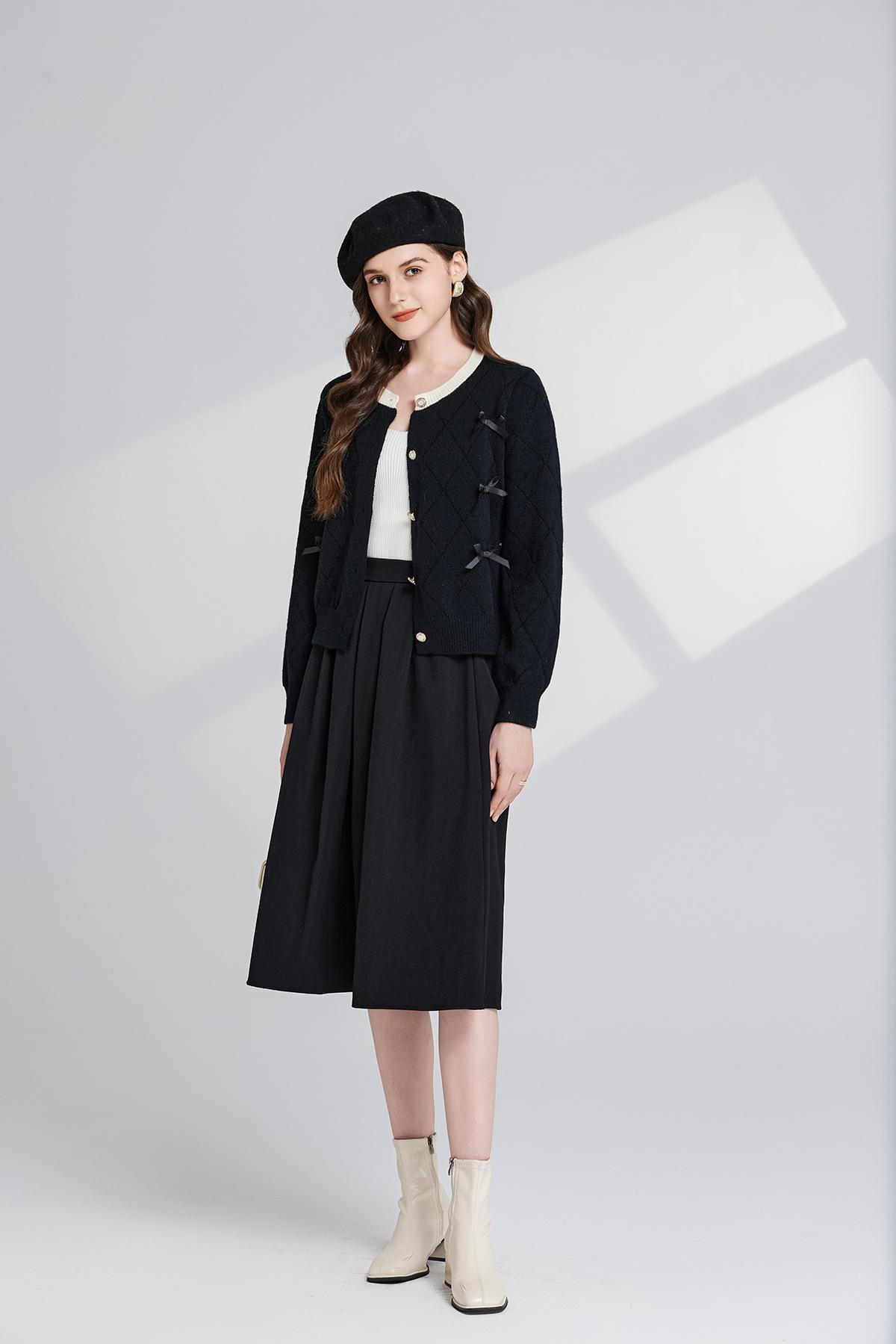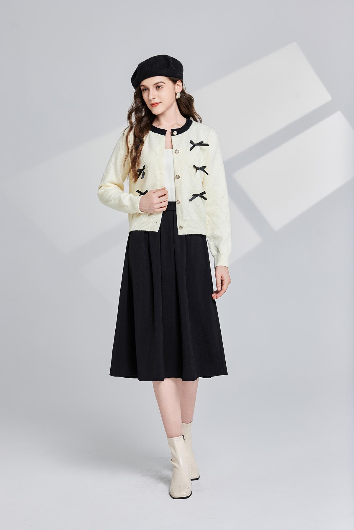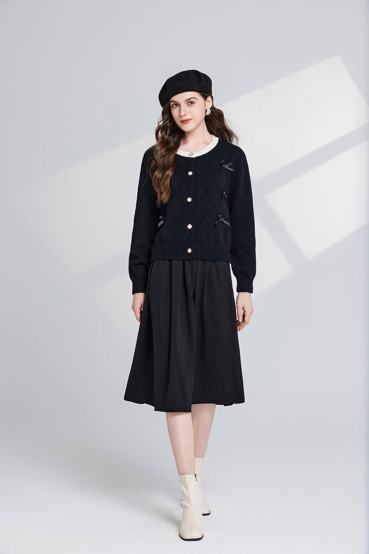 Conjunto de dos piezas de suéter con cuello redondo y falda de cintura alta con lazo y personalidad de otoño e invierno de toma real