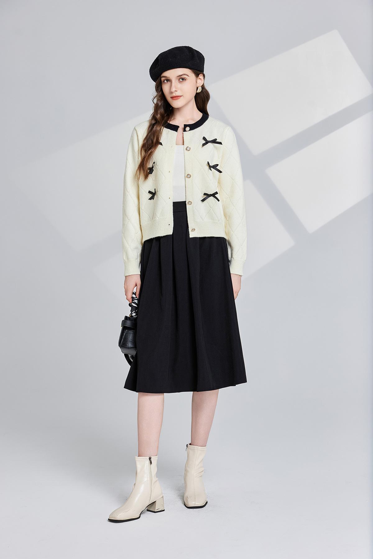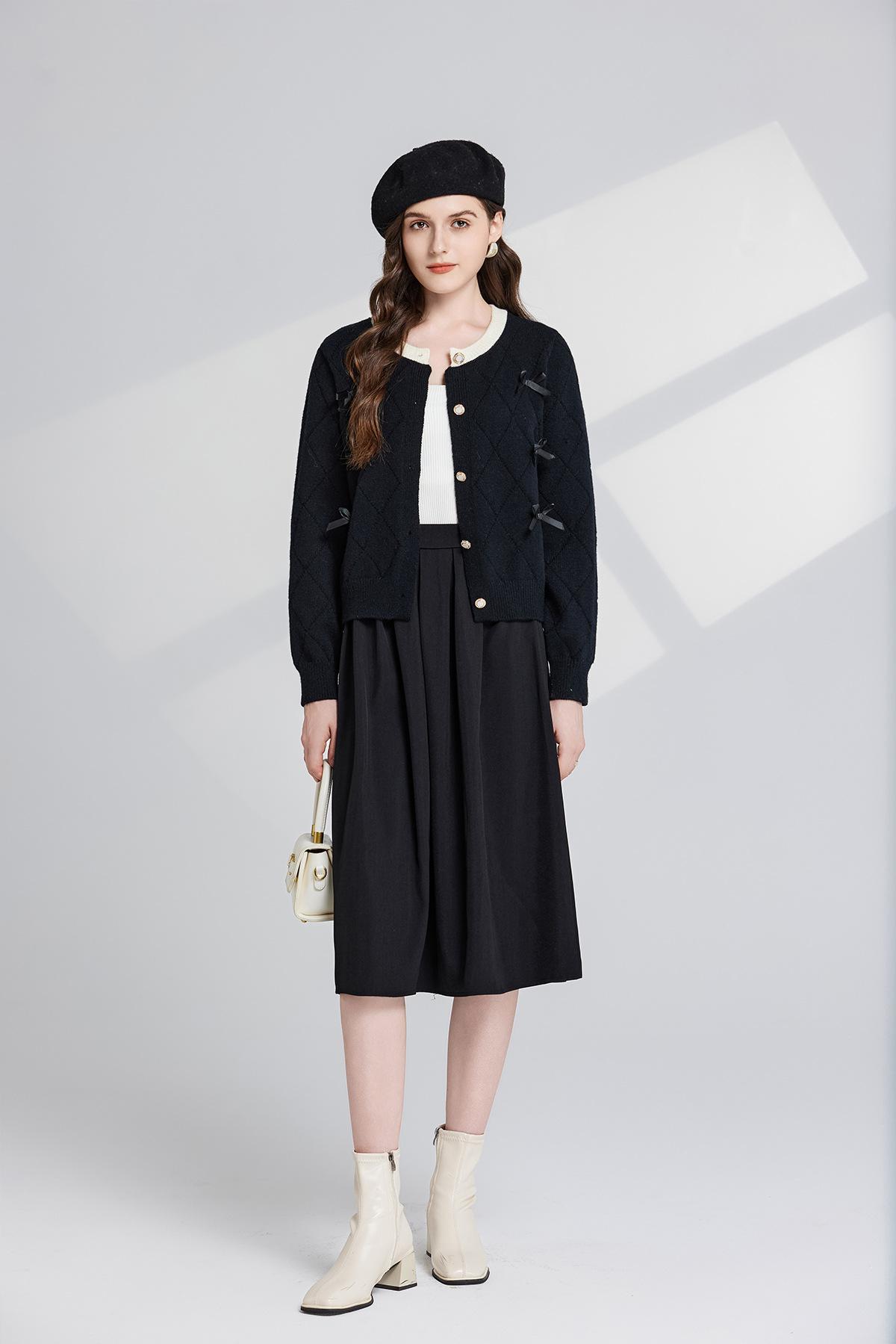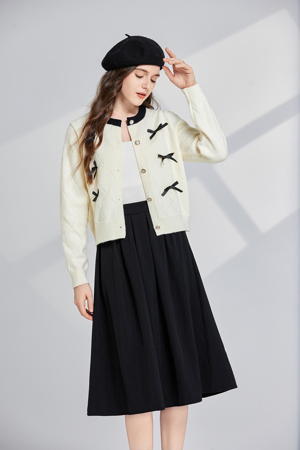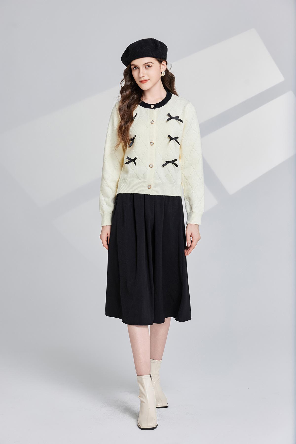Conjunto de dos piezas de suéter con cuello redondo y falda de cintura alta con lazo y personalidad de otoño e invierno de toma real