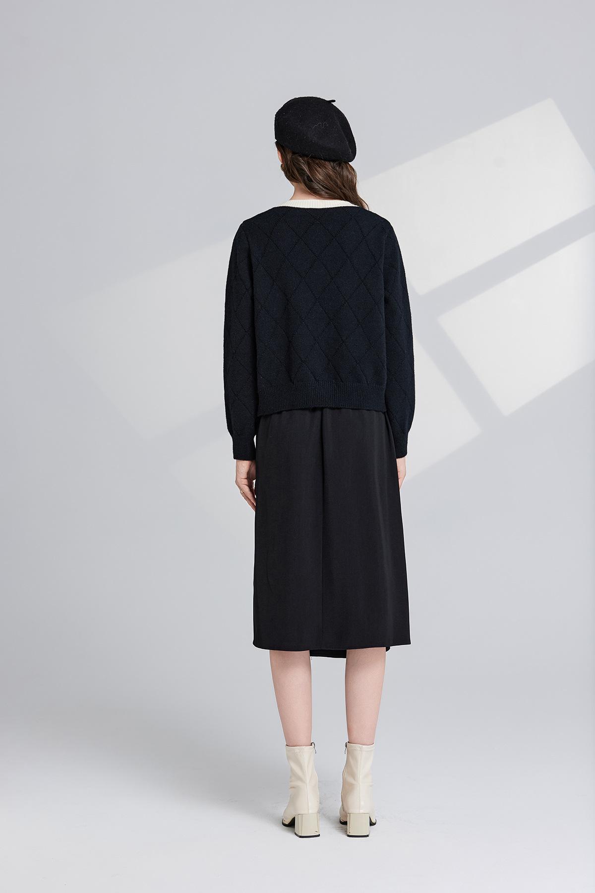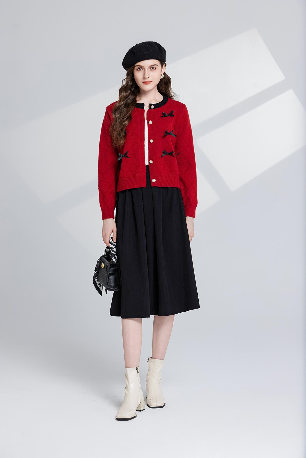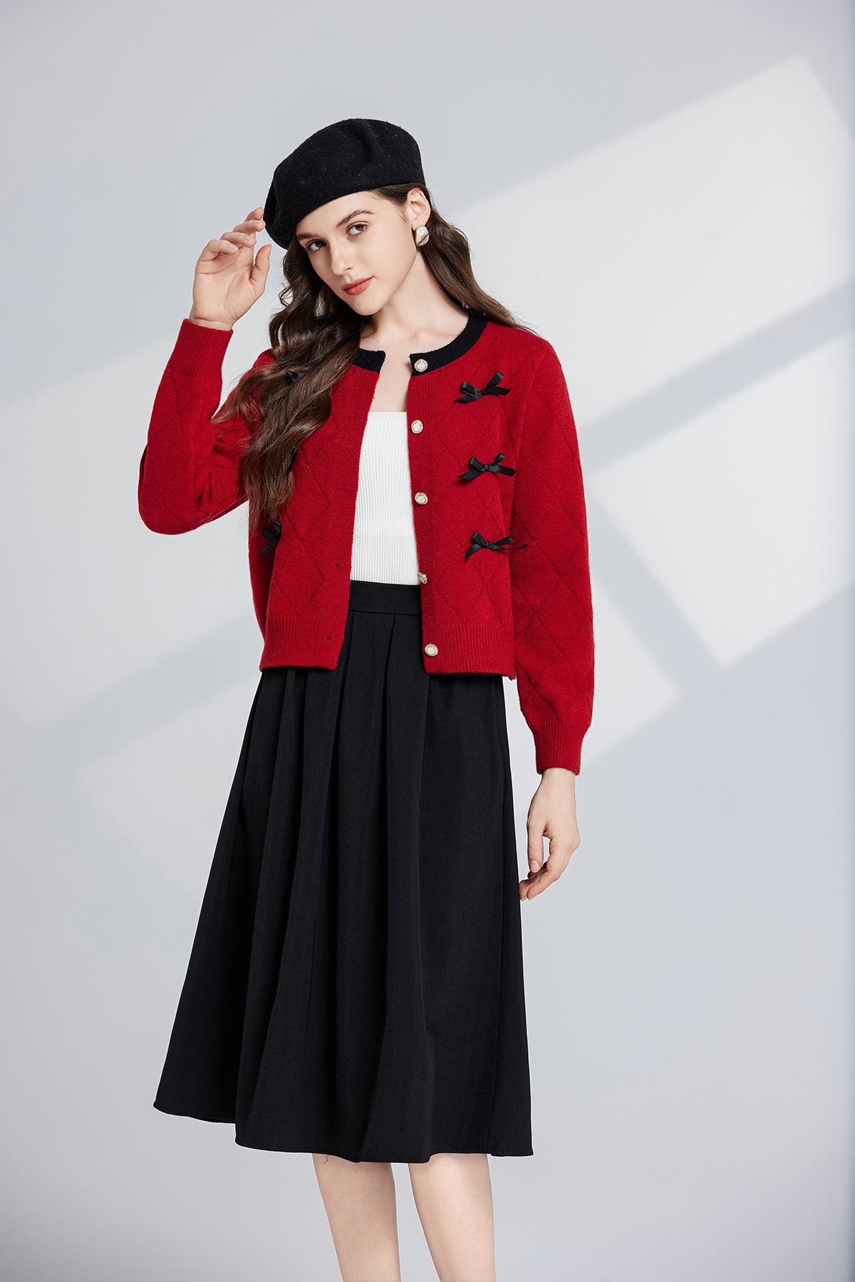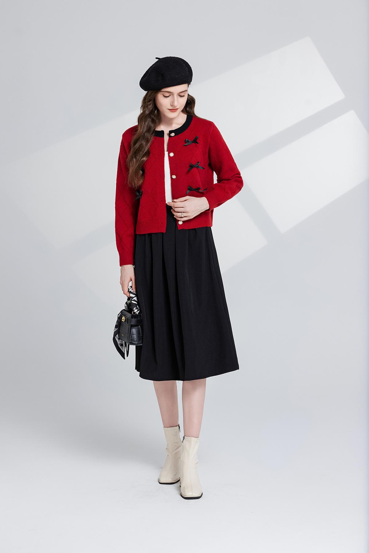 Conjunto de dos piezas de suéter con cuello redondo y falda de cintura alta con lazo y personalidad de otoño e invierno de toma real