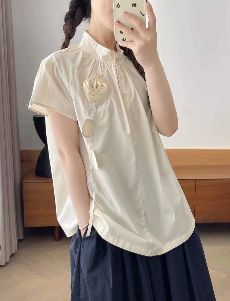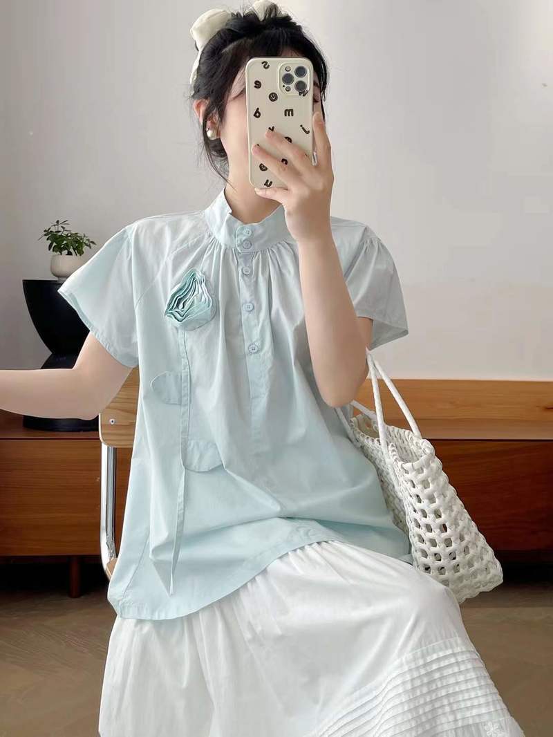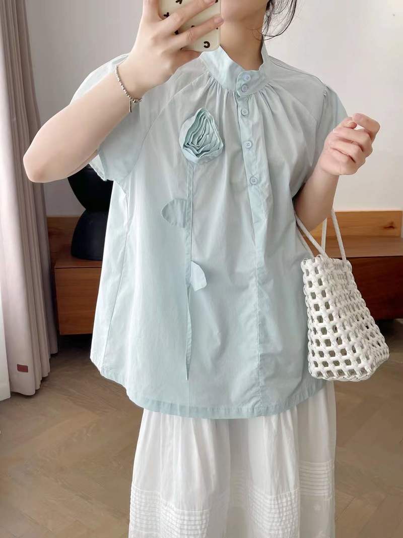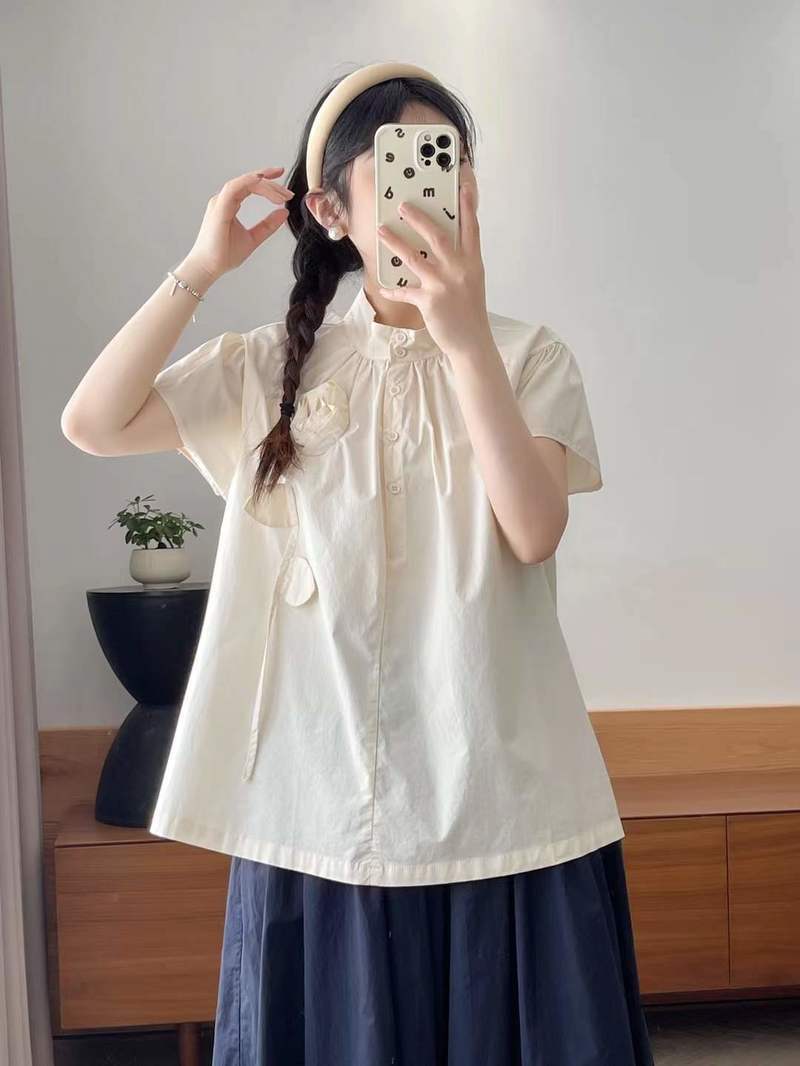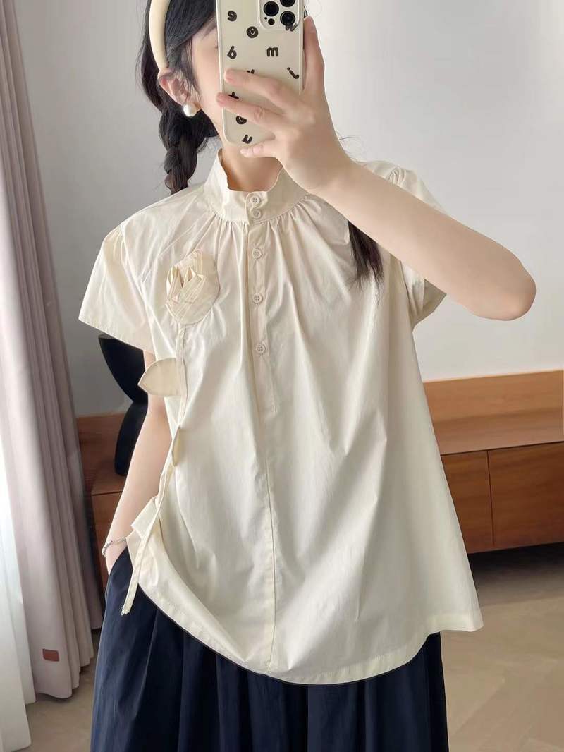Verano 2025 Nuevo Retro Dulce Cuello Alto Flor Tridimensional Camisa de Manga Corta Suelta Adelgazante Camisa Pulóver Venta al por Mayor