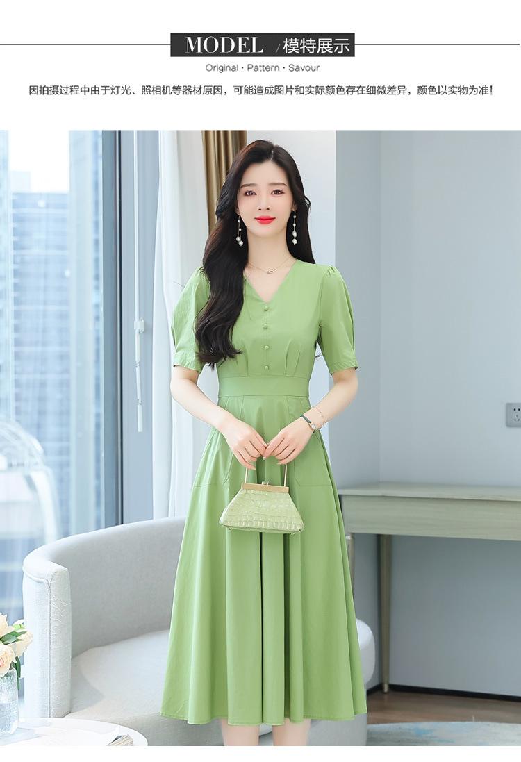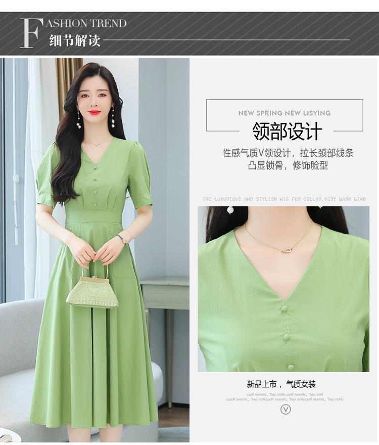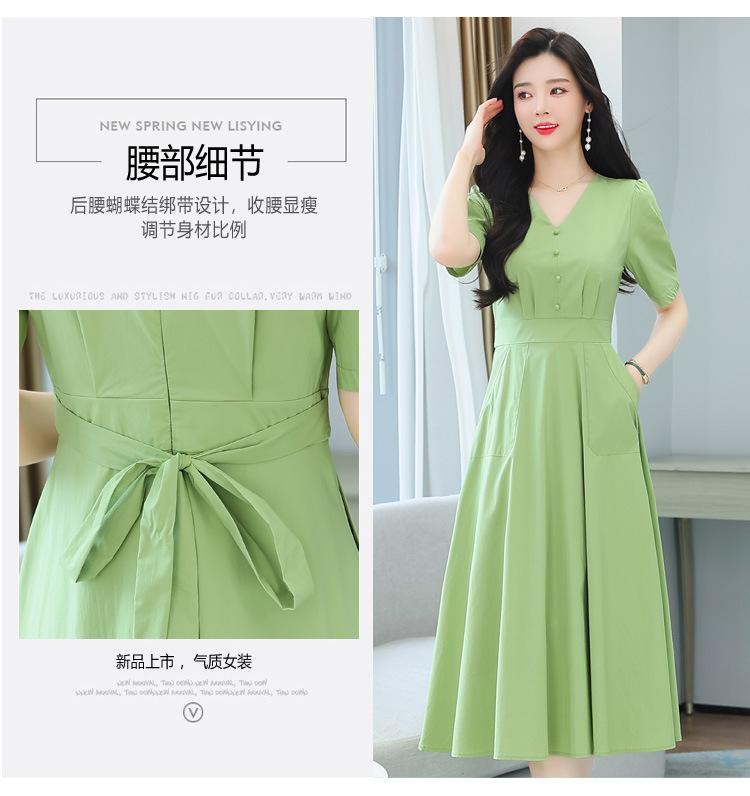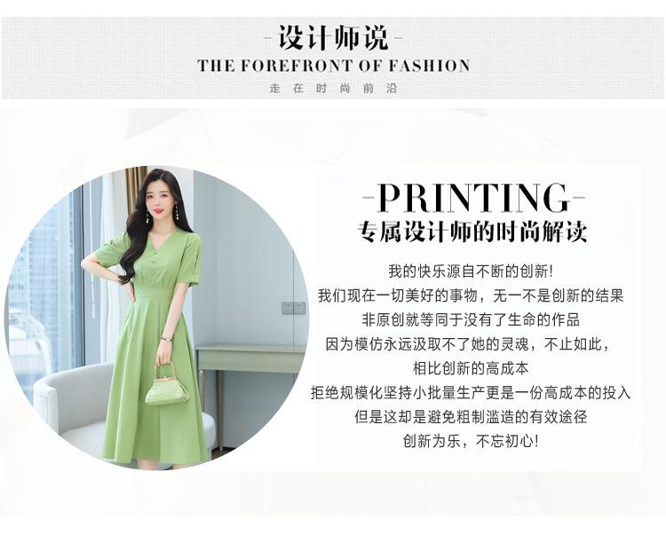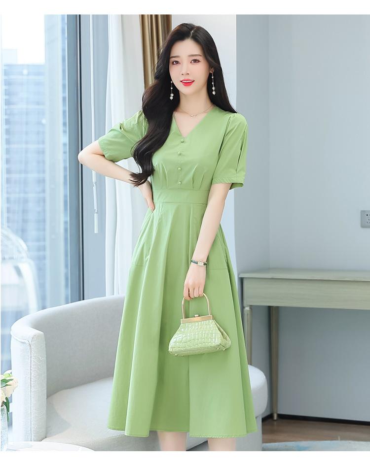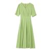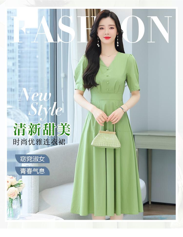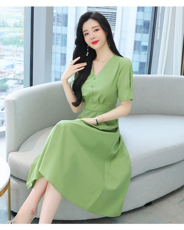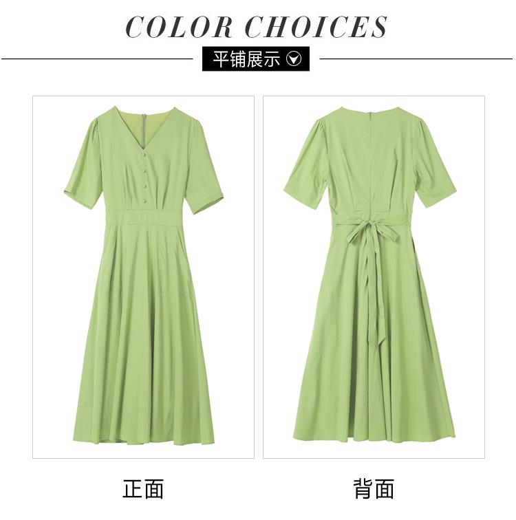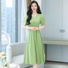 Foto Real de Vestido Retro Francés Blanco Verde Aguacate Primavera y Verano Dulce Cintura Cuello en V Falda Larga Línea A