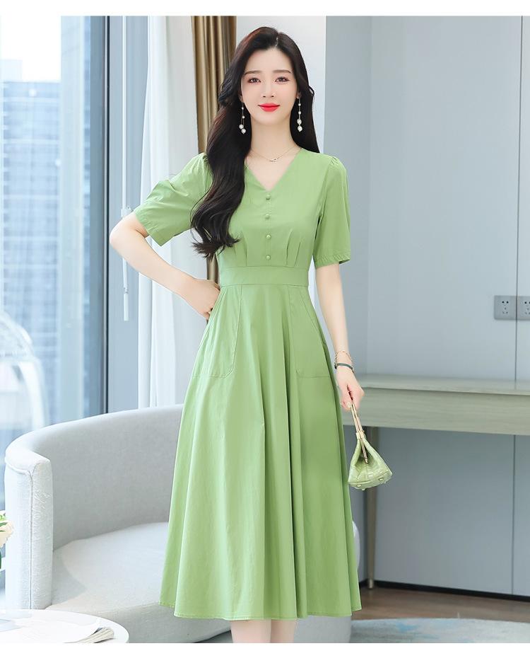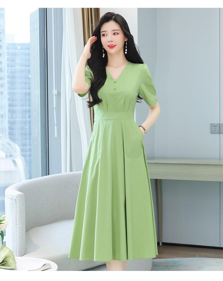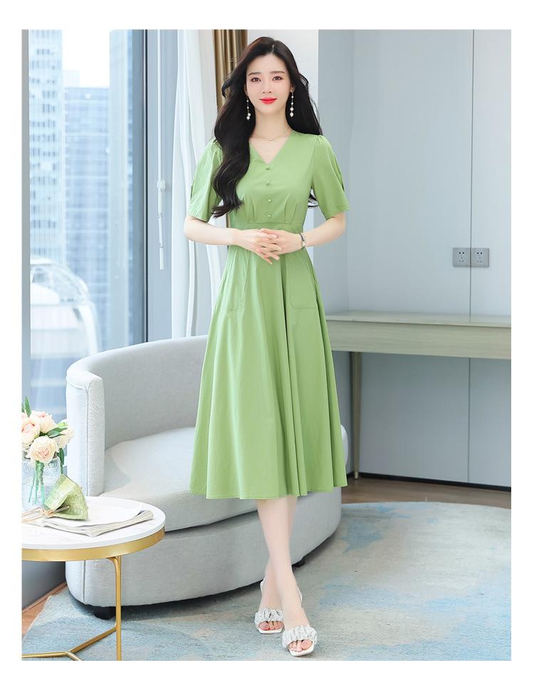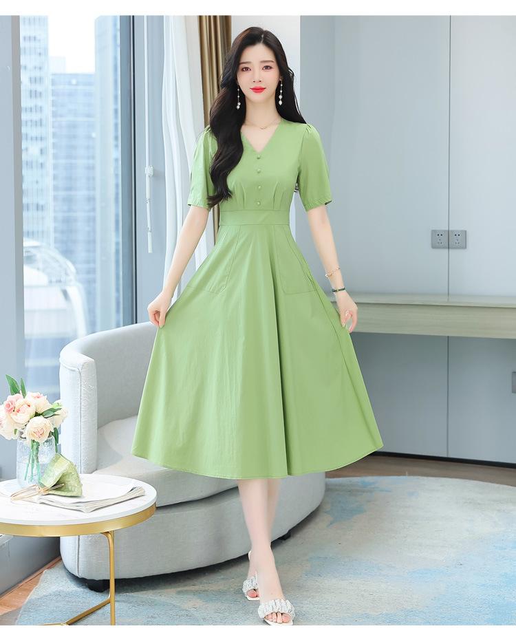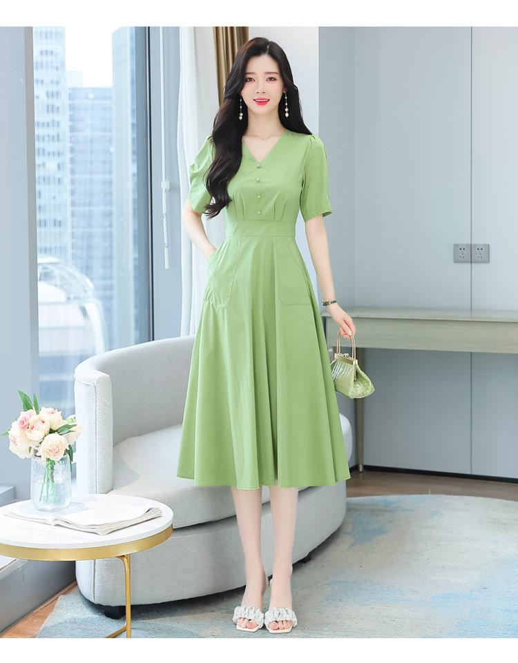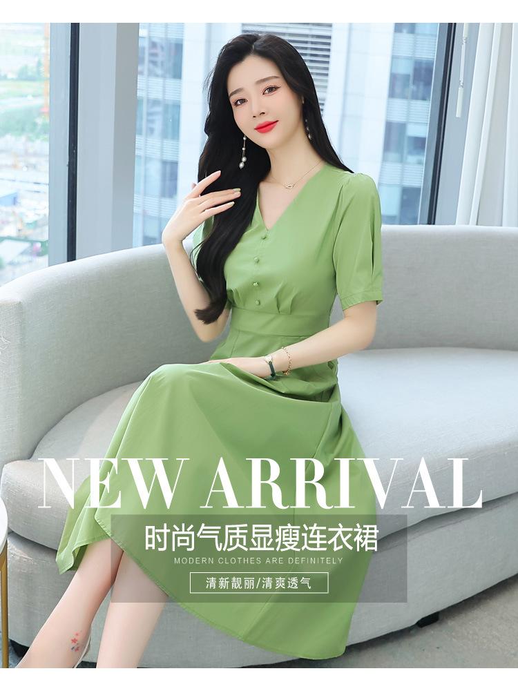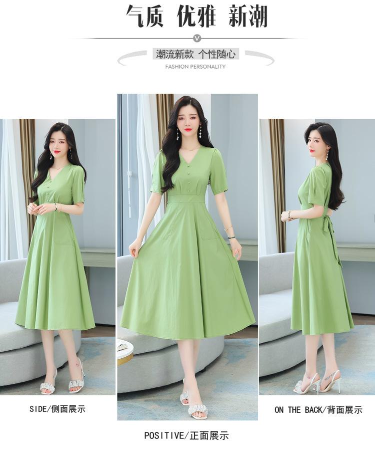 Foto Real de Vestido Retro Francés Blanco Verde Aguacate Primavera y Verano Dulce Cintura Cuello en V Falda Larga Línea A