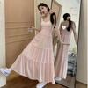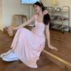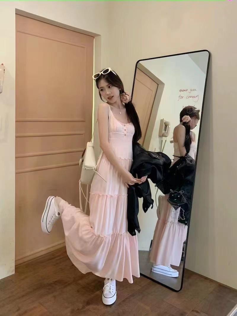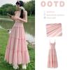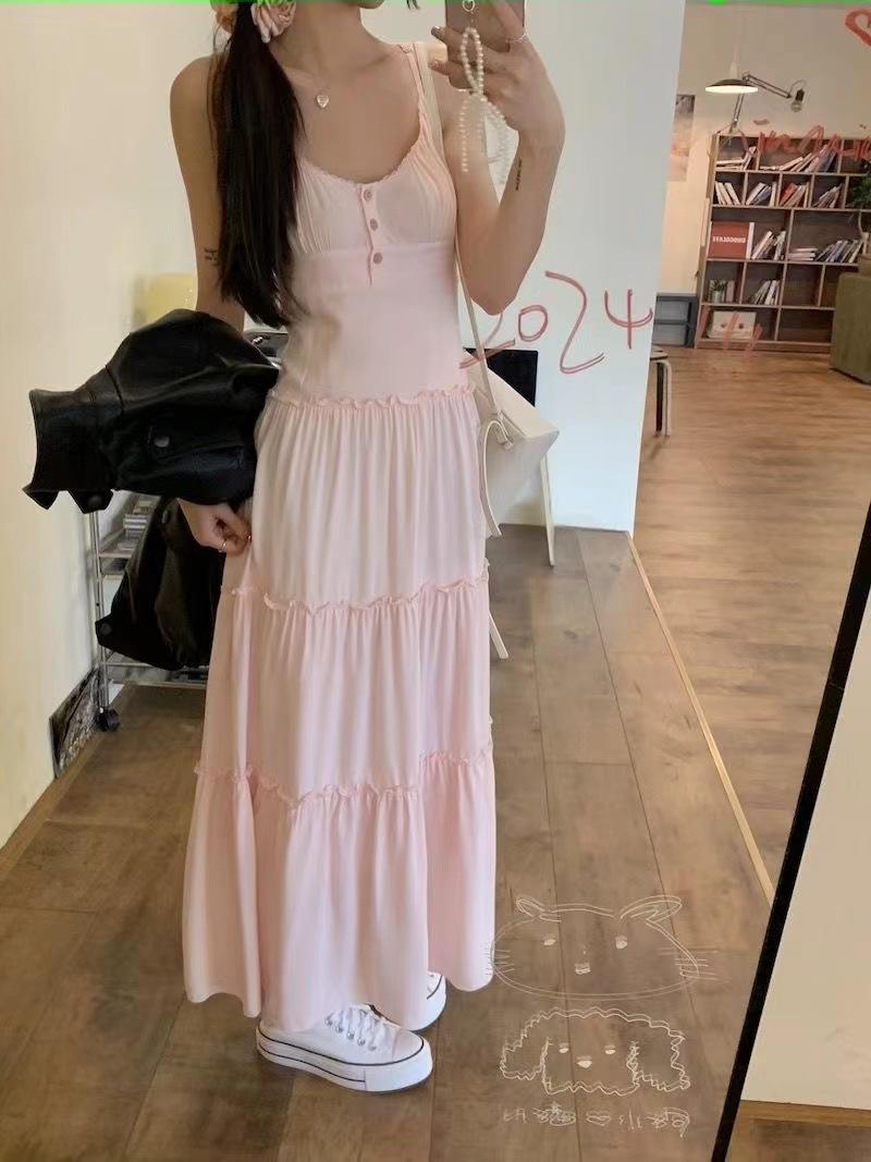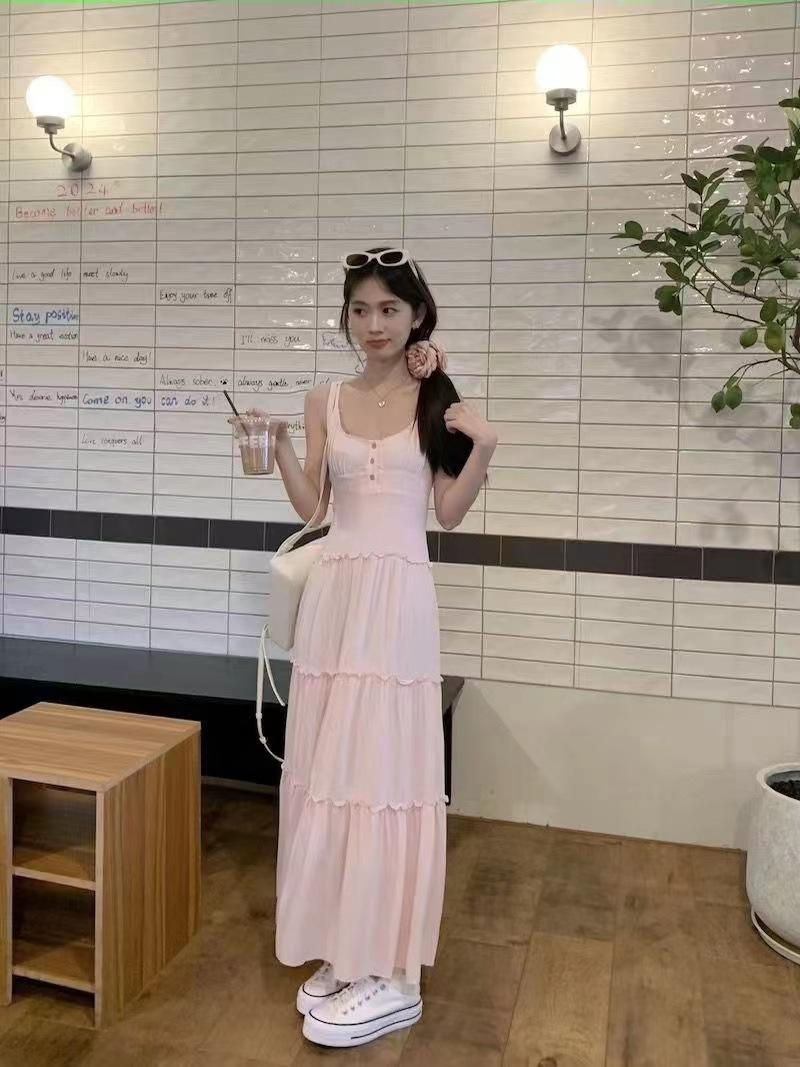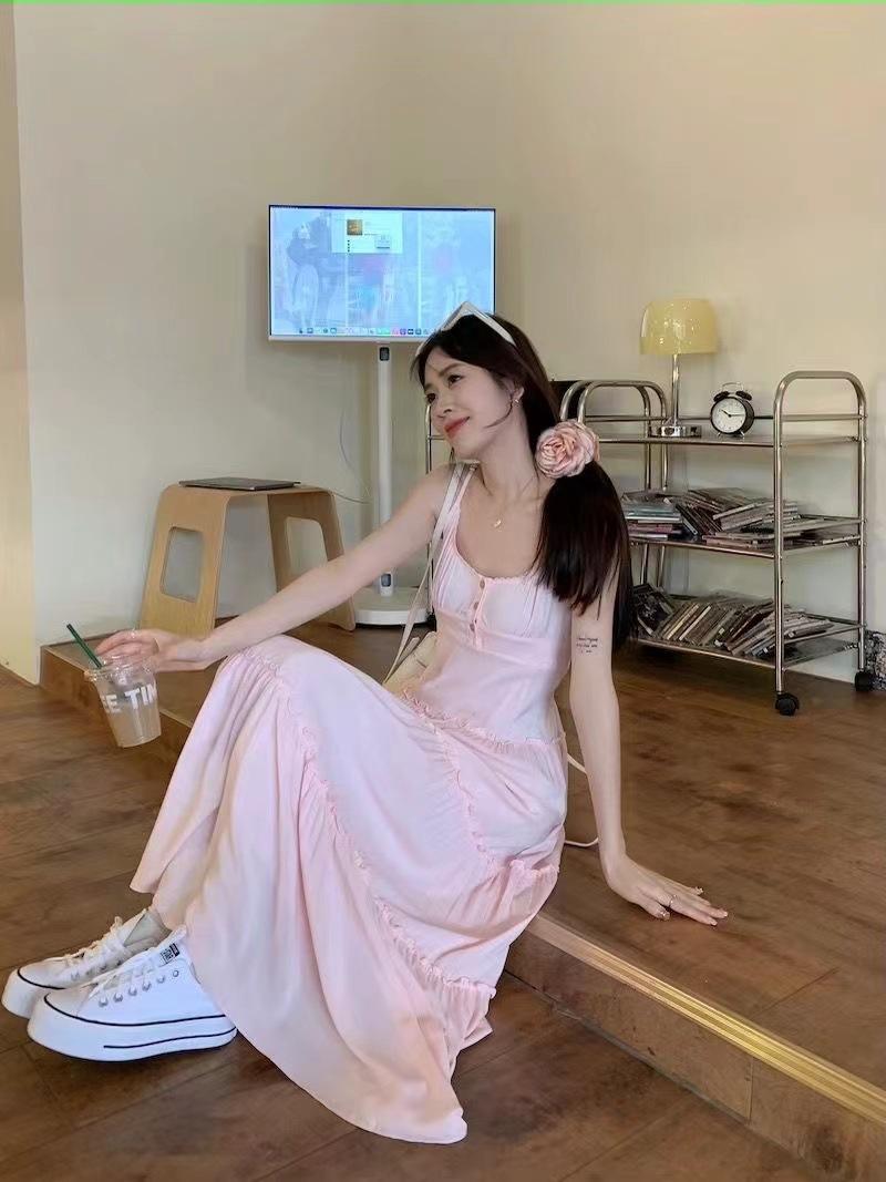 Versión Coreana 2025 Nuevo Diseño Vestido Estilo Japonés para Mujer Reductor de Edad Delgado Elegante Rosa Sin Mangas Vestido Largo