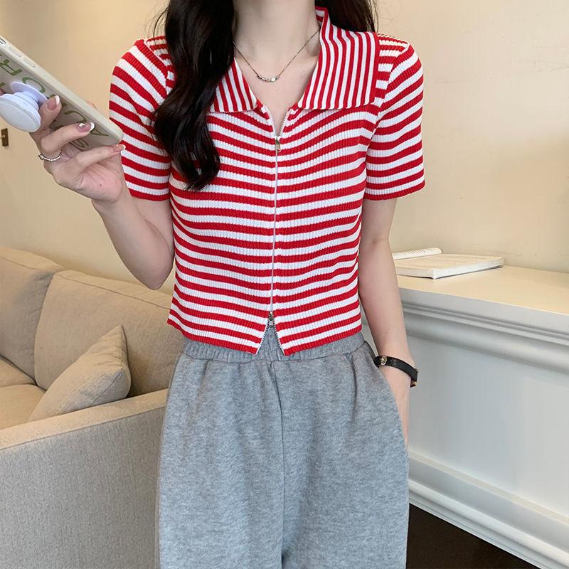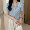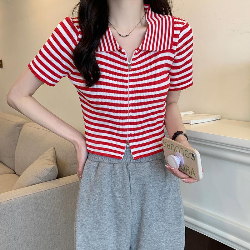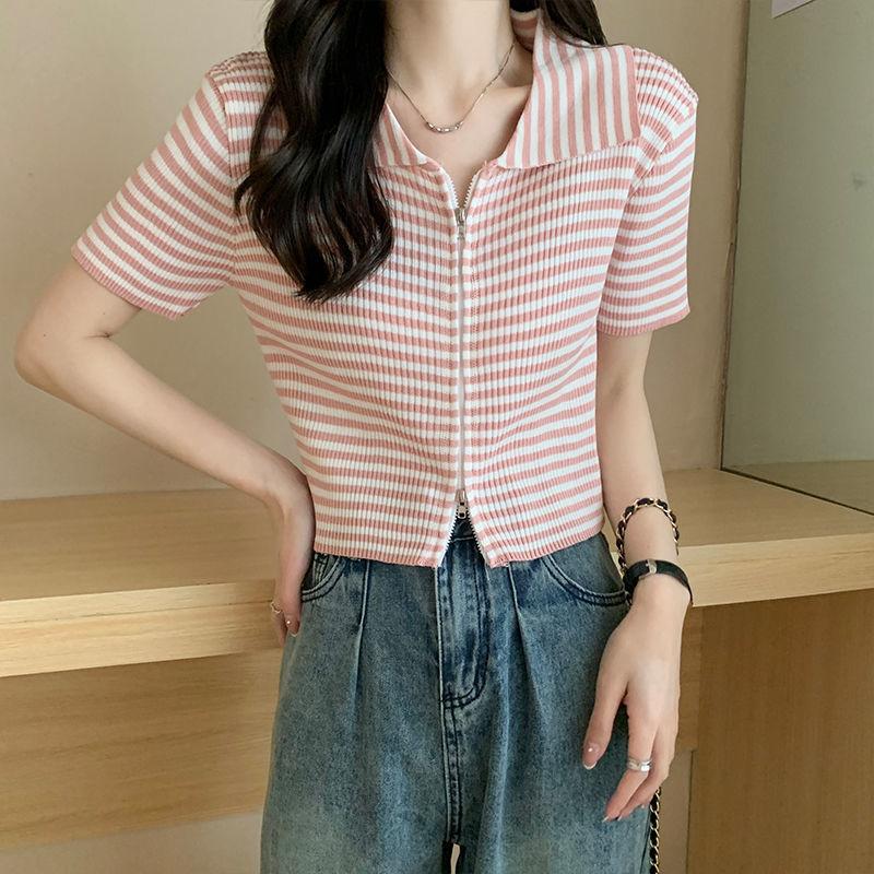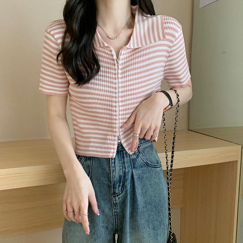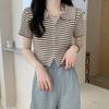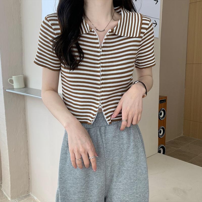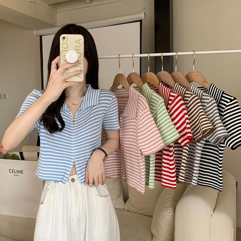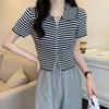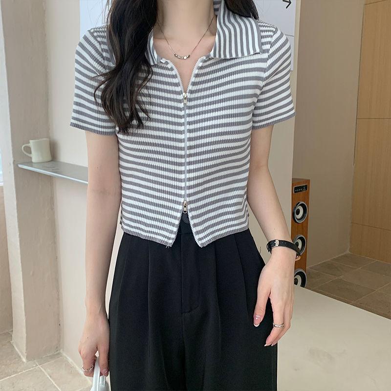 2024 Verano nuevo diseño de estilo coreano para mujer polo a rayas camiseta de manga corta nicho corte ajustado top corto