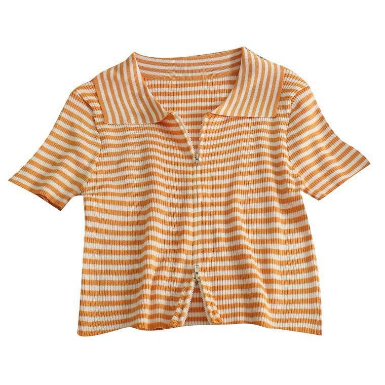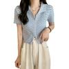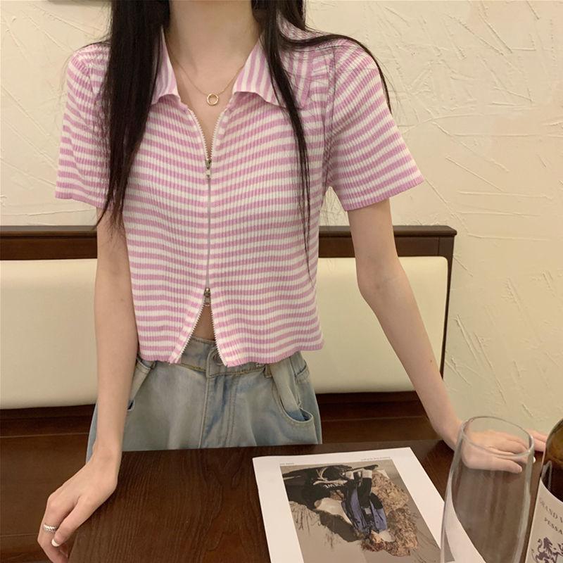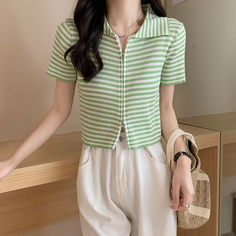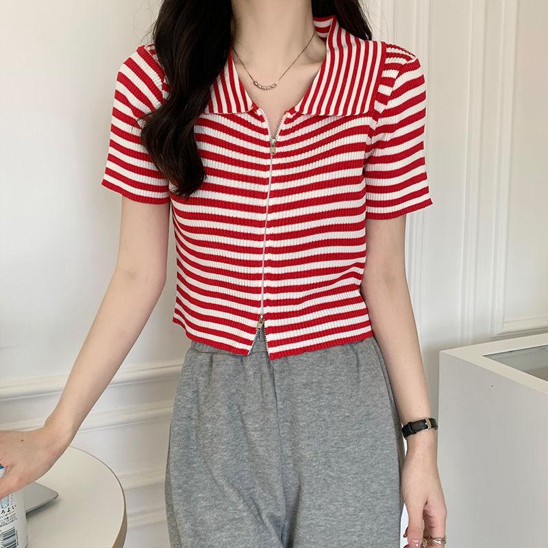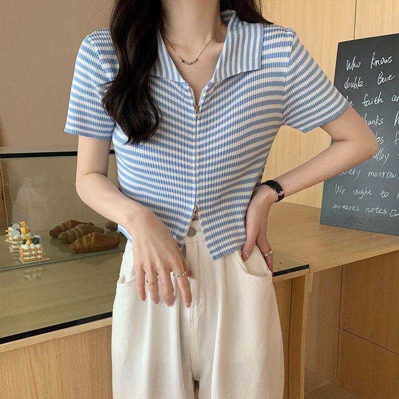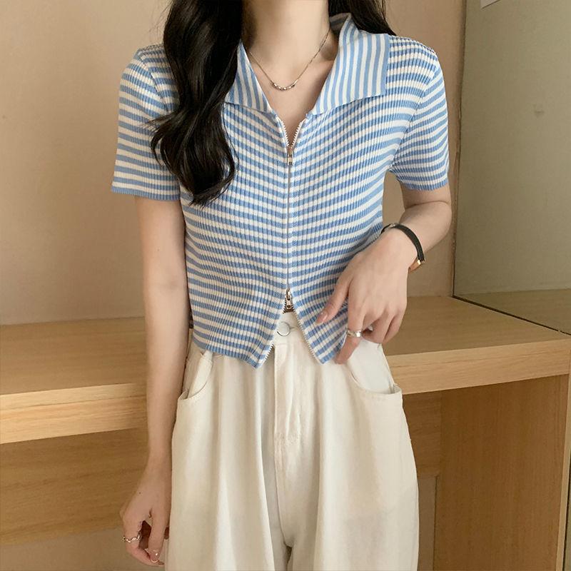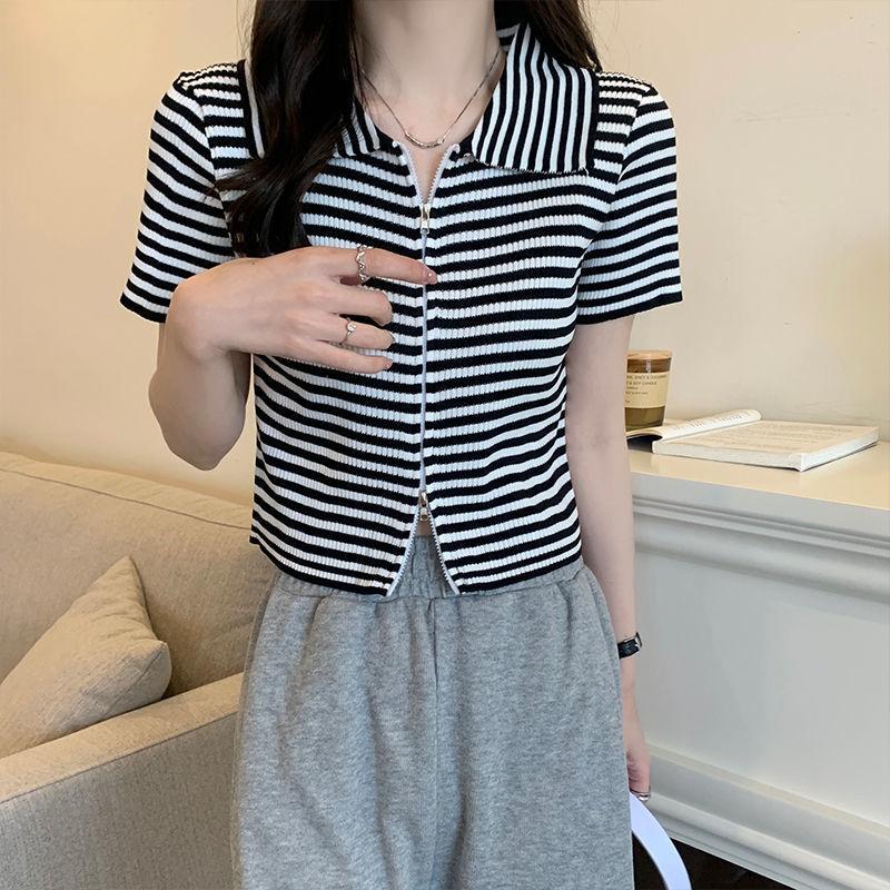 2024 Verano nuevo diseño de estilo coreano para mujer polo a rayas camiseta de manga corta nicho corte ajustado top corto