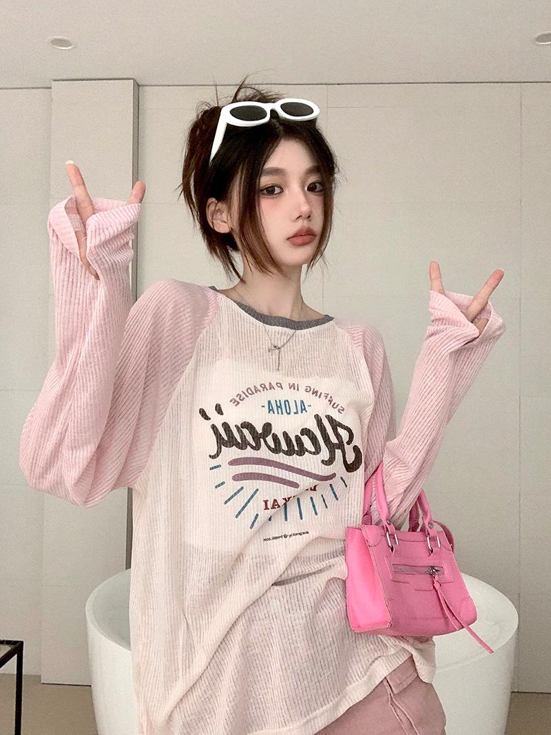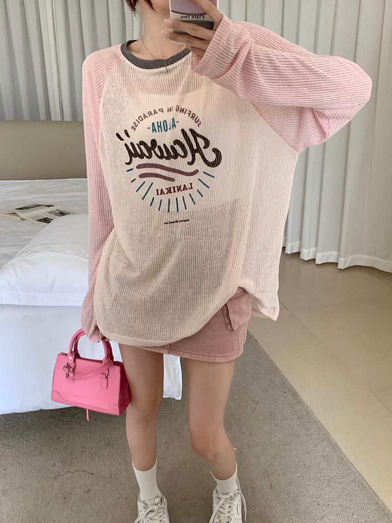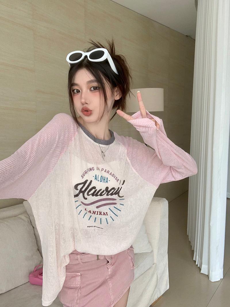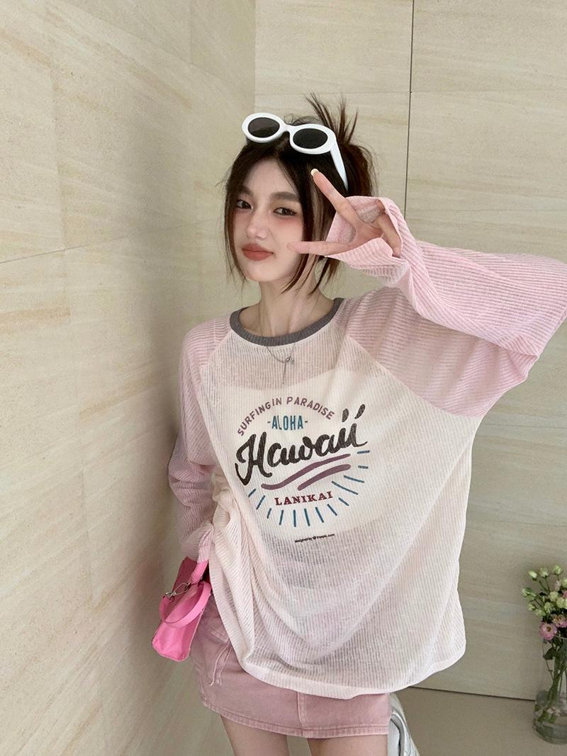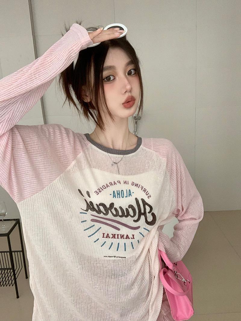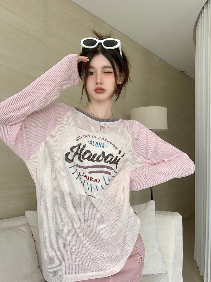 Camiseta de Manga Larga con Manga Raglán y Protección Solar para Mujer, Verano Nuevo Estilo Coreano con Estampado de Letras, Color en Contraste, Largo Medio, Combinable con Todo, Top Moderno
