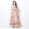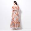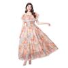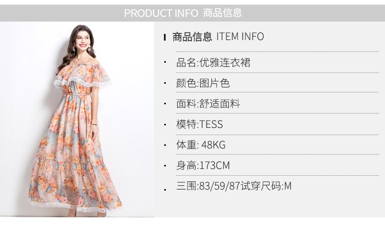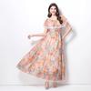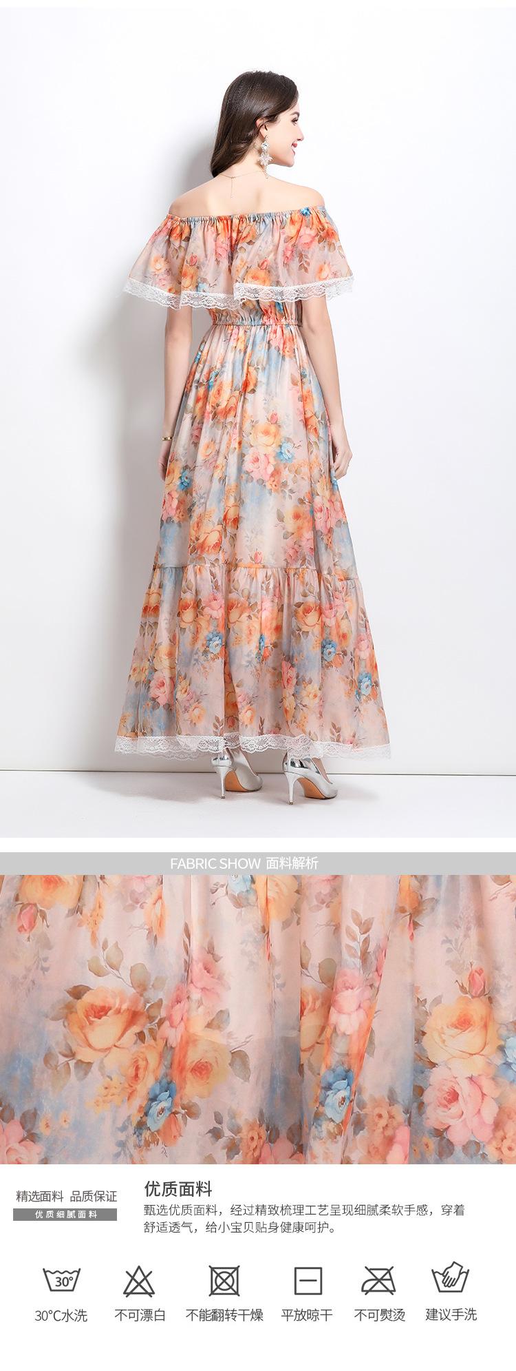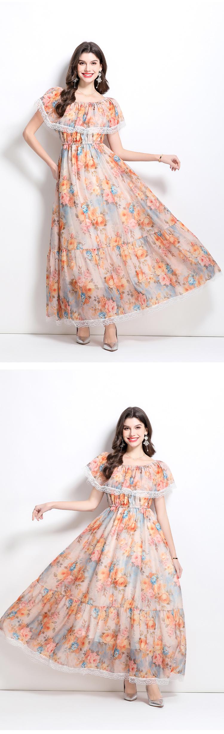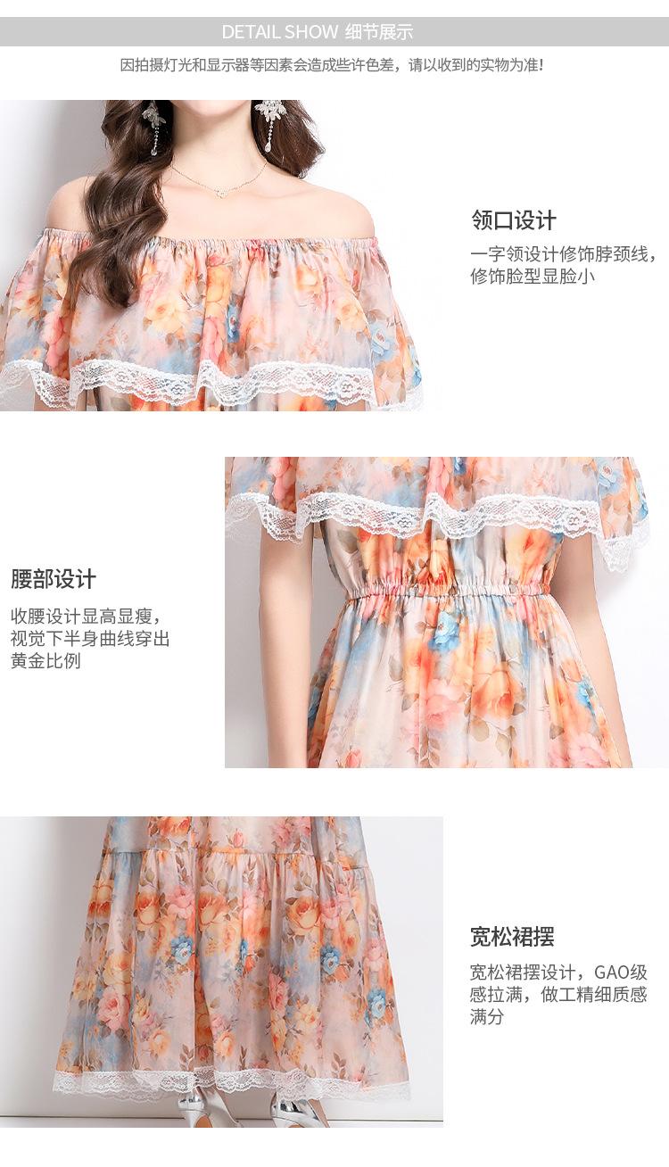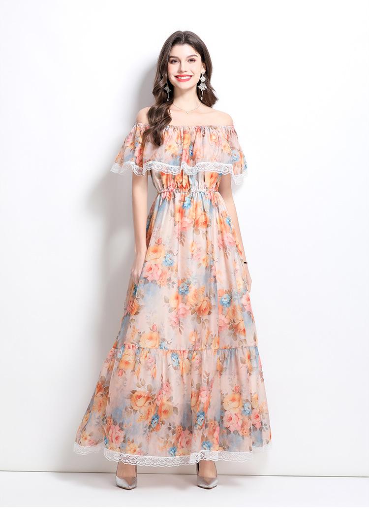 Vestido de Playa de Talla Grande Europeo y Americano 2025 Verano Nuevo Vacaciones Encaje Costura Hombro Estampado Vestido Largo