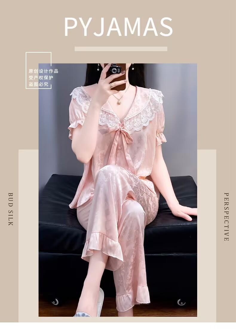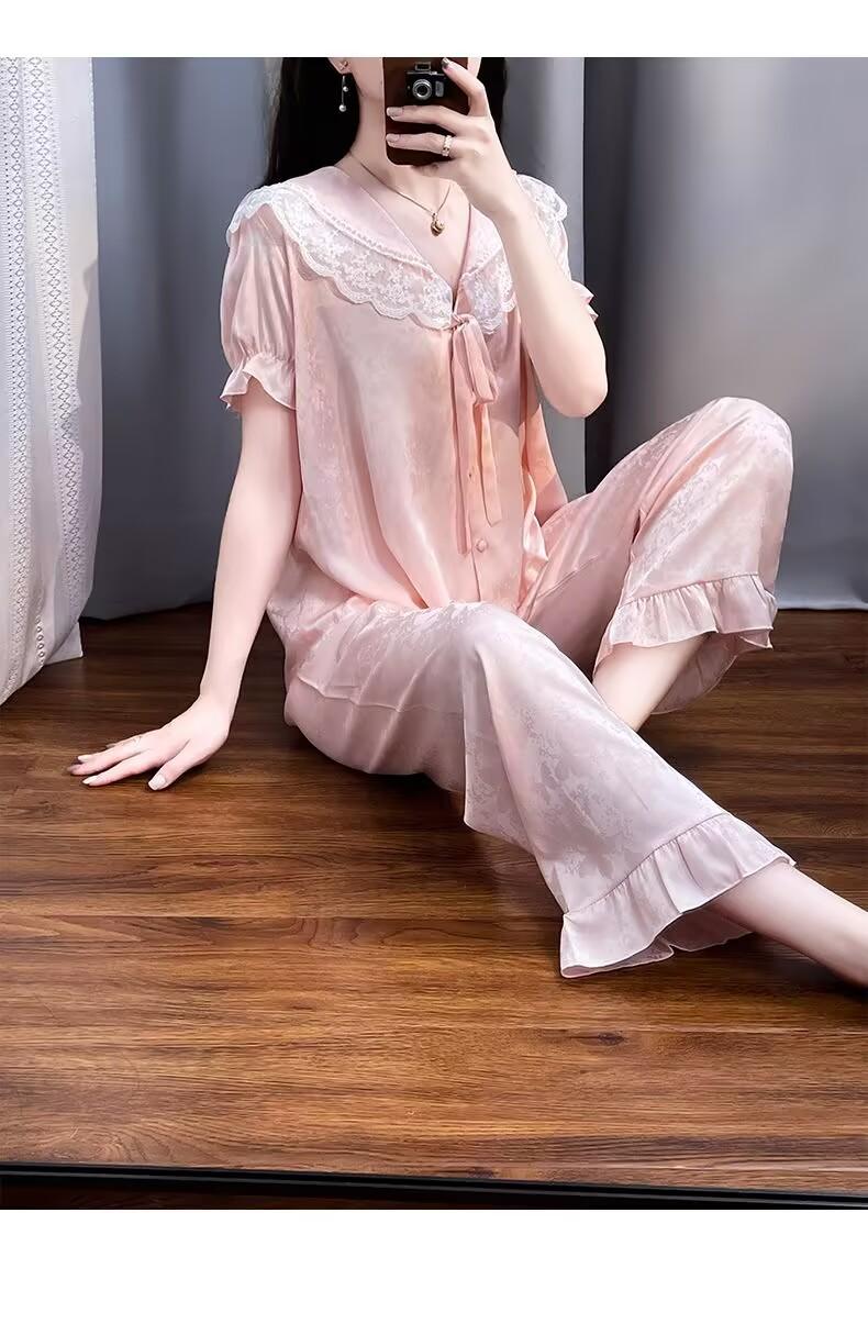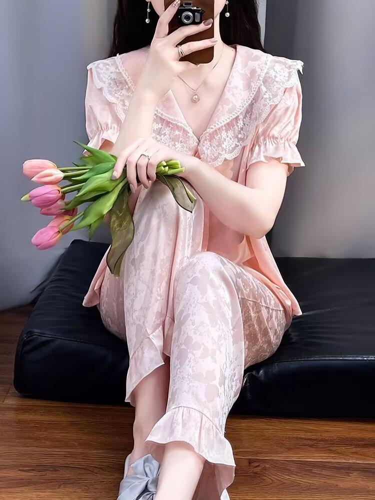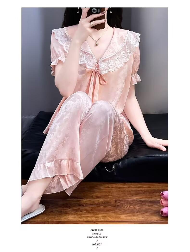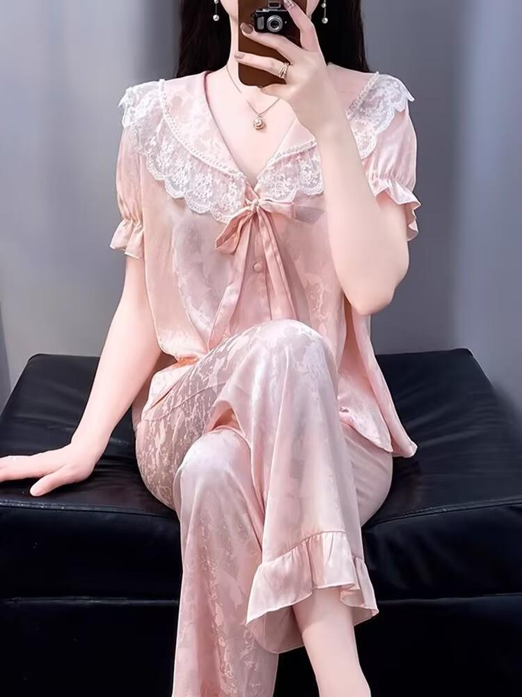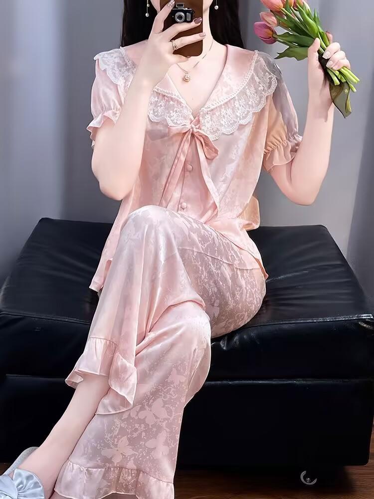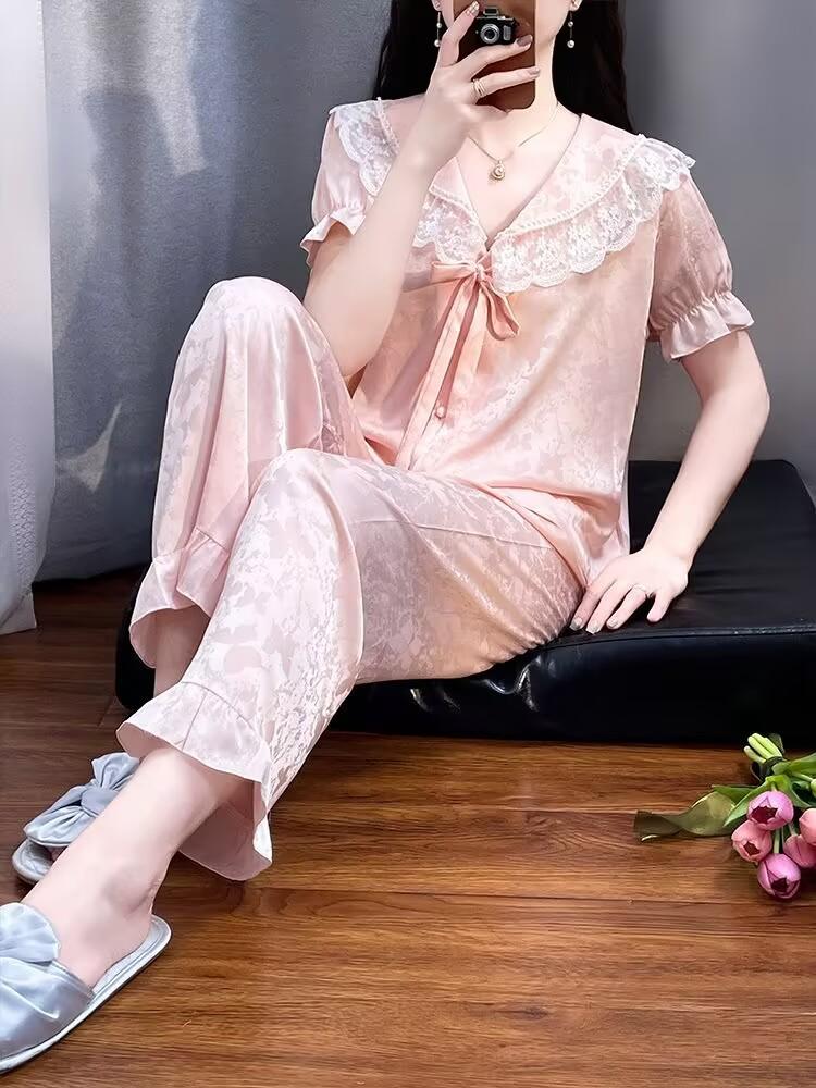 2025 Nuevo Pijama de Encaje Estilo Palacio Francés Seda de Hielo Jacquard para Mujer Verano Manga Corta Pantalones Set Ropa de Casa