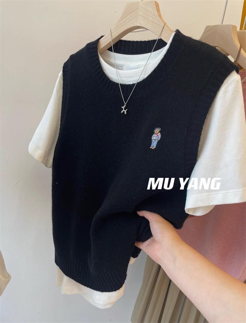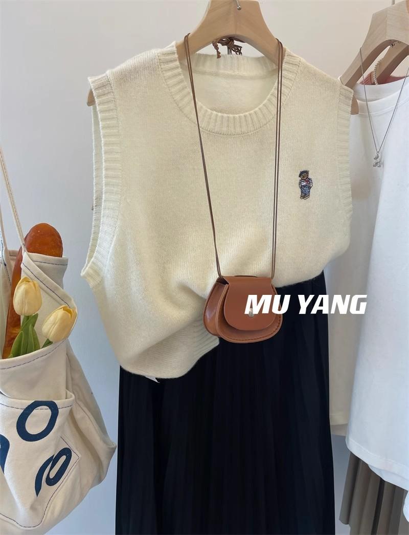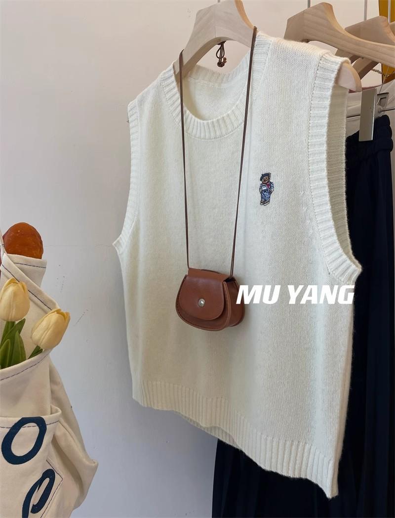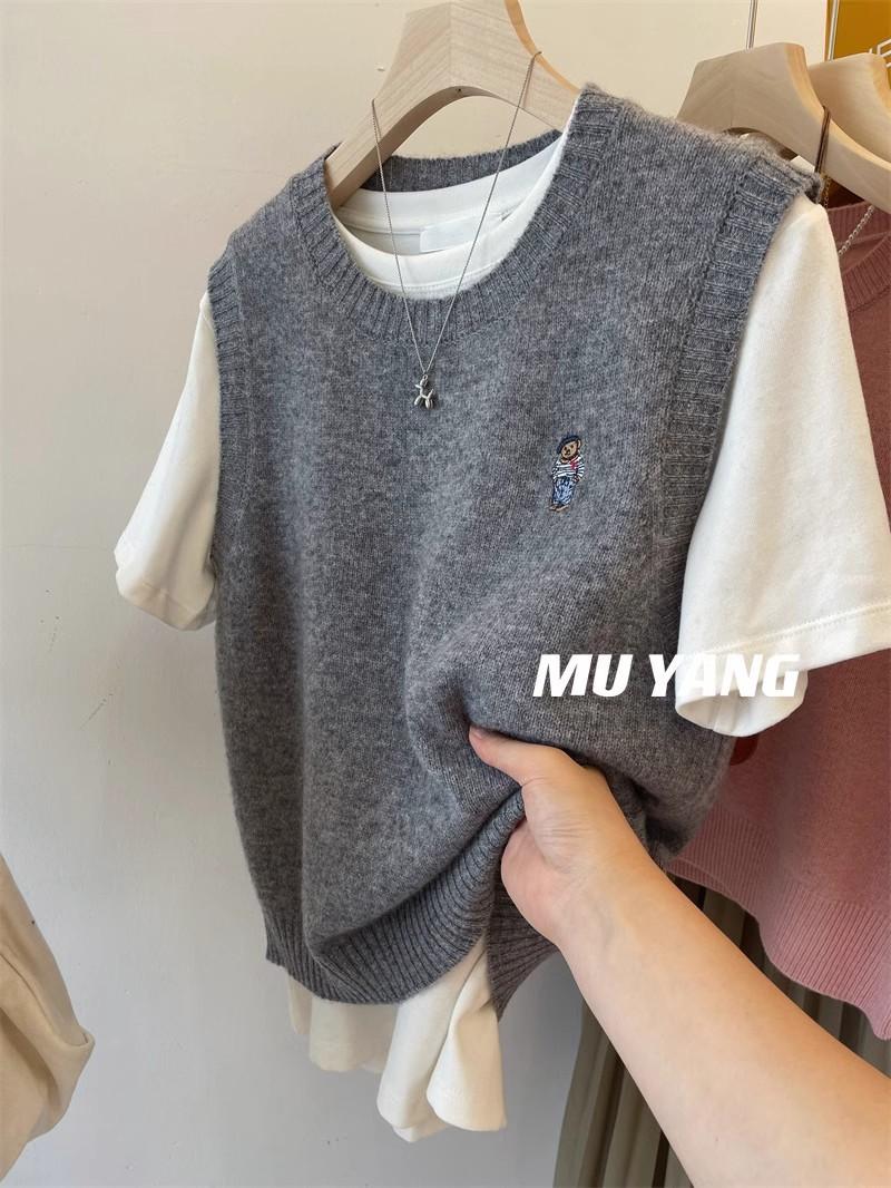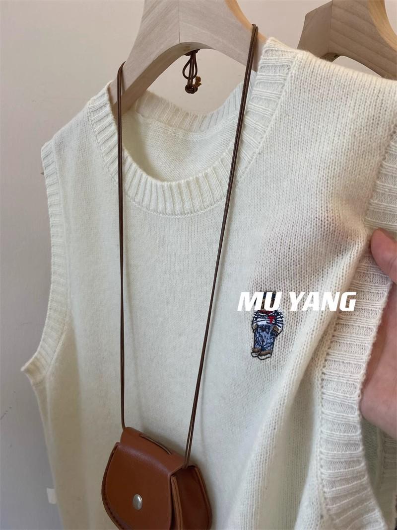 ¡Fin de semana de ocio! Chaleco de lana de cuello redondo con oso bordado para mujer, chaleco de punto apilado suave y cómodo