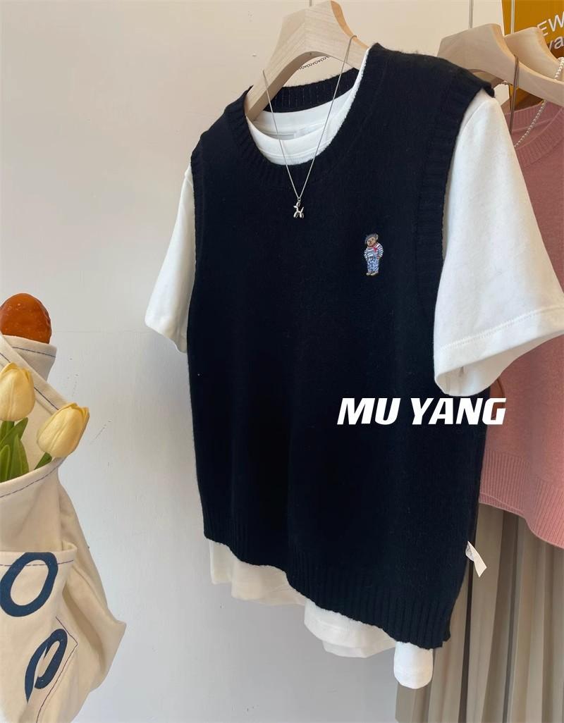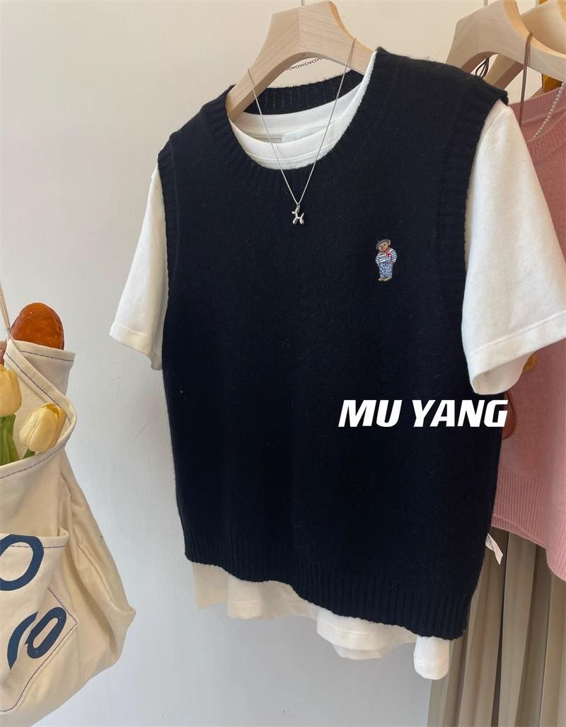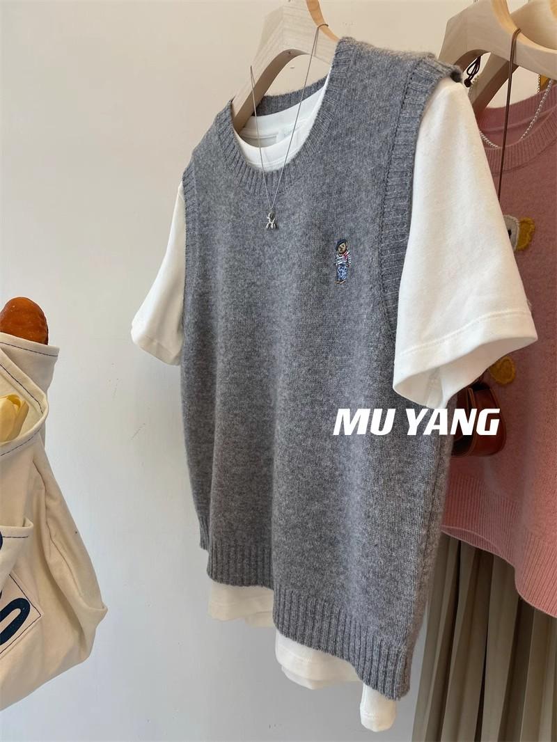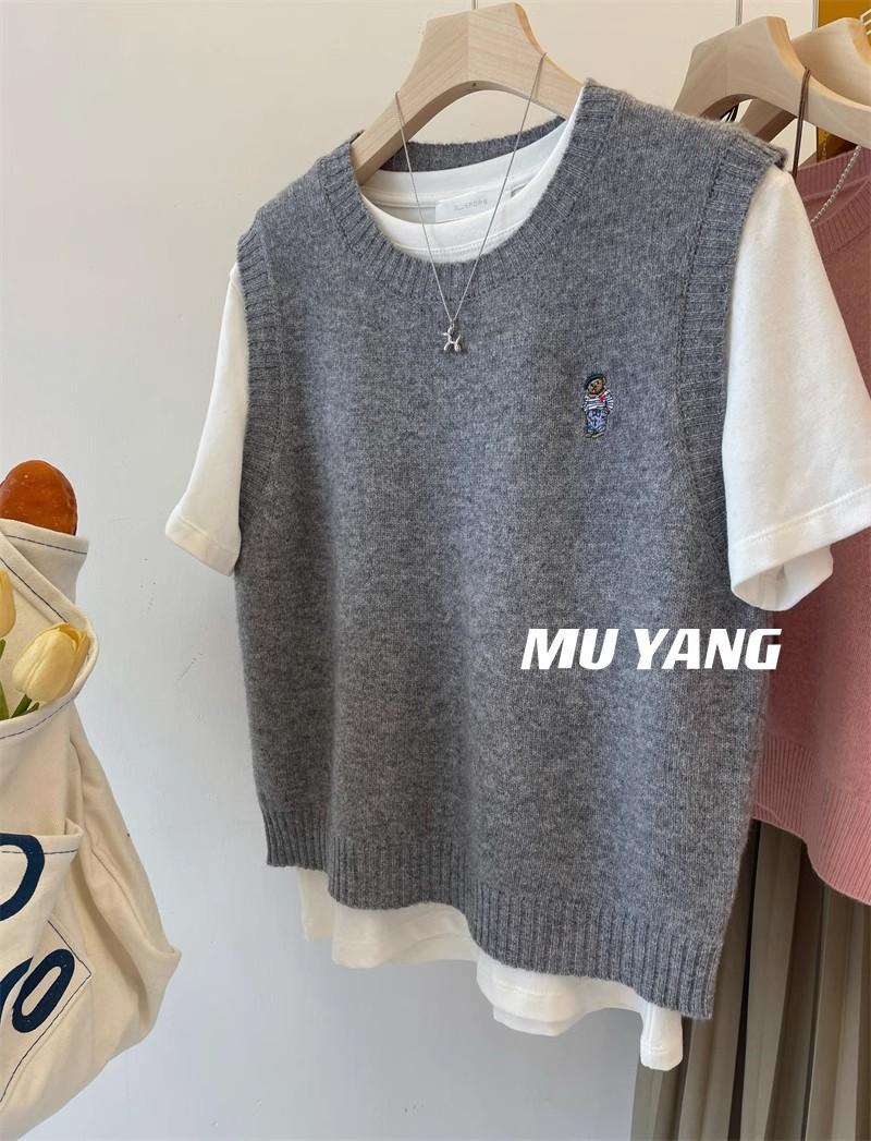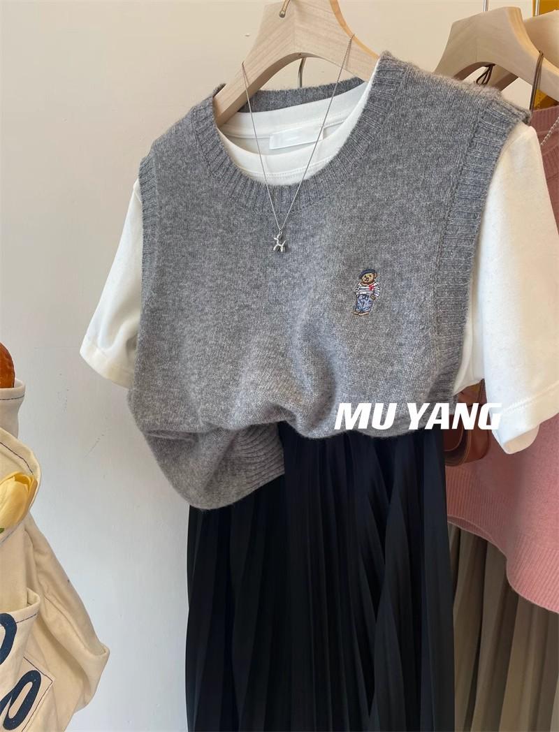 ¡Fin de semana de ocio! Chaleco de lana de cuello redondo con oso bordado para mujer, chaleco de punto apilado suave y cómodo