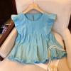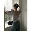 2025 Nuevo Estilo de Verano Estilo Francés Fresco y Dulce Cuadros Azules Manga Abullonada Manga Corta Encaje Cuello Redondo Camisa para Mujer