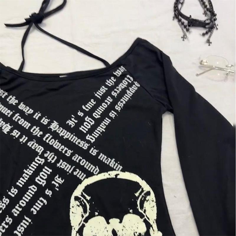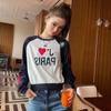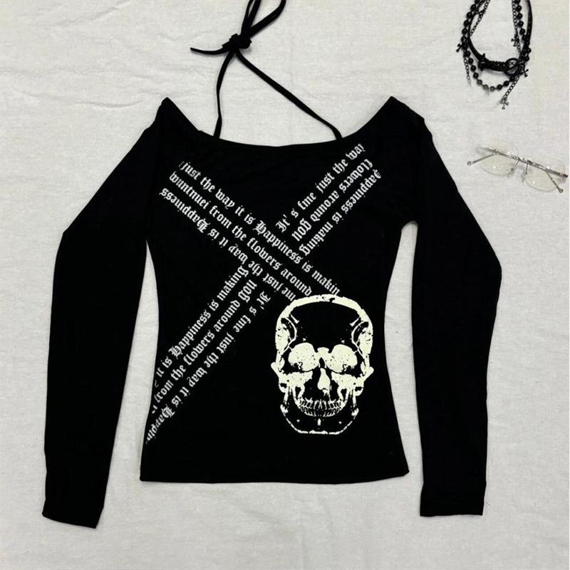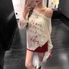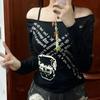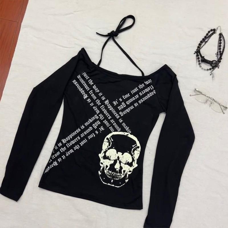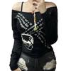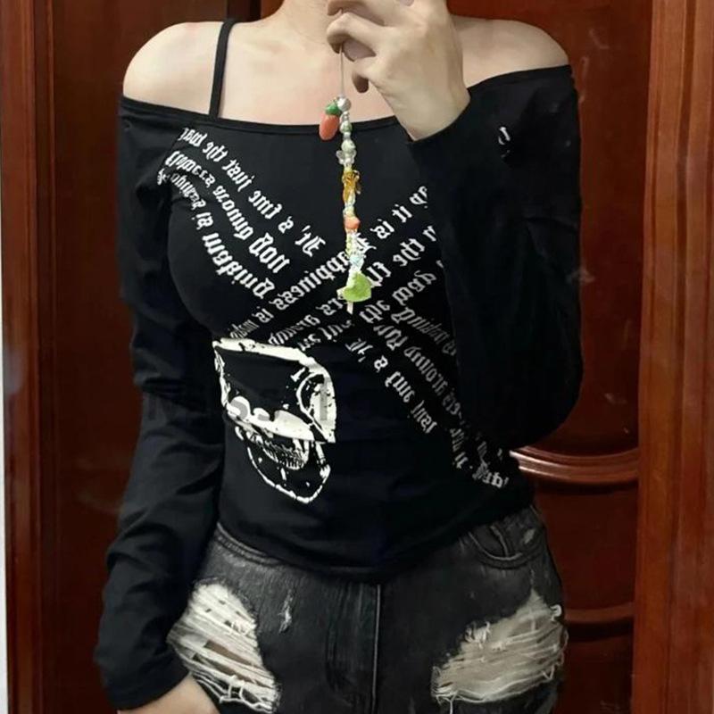 Camiseta de Manga Larga con Estampado de Letras de Diseño Nuevo de Primavera Transfronterizo Sexy Trendy Casual con Hombros Descubiertos Top Versátil