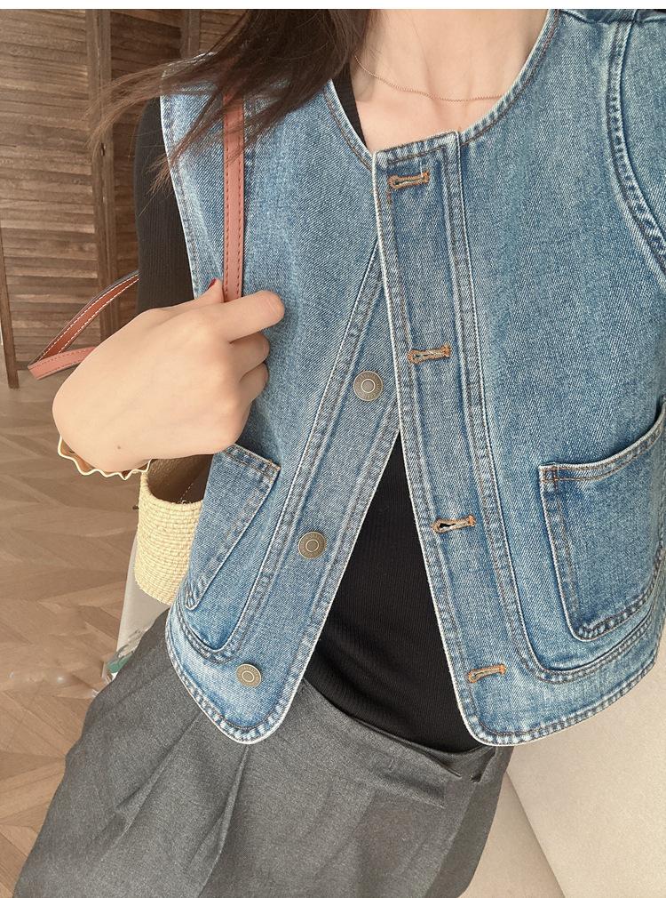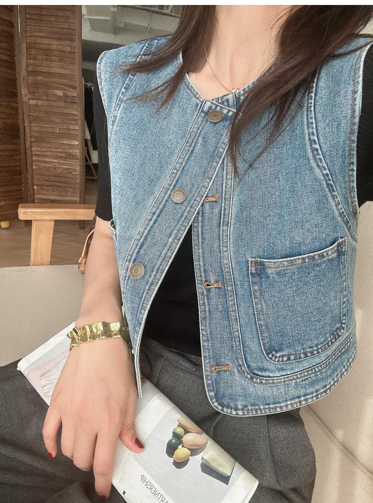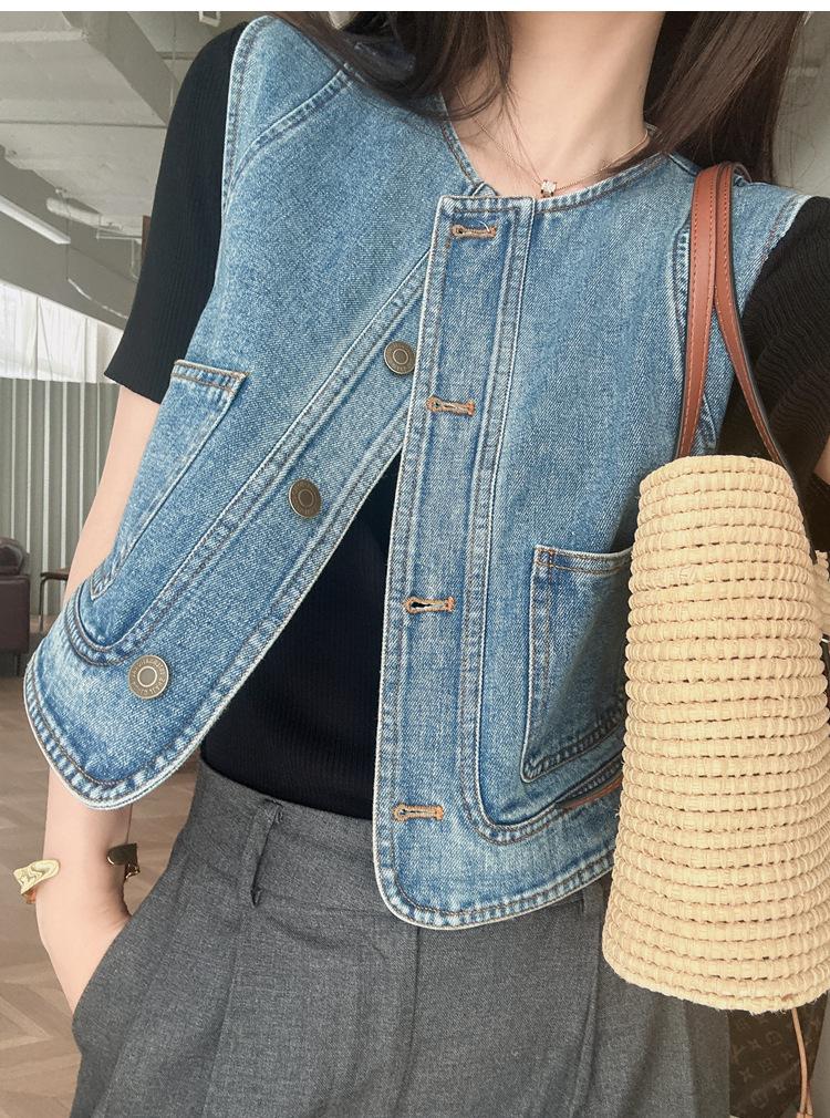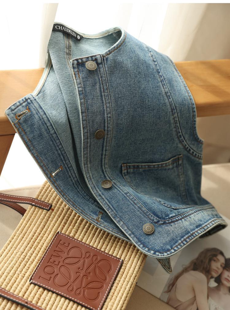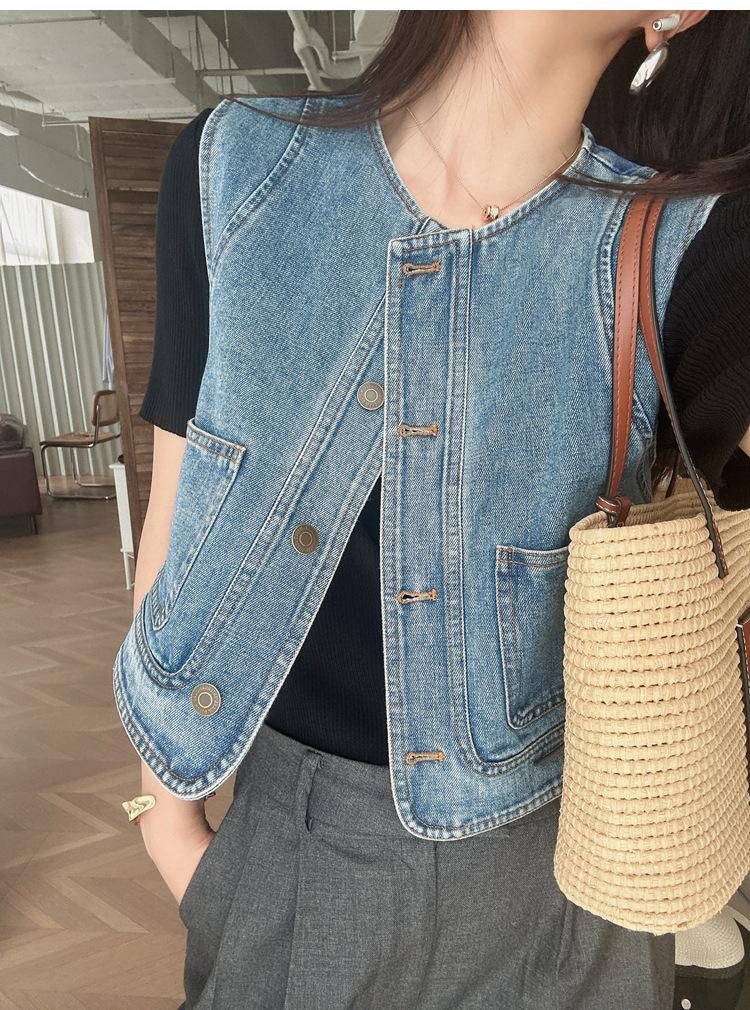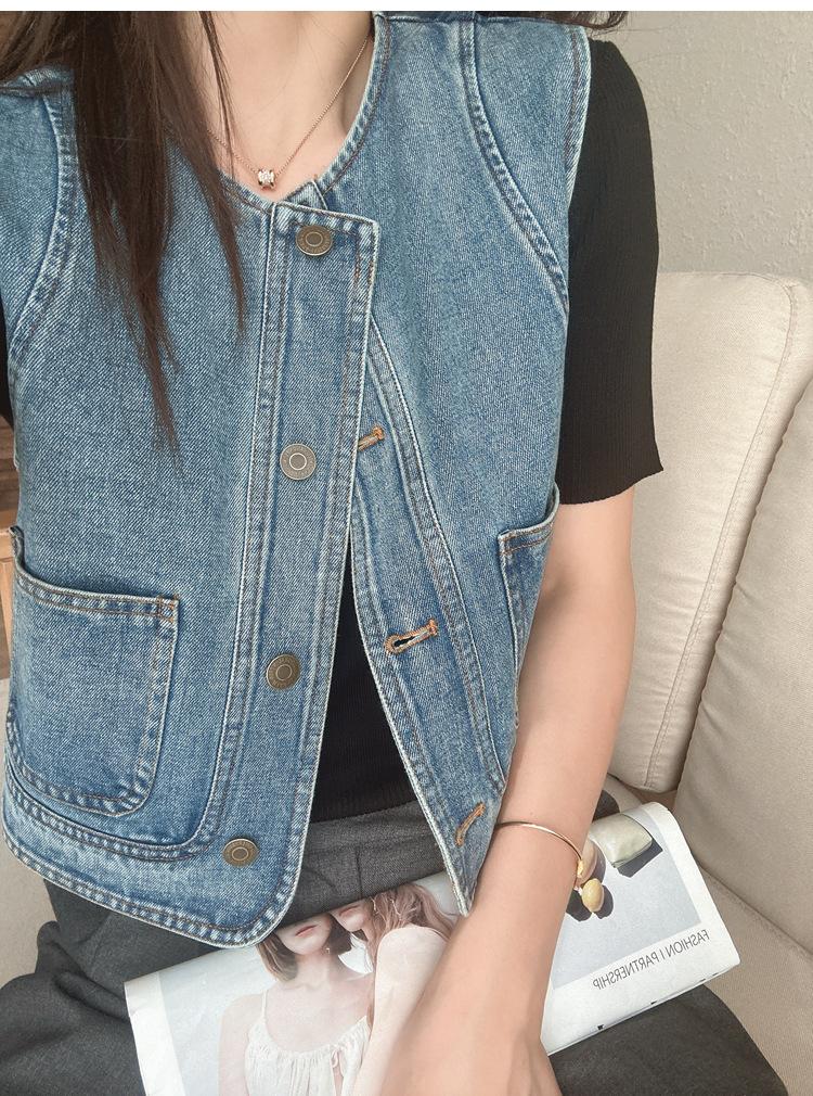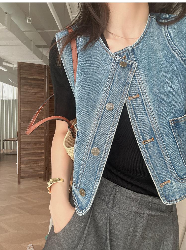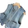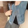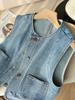 Chaleco de mezclilla en capas versátil y moderno para mujer Primavera Verano Holgado Corto Petite Chaqueta sin mangas Top casual