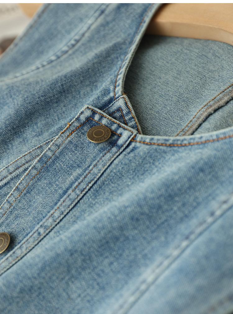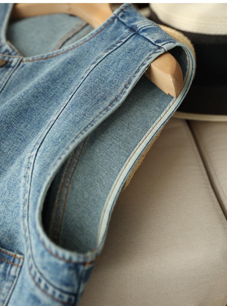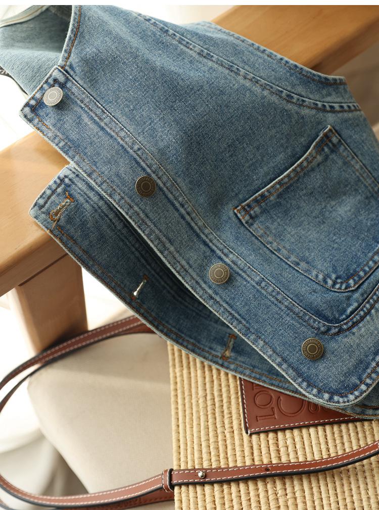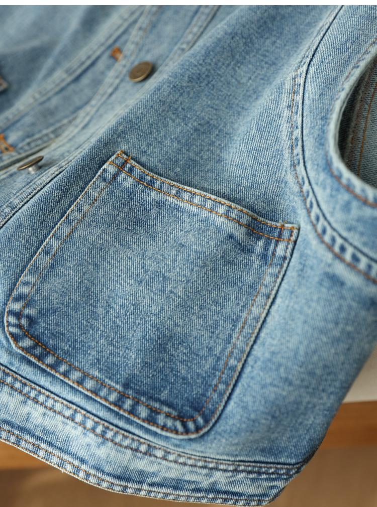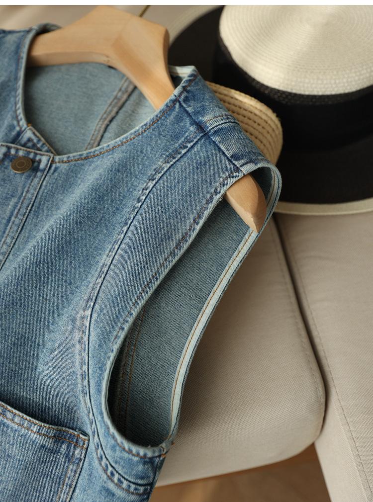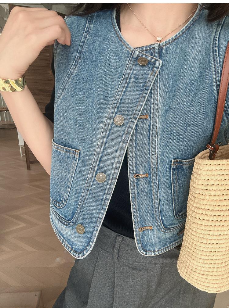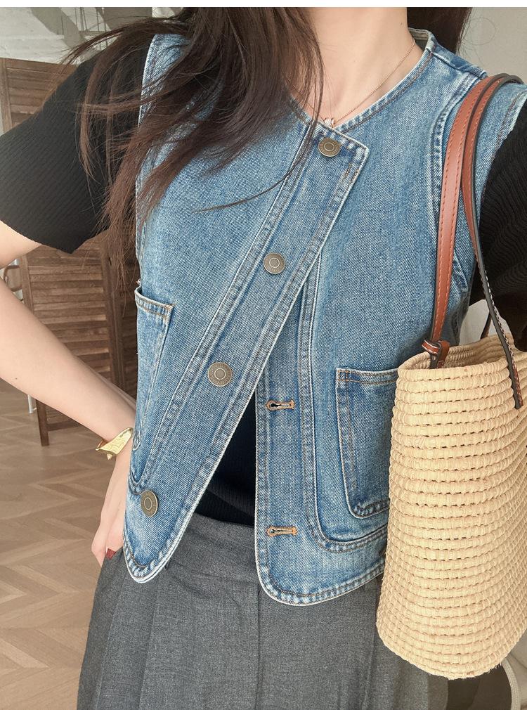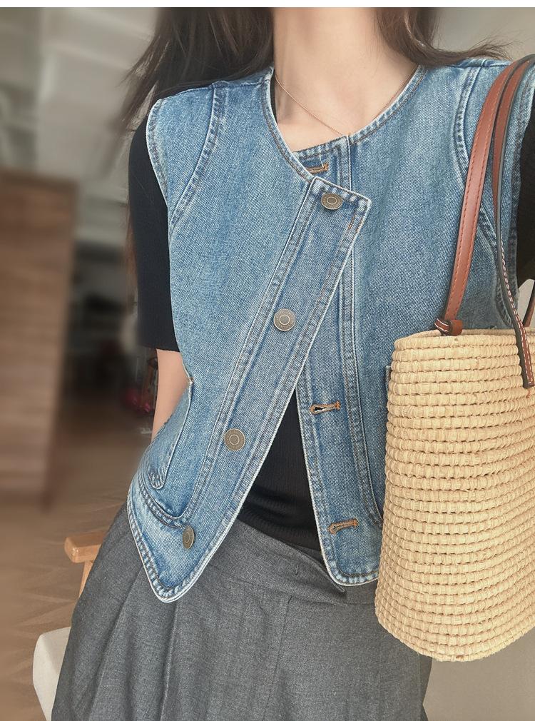 Chaleco de mezclilla en capas versátil y moderno para mujer Primavera Verano Holgado Corto Petite Chaqueta sin mangas Top casual