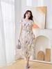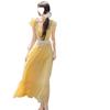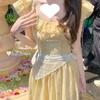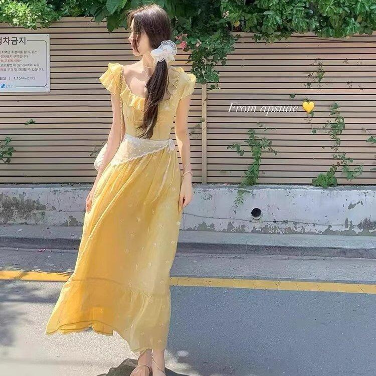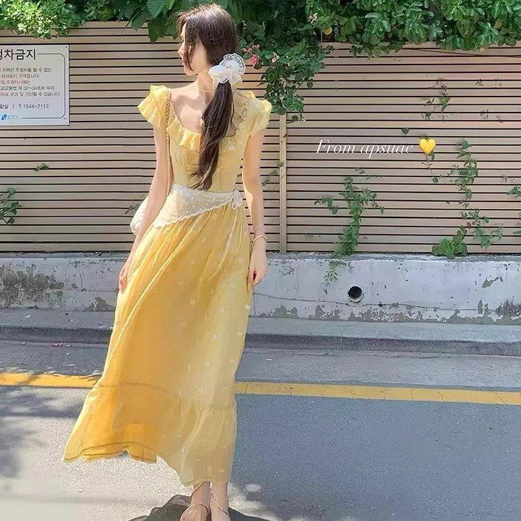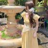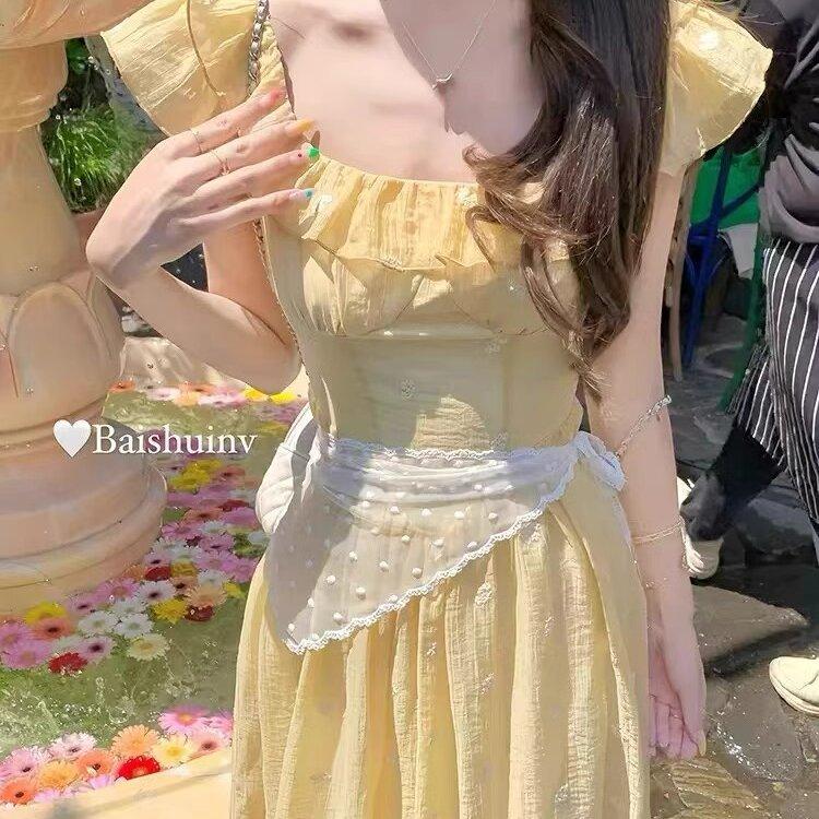 [con Bufanda de Seda] Vestido Amarillo Crema Estilo Dulce Francés de Mangas Cortas con Cuello Cuadrado para Mujer con Diseño Nicho y Cintura Larga