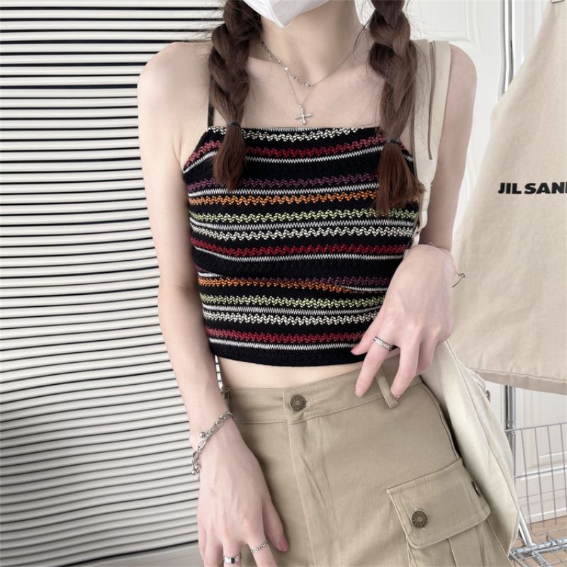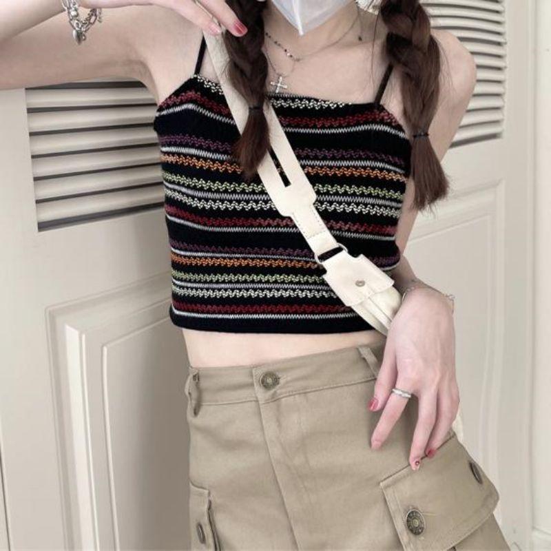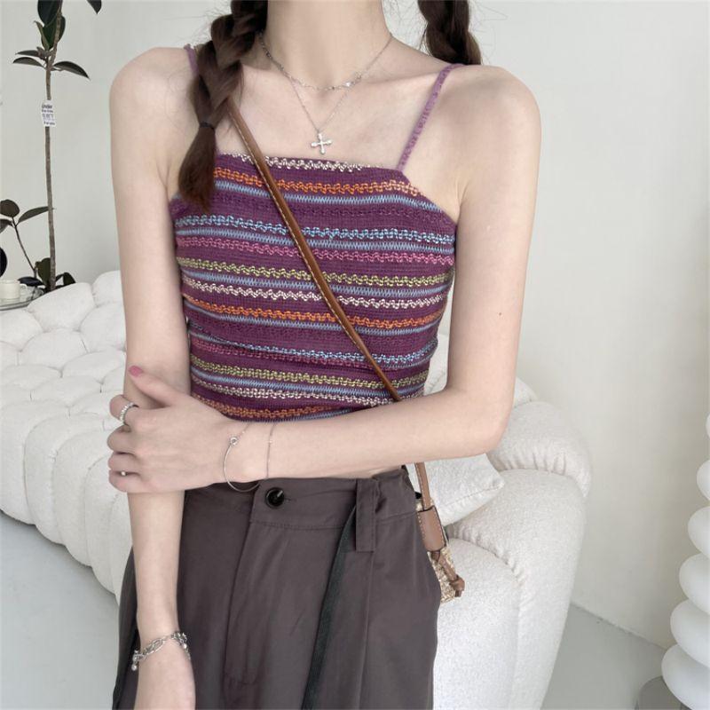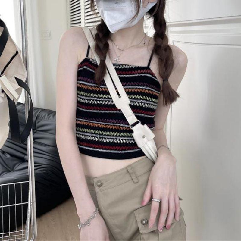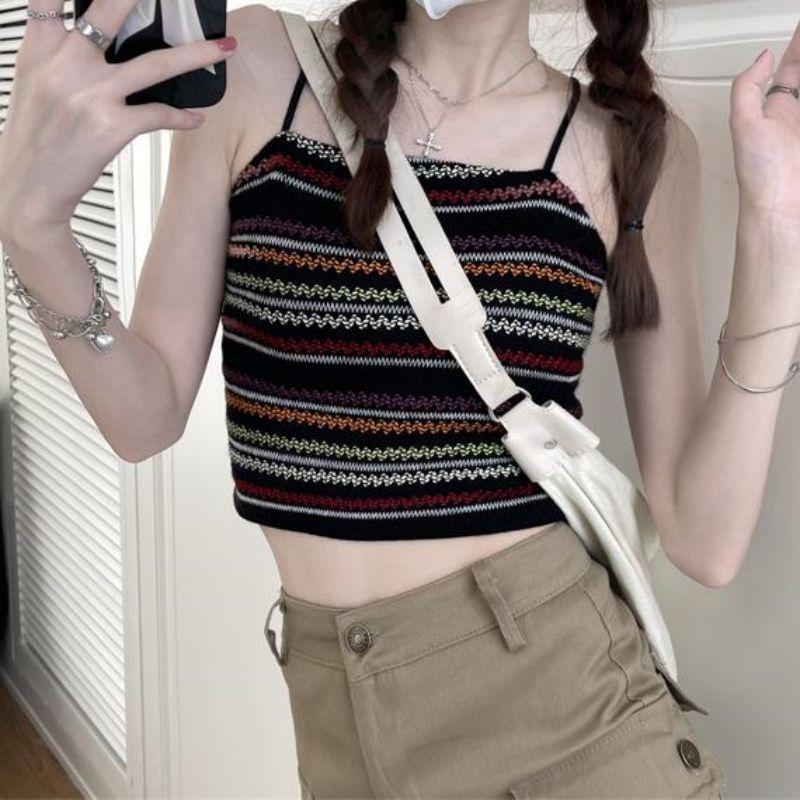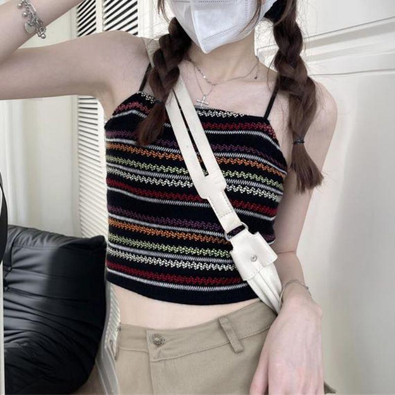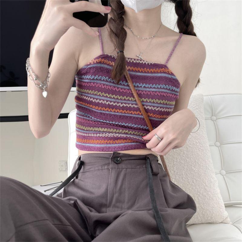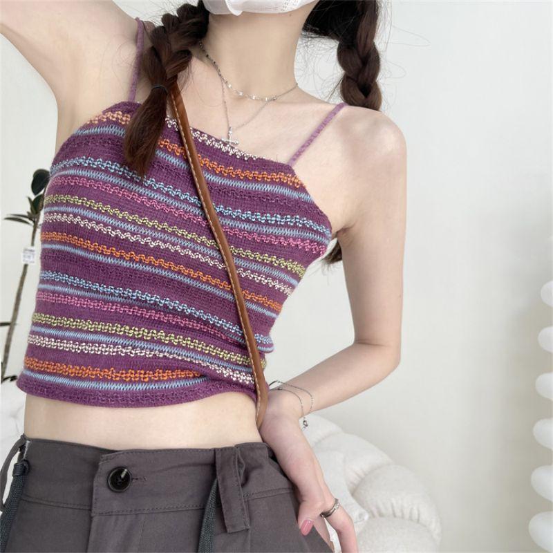 Verano 2023 nuevo tejido pequeño sling ropa de chica hot chaleco a rayas de colores ropa exterior top corto sexy para mujer