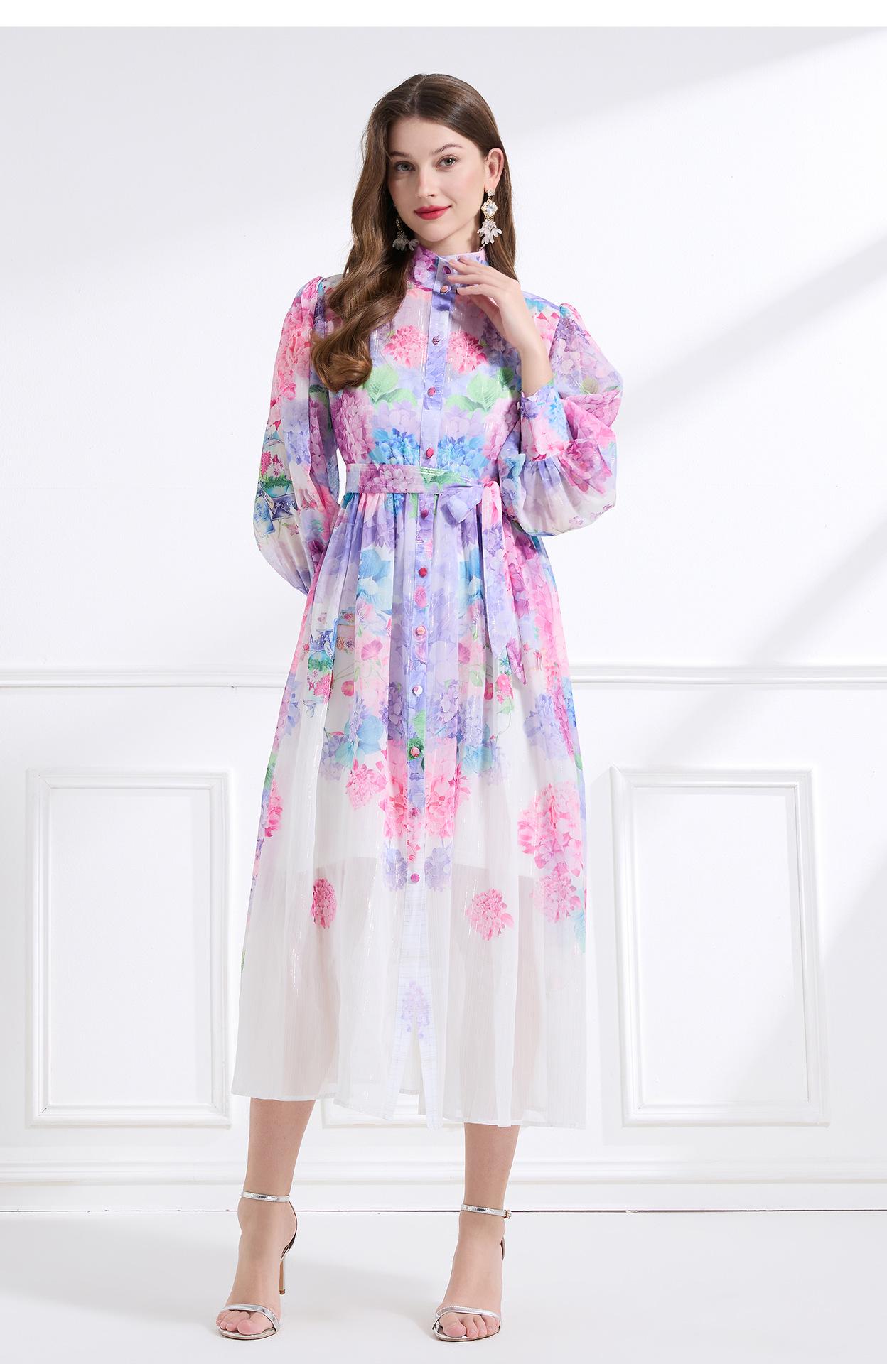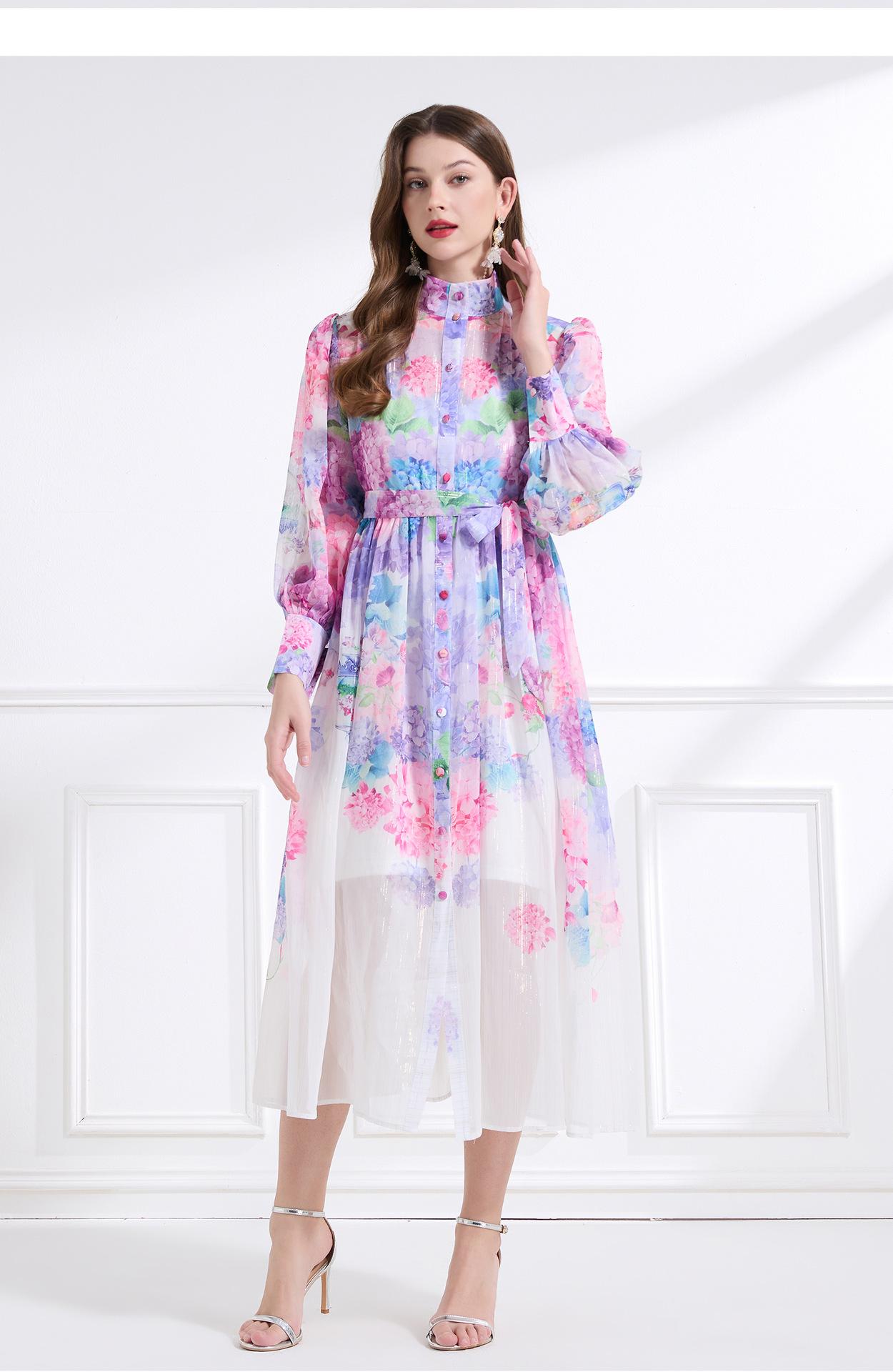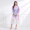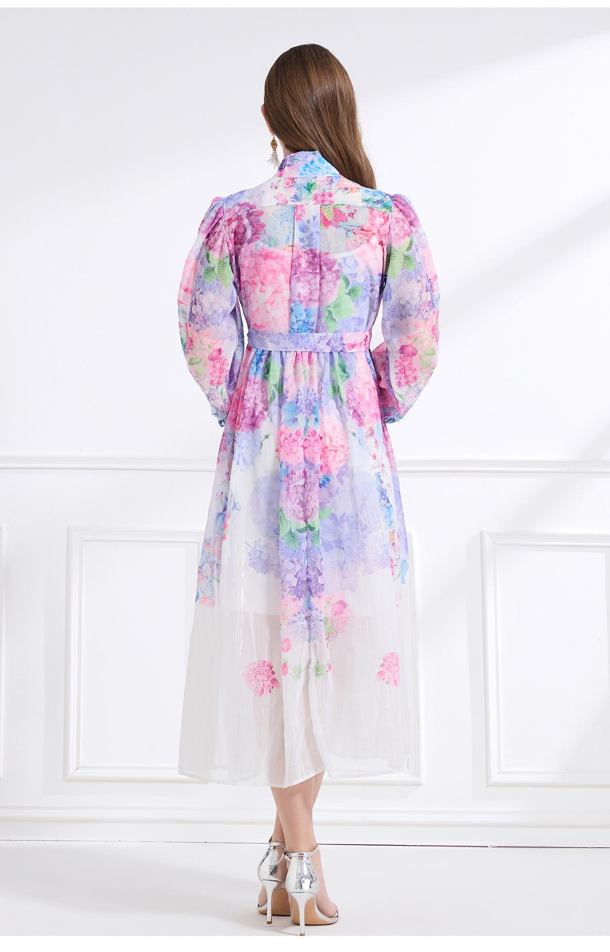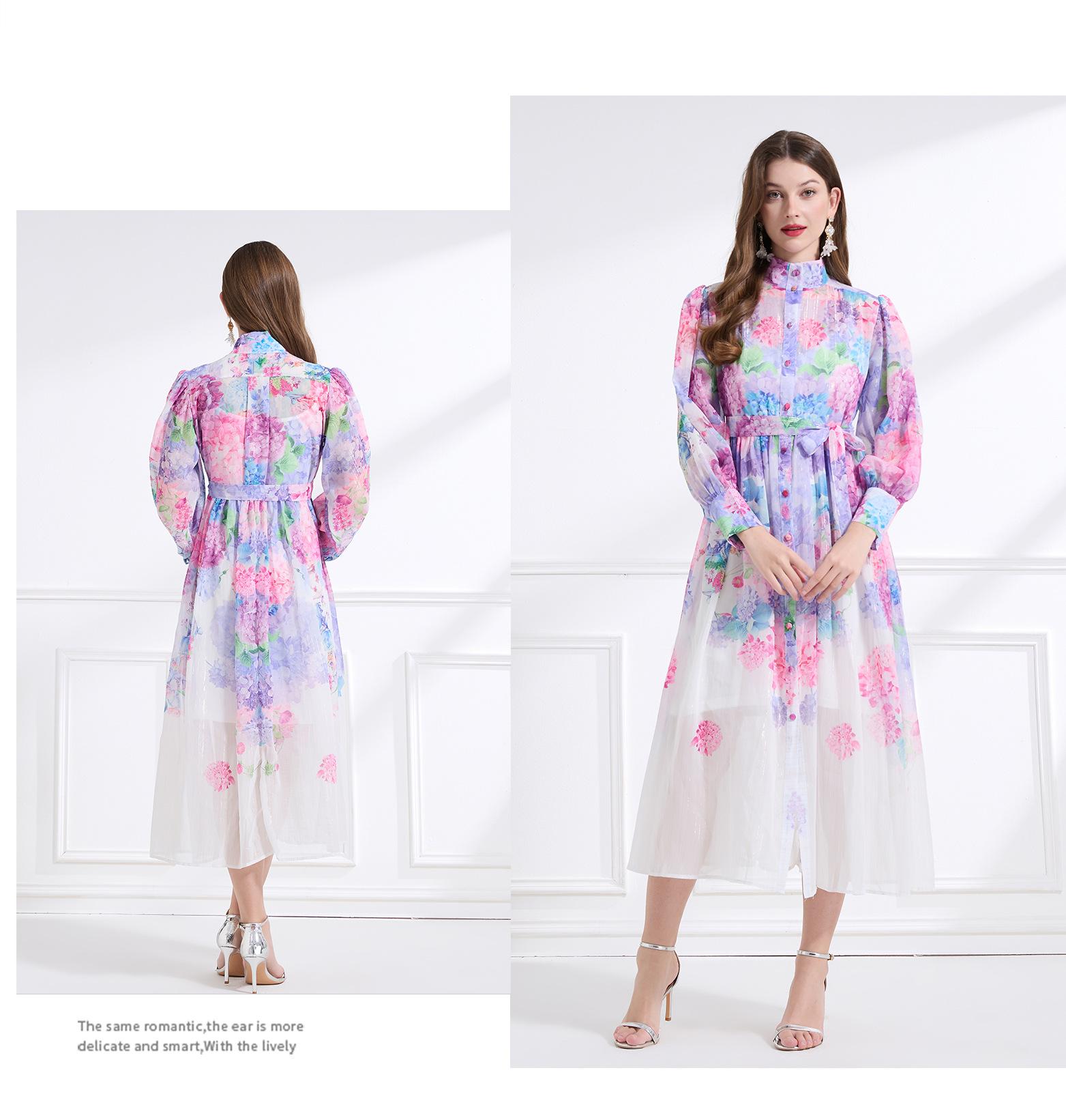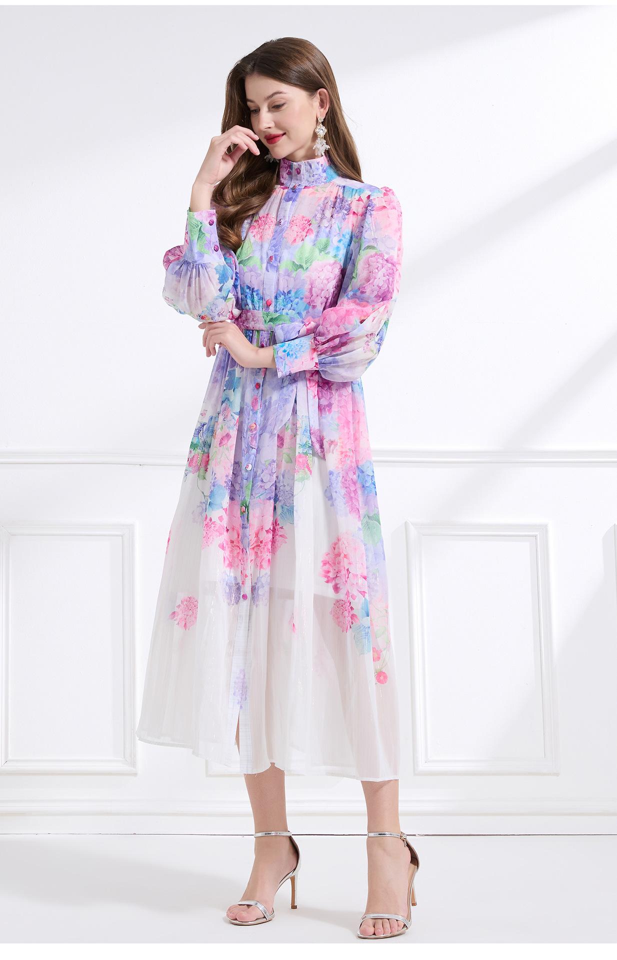 2025 Cuello Alto Estampado Floral Acuarela Mangas Linterna Cintura Falda Grande Falda con Volantes - Traje de Dos Piezas