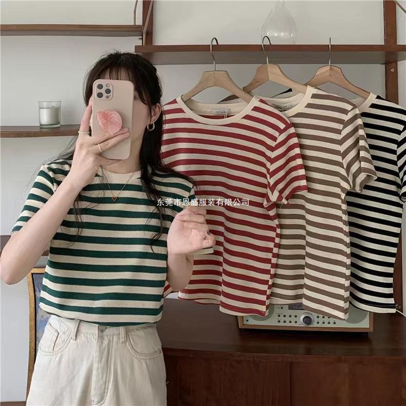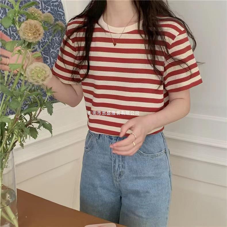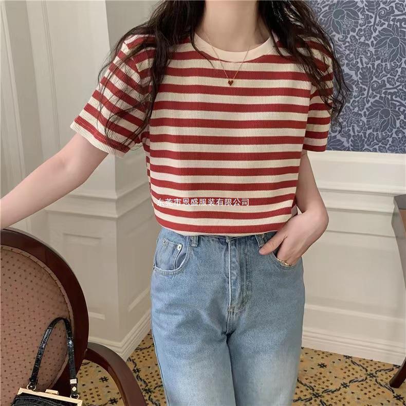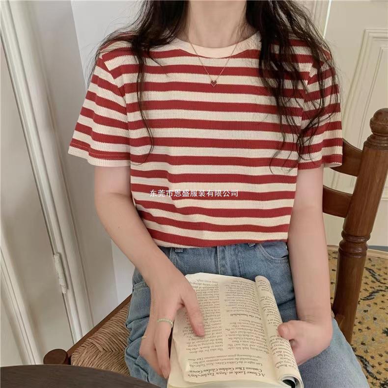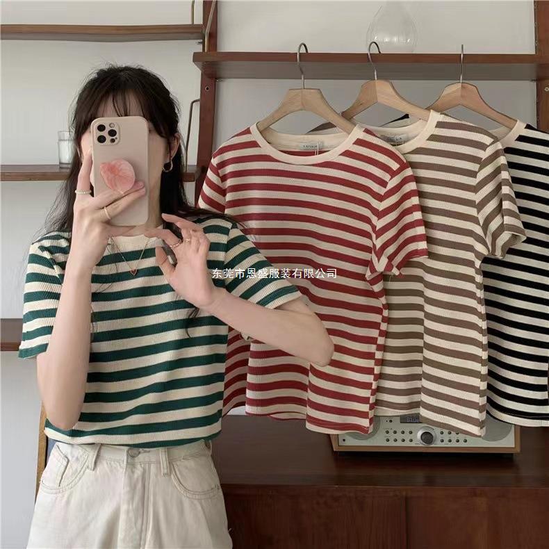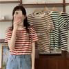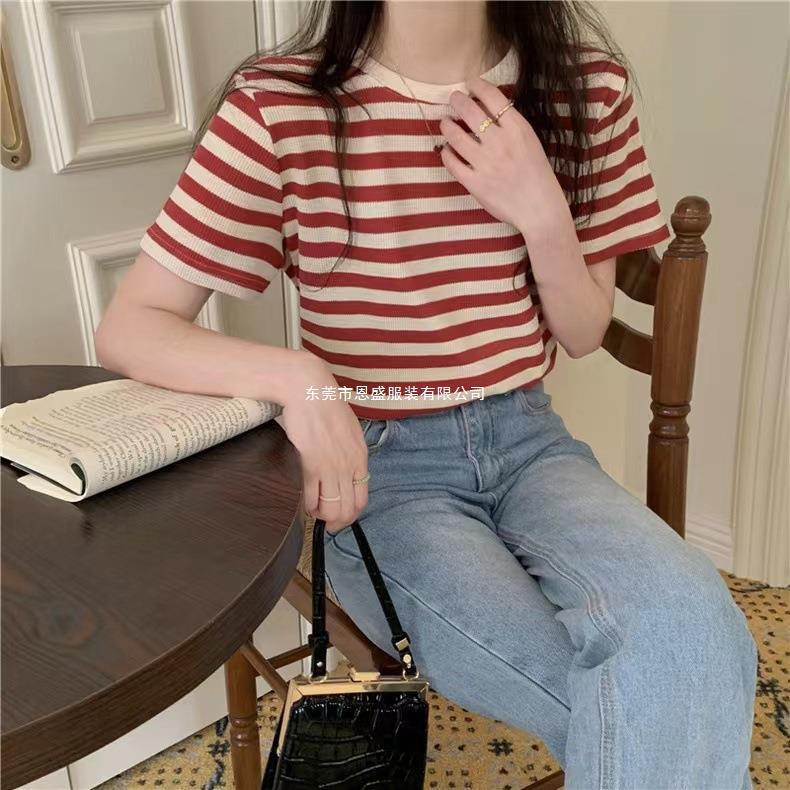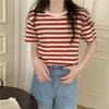2024 Verano Nuevo para Mujer Retro Cuello Redondo Diseño Rayado Nicho Holgado Delgado Manga Corta Suéter Top