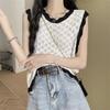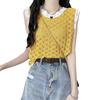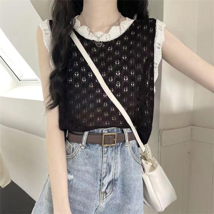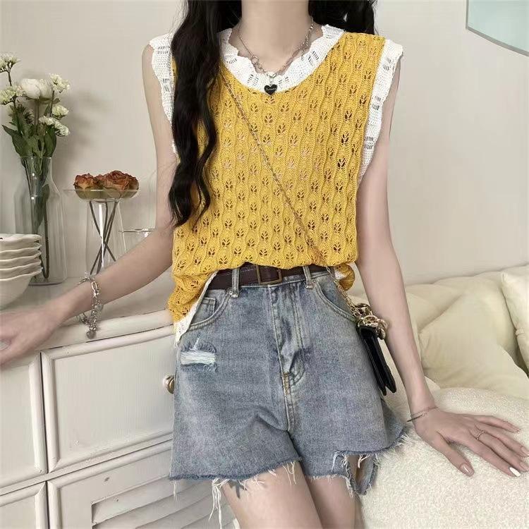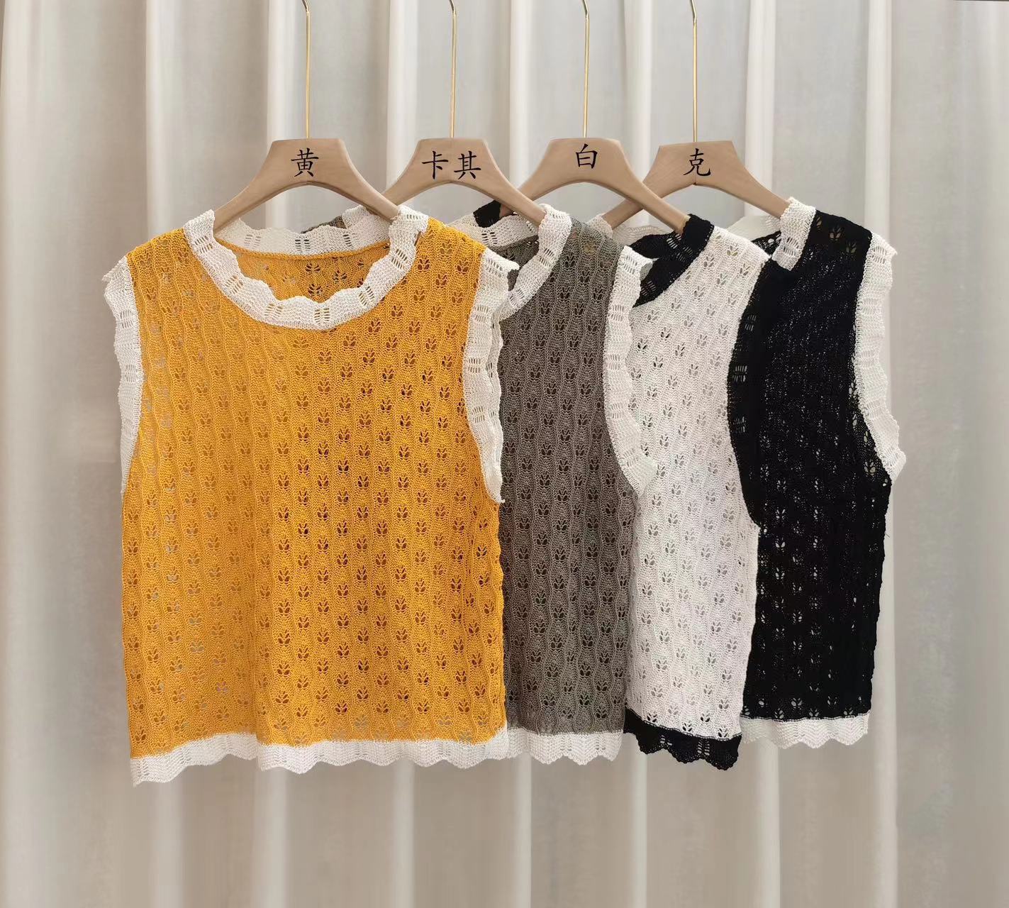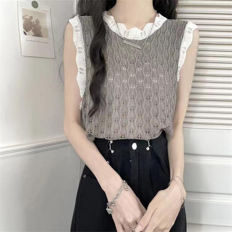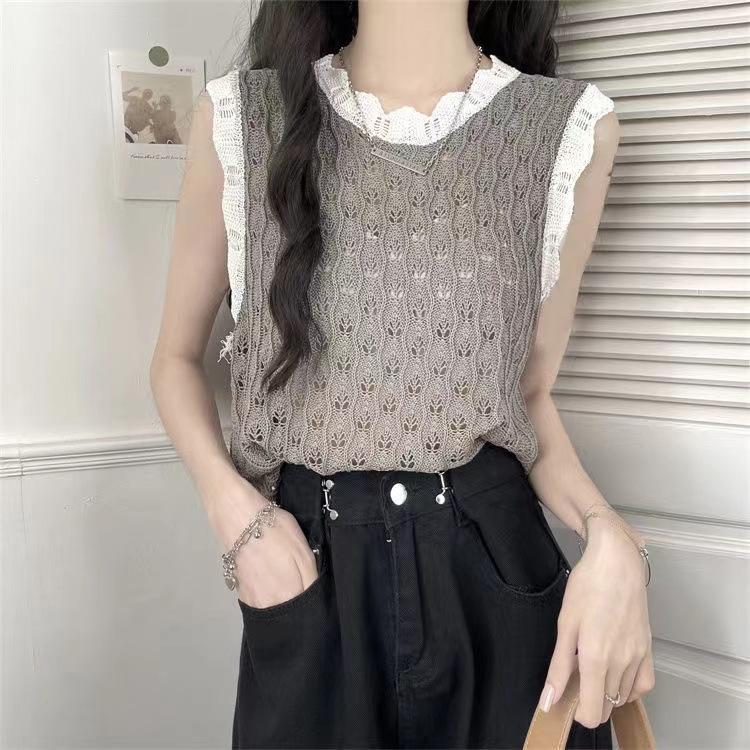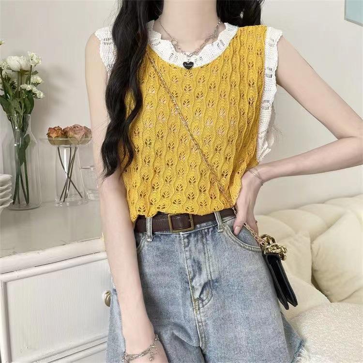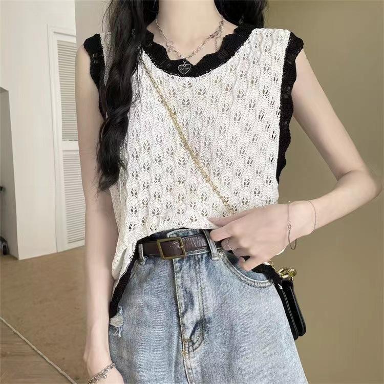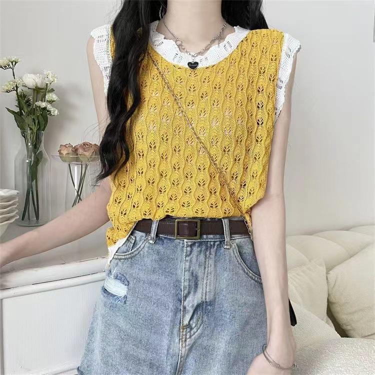 Sentido del Diseño Combinación de Colores Chaleco Calado sin Mangas Verano Tejido Nuevo Elegante Sexy Slim Tejido Top Holgado Trendy