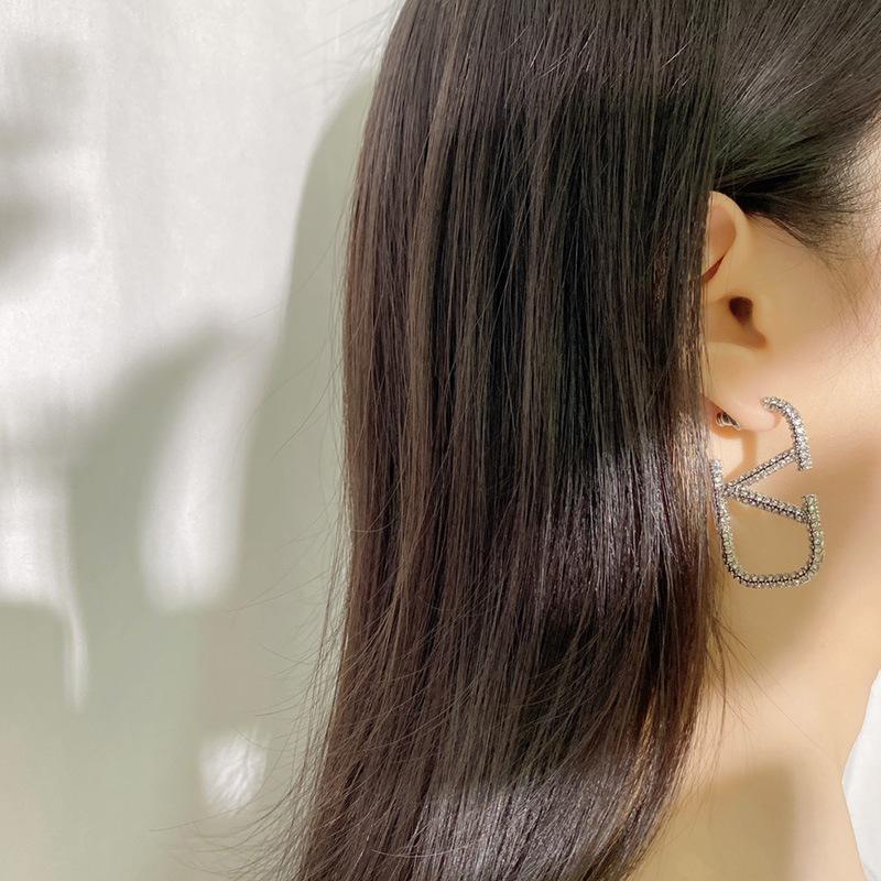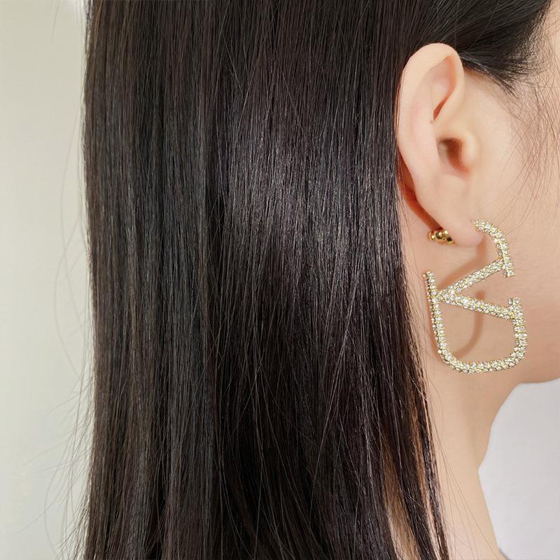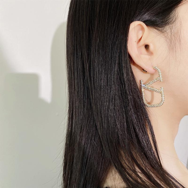 Aretes de letra V para mujer temperamento europeo y americano simple metálico diamantes completos aretes grandes tendencia moda aretes geométricos exagerados