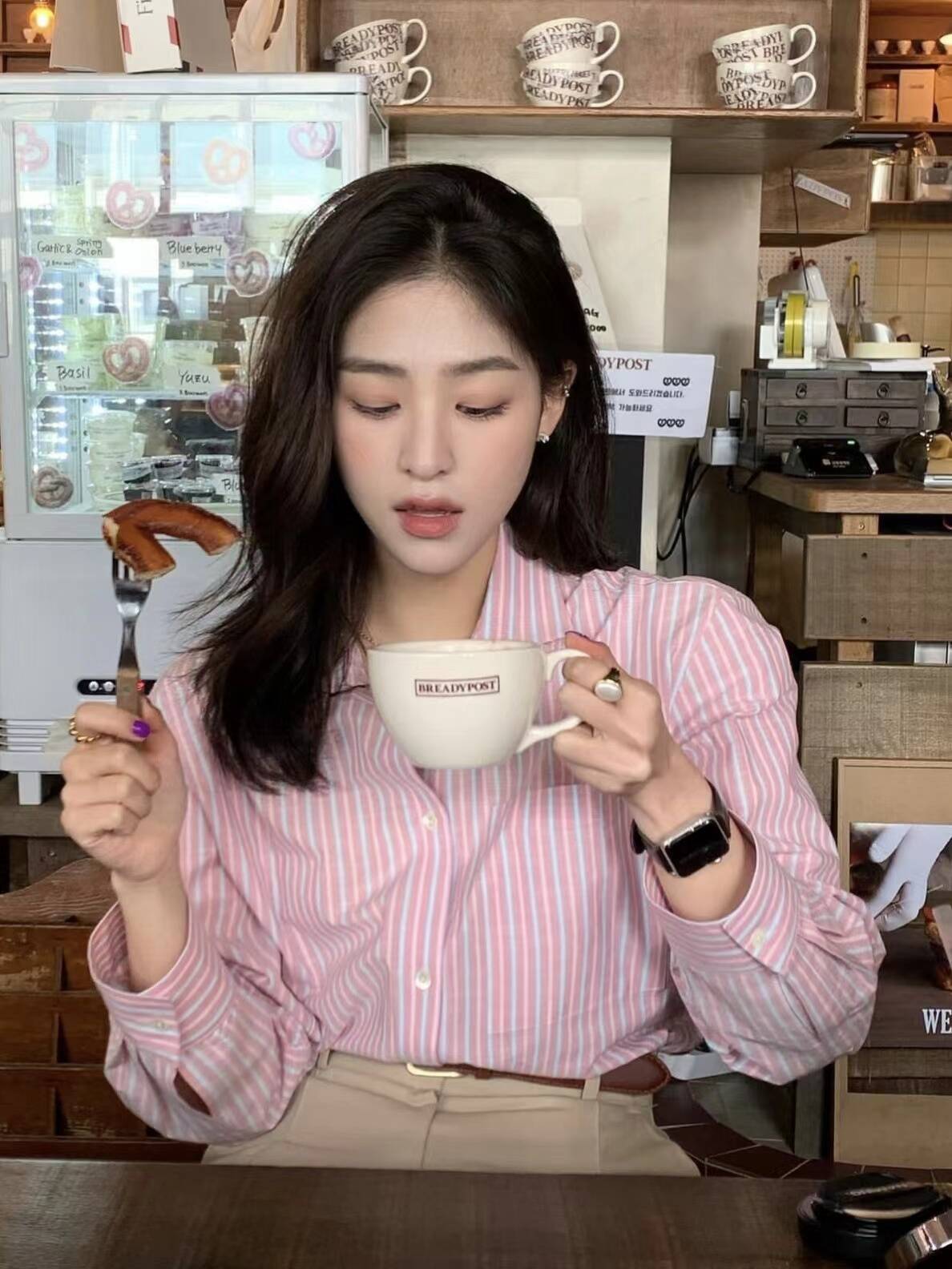 Camisa Niche con Sentido del Diseño Estilo Coreano a Rayas Rosas para Mujer Primavera 2025 Camisa Francesa de Manga Larga Top Chic Elegante