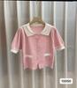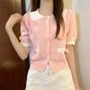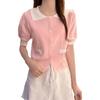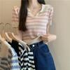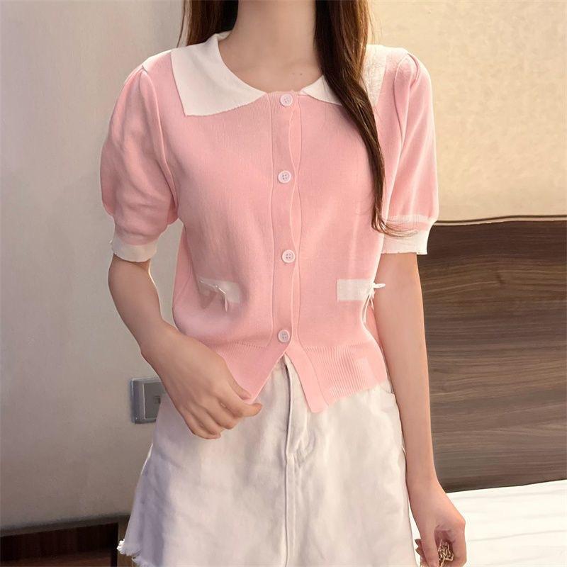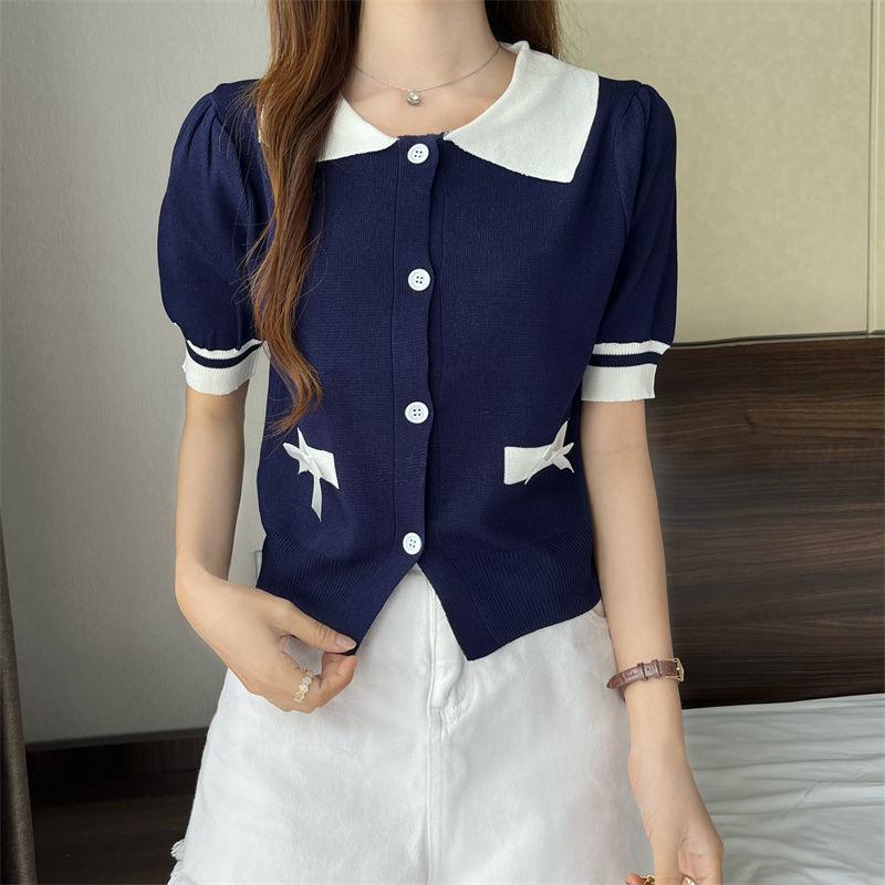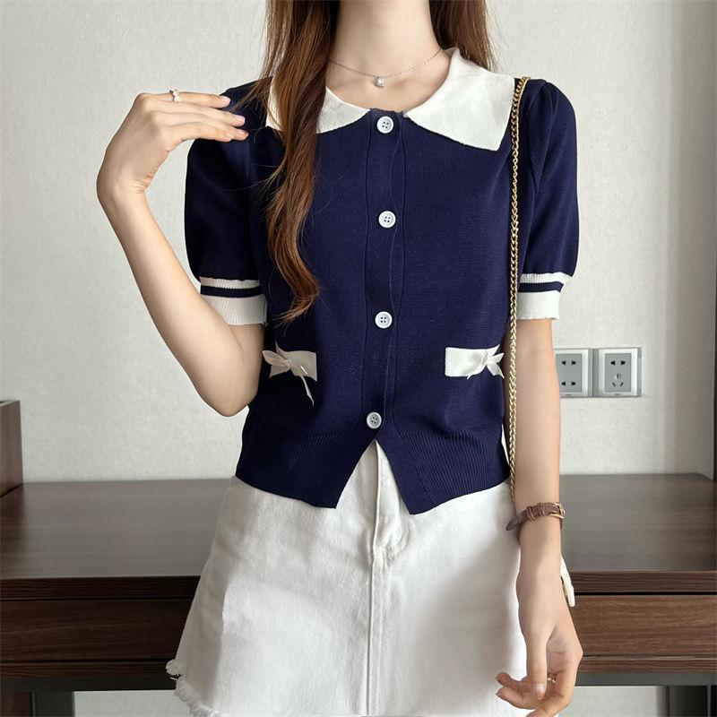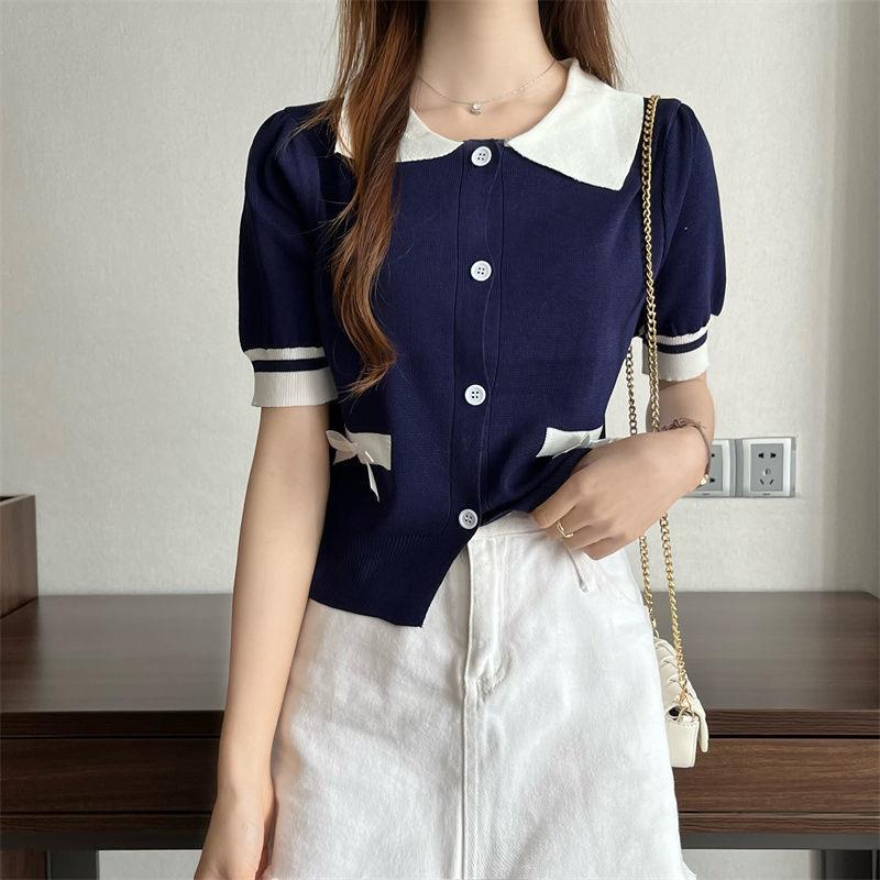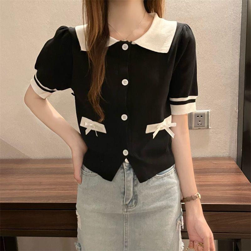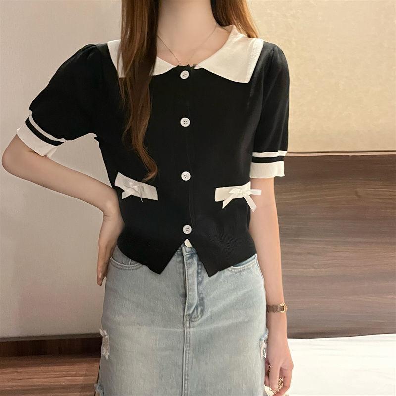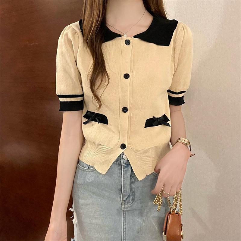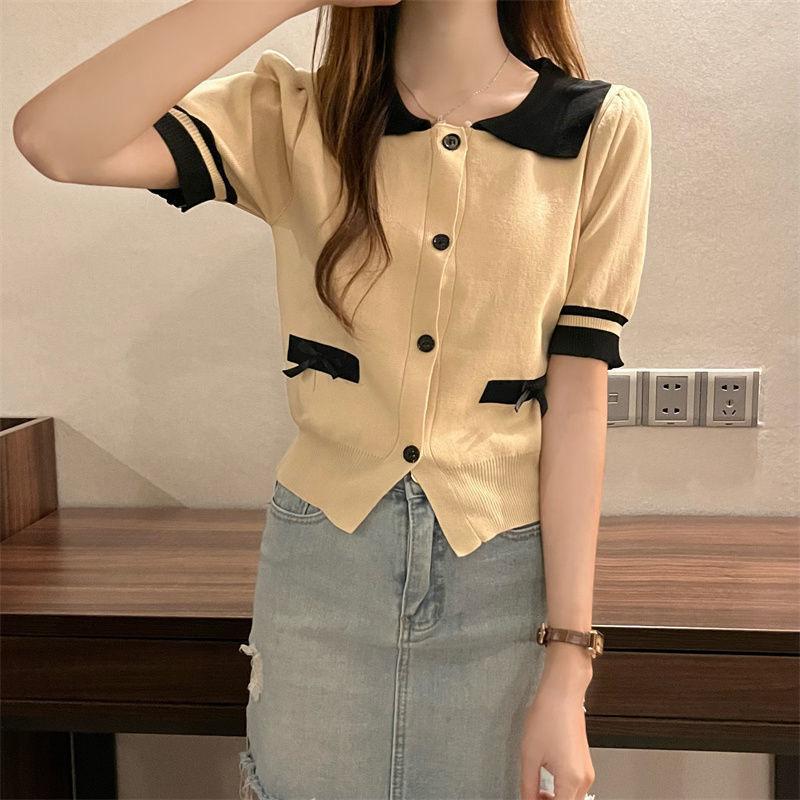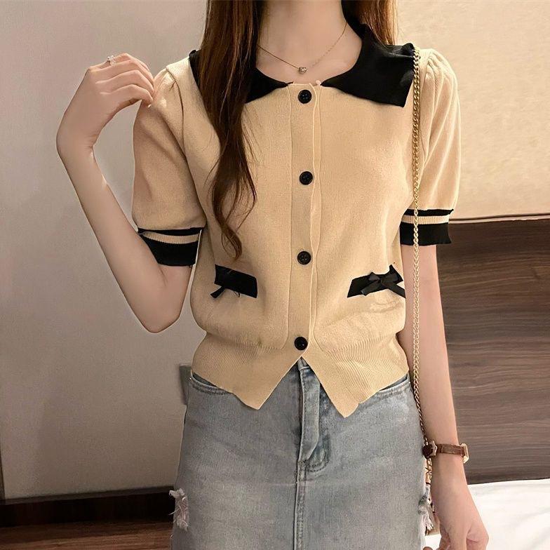 Suéter de punto de manga corta de seda de hielo con contraste de color francés de verano para mujer, diseño de nicho con sentido, polo suave, top corto, camiseta