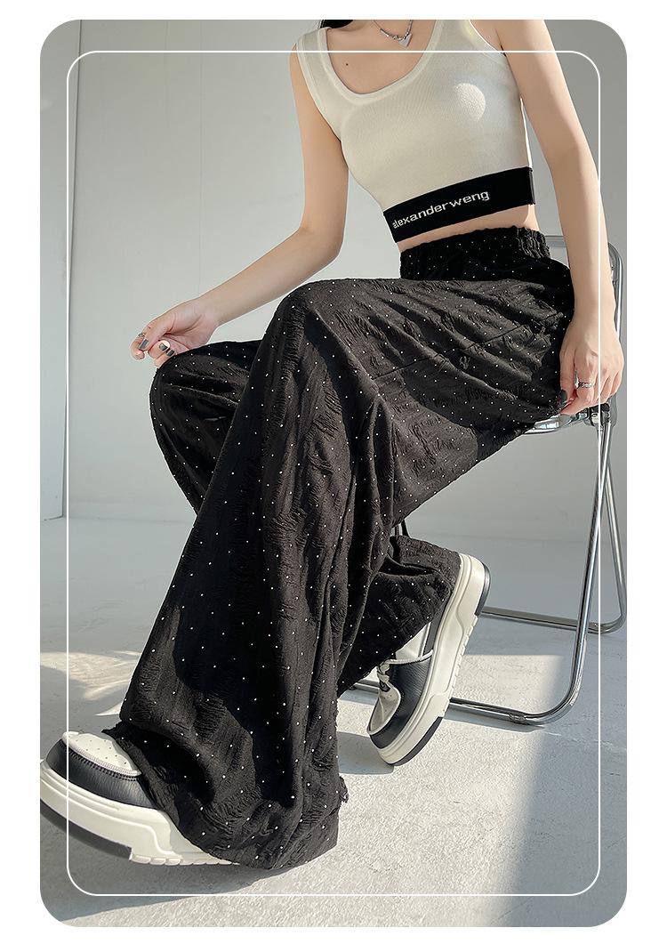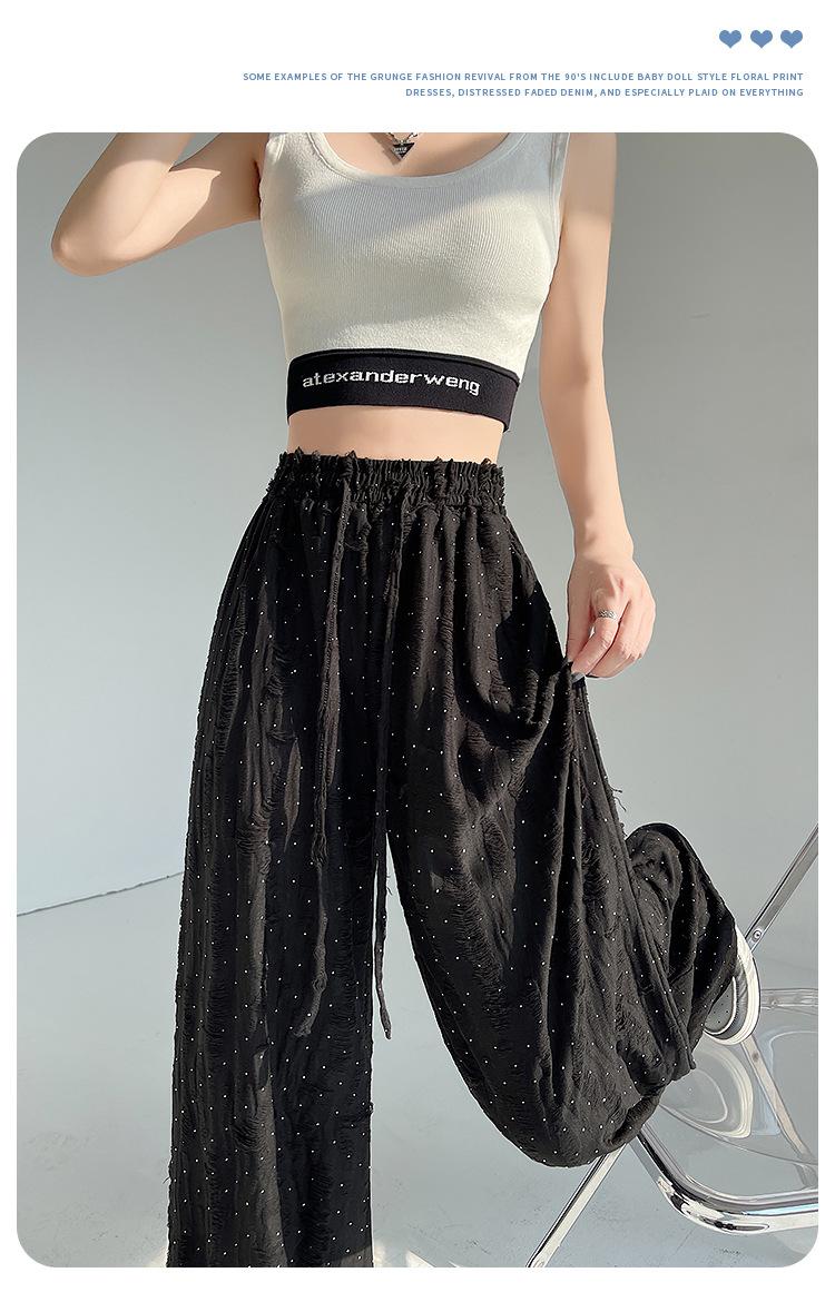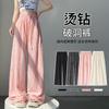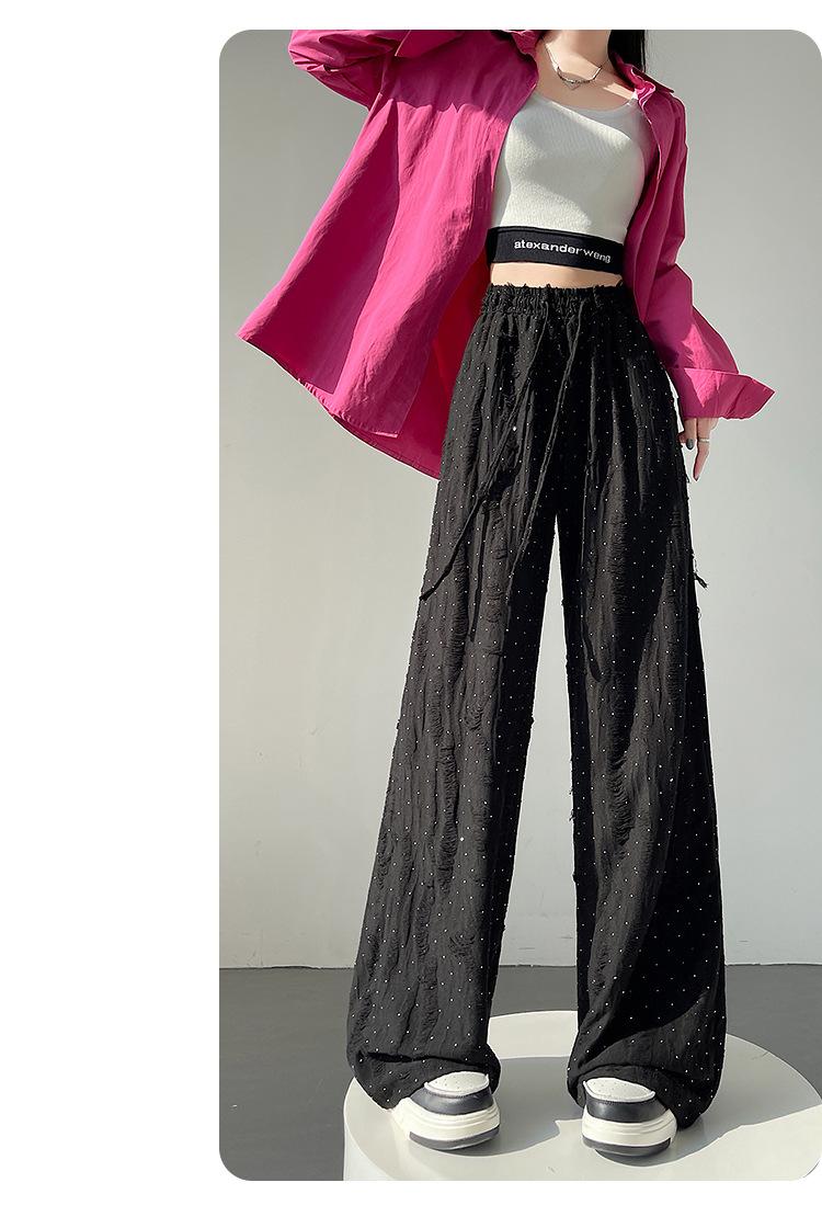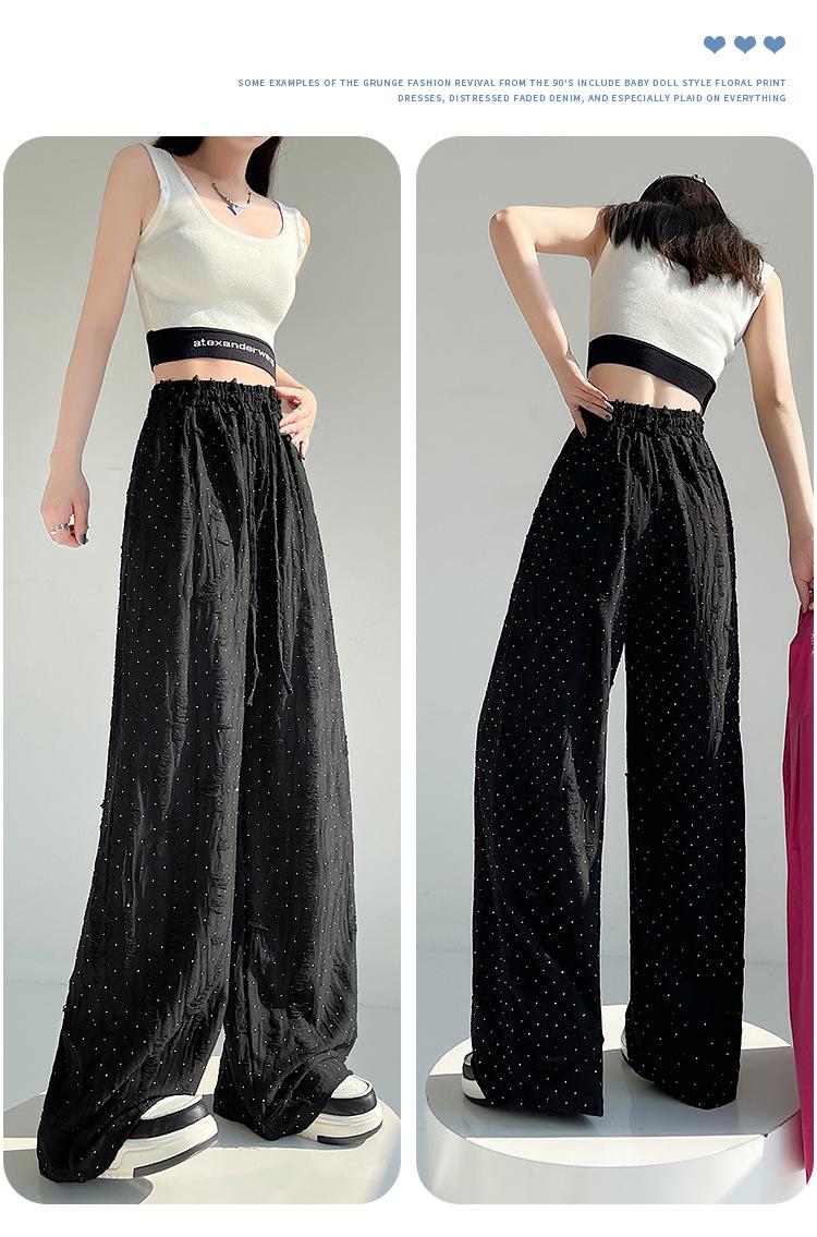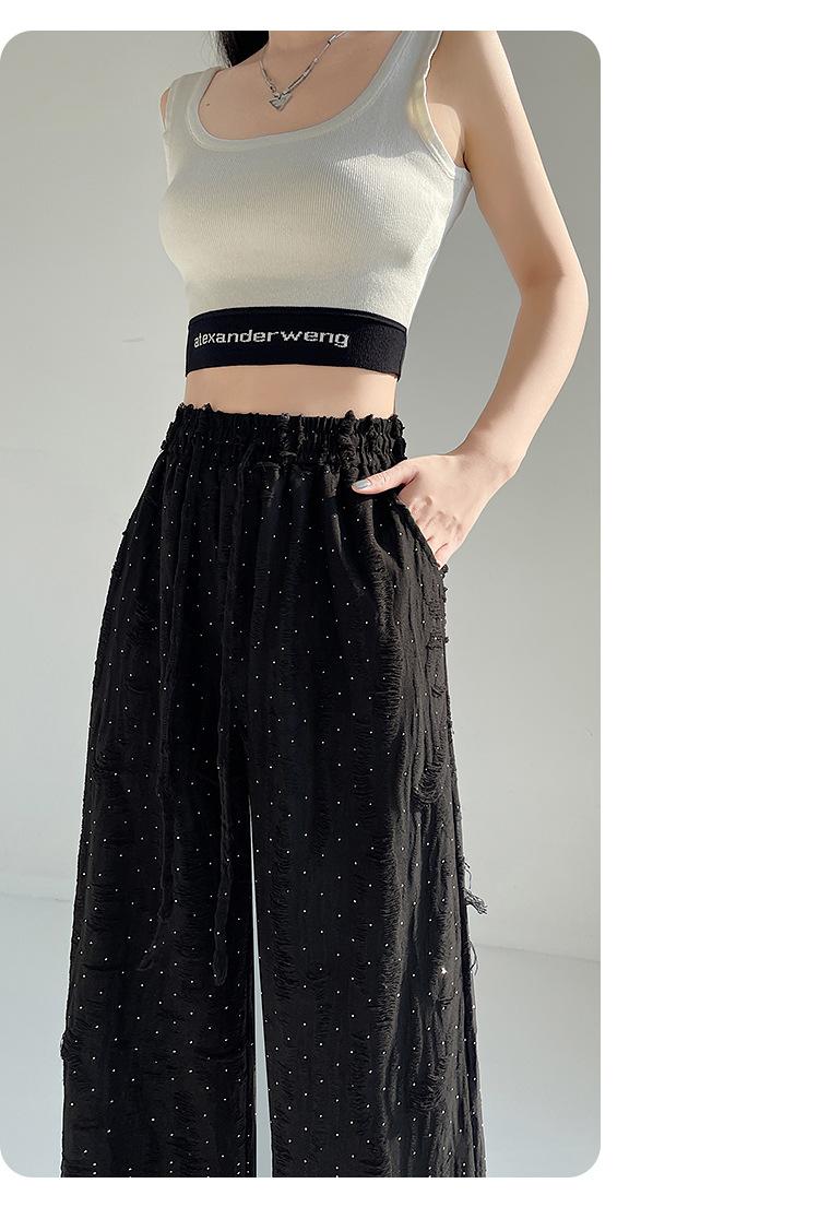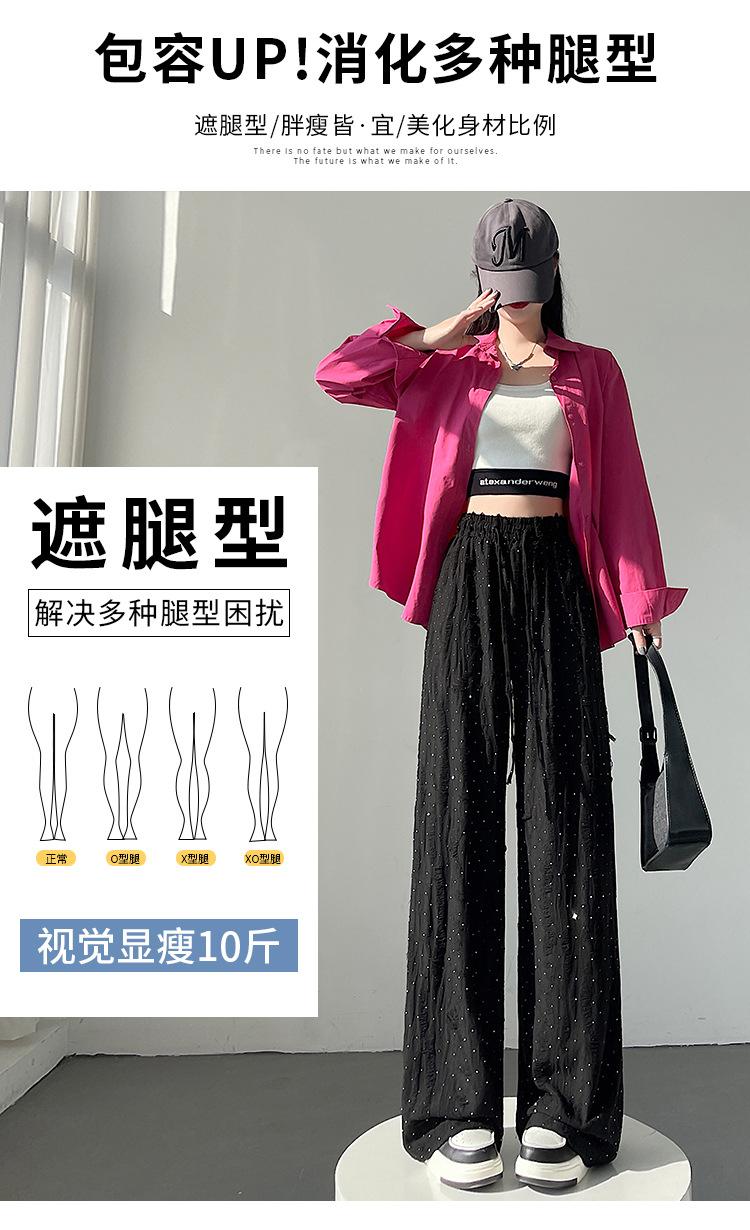Pantalones rasgados de pierna ancha para mujer 2025 Verano Nuevo Estilo Seda de hielo Delgados Diamante Cintura alta Drapeados Casuales Rectos Hasta el suelo