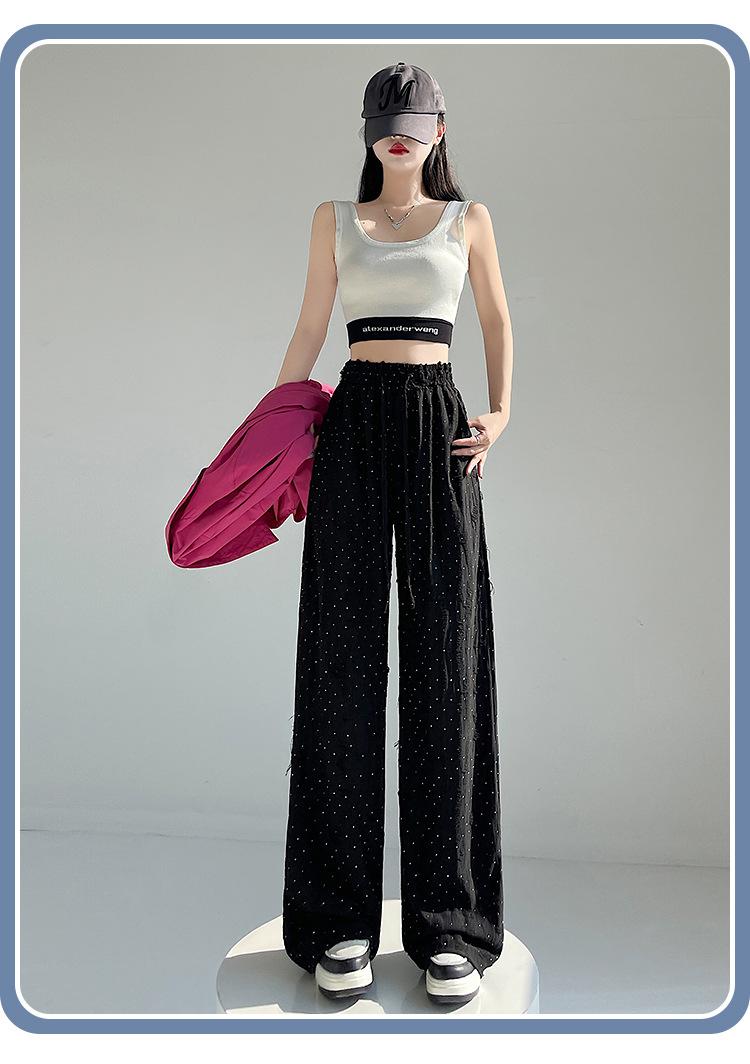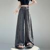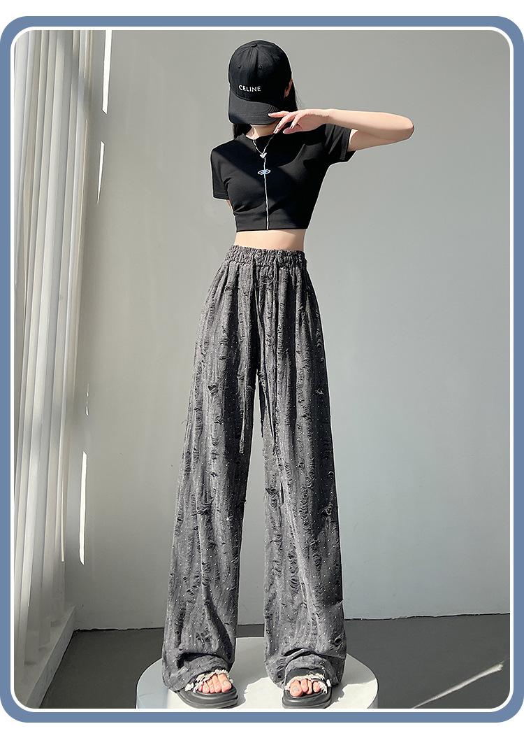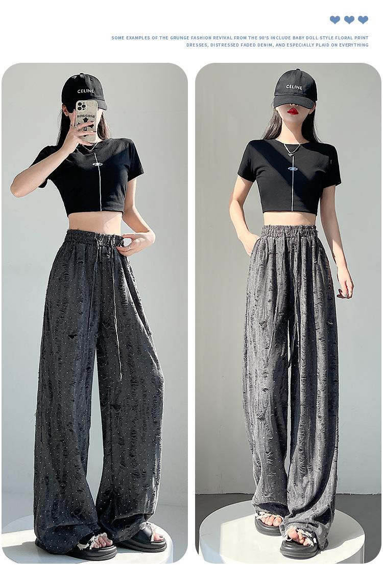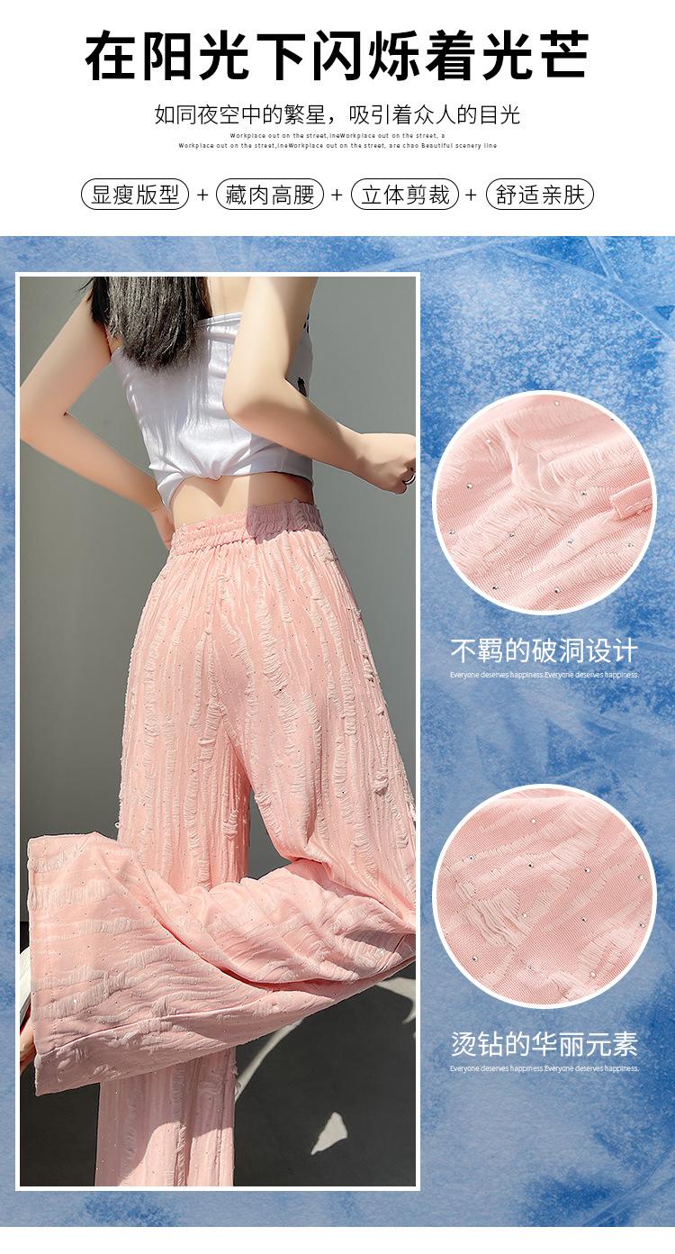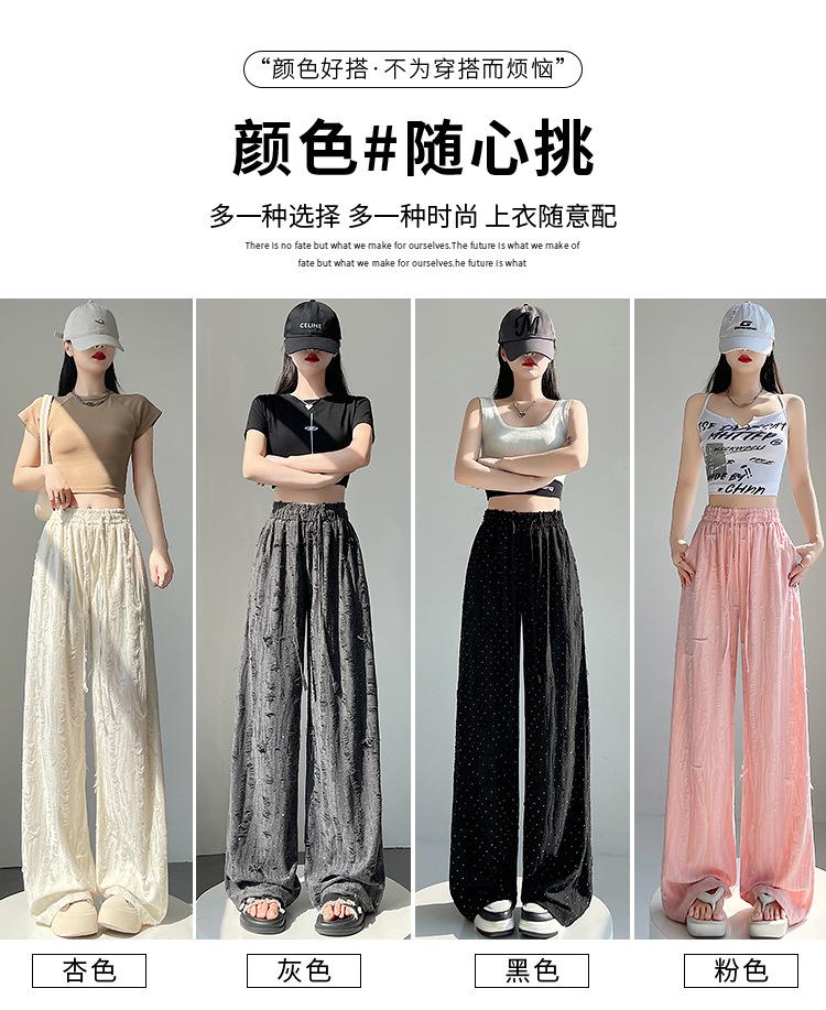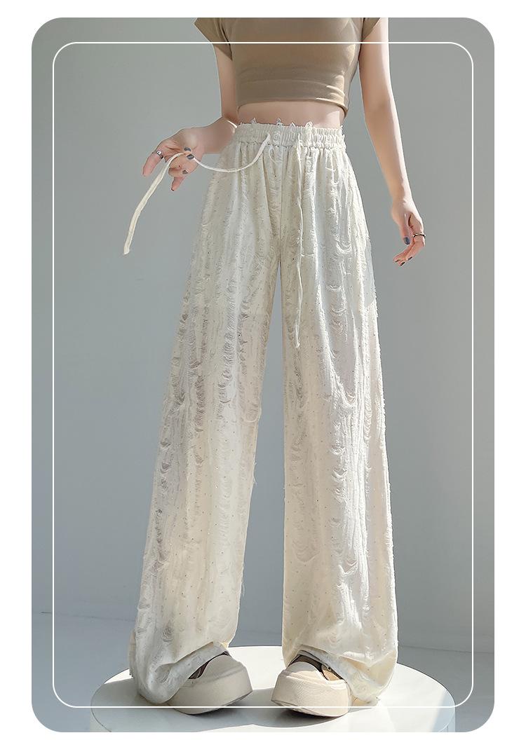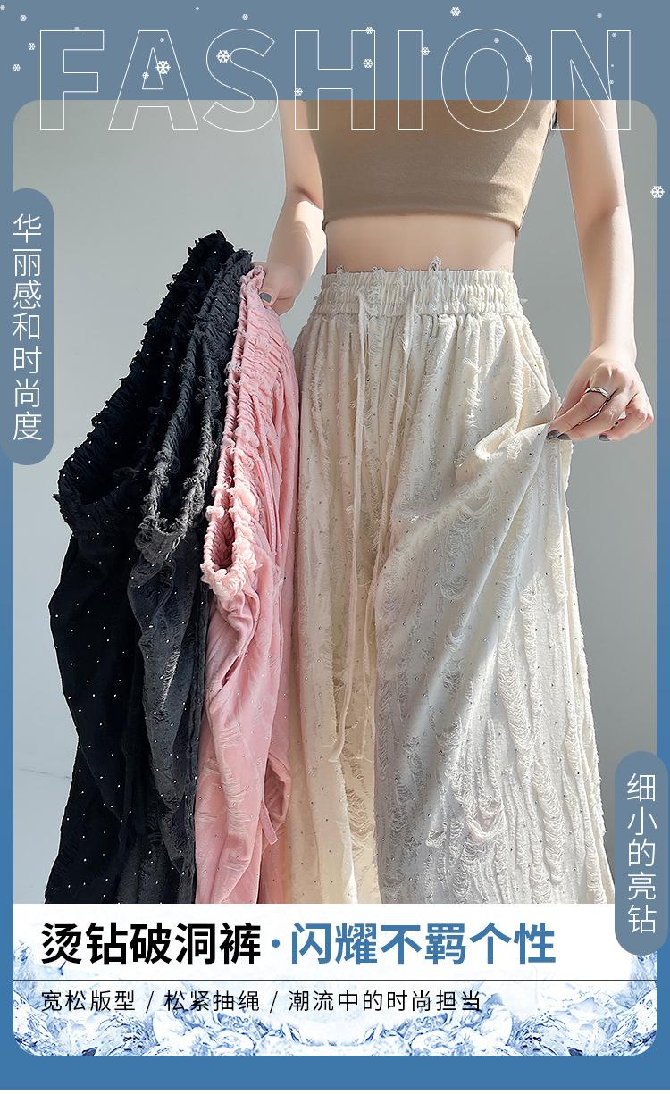 Pantalones rasgados de pierna ancha para mujer 2025 Verano Nuevo Estilo Seda de hielo Delgados Diamante Cintura alta Drapeados Casuales Rectos Hasta el suelo