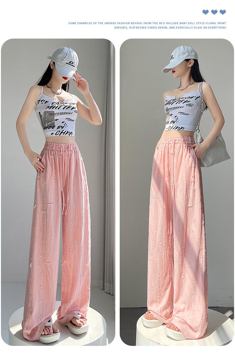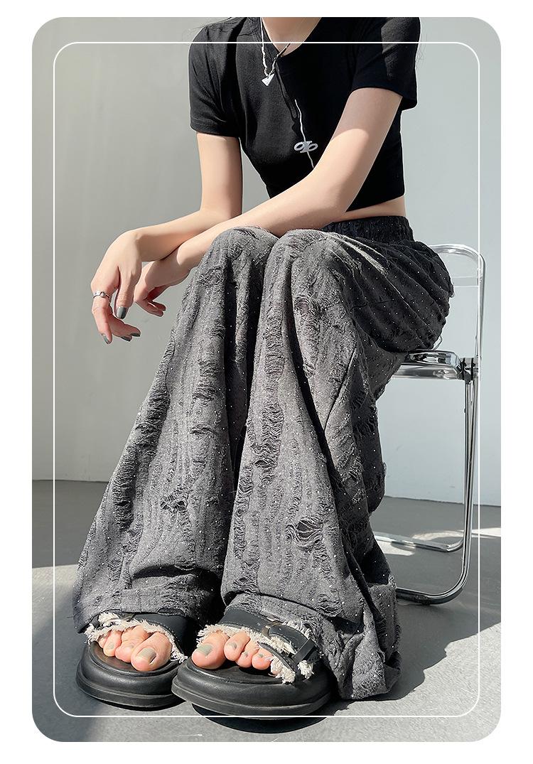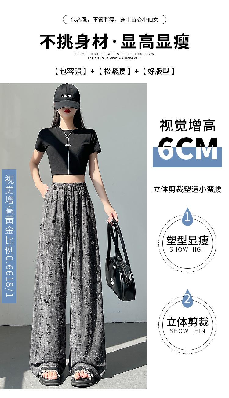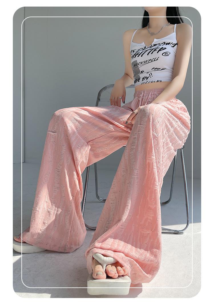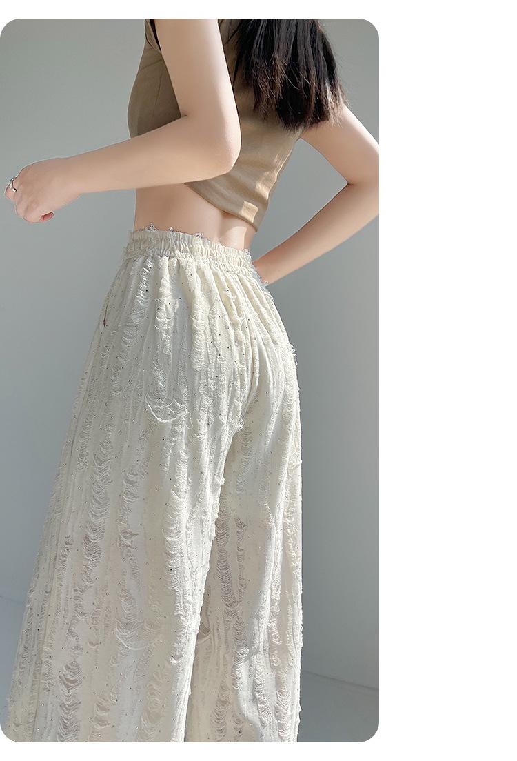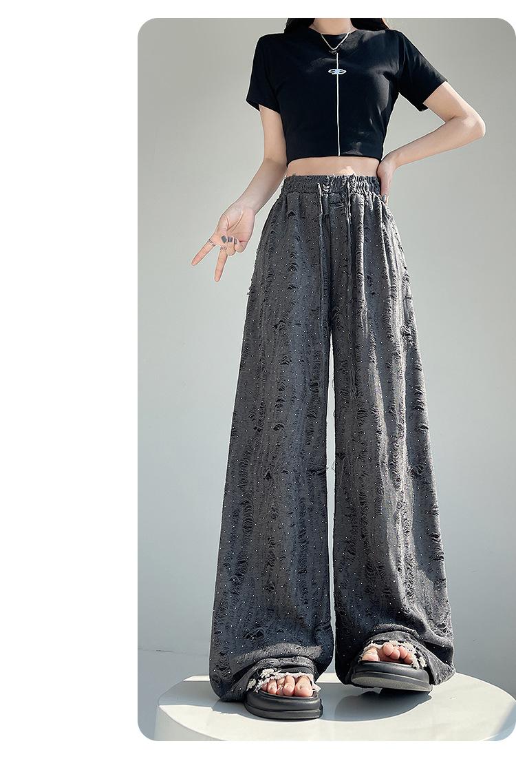 Pantalones rasgados de pierna ancha para mujer 2025 Verano Nuevo Estilo Seda de hielo Delgados Diamante Cintura alta Drapeados Casuales Rectos Hasta el suelo