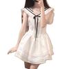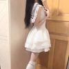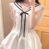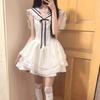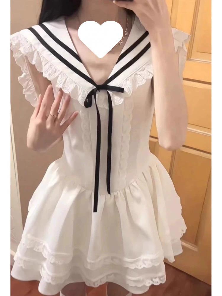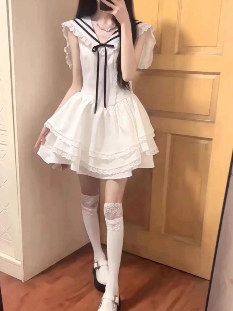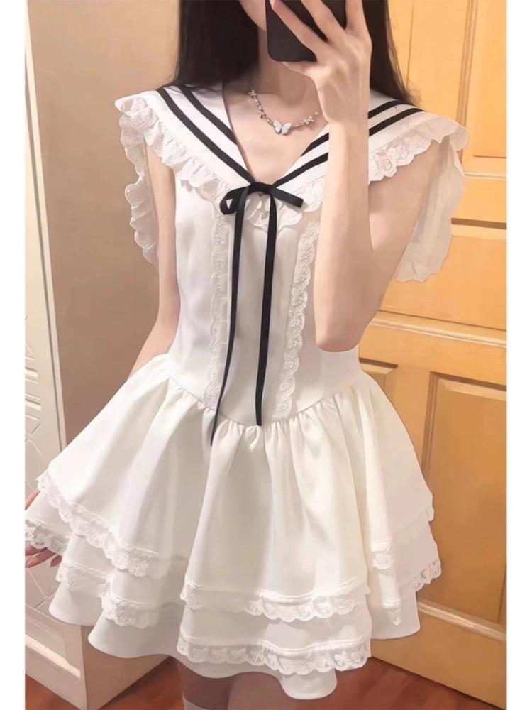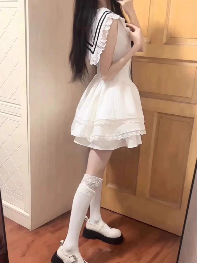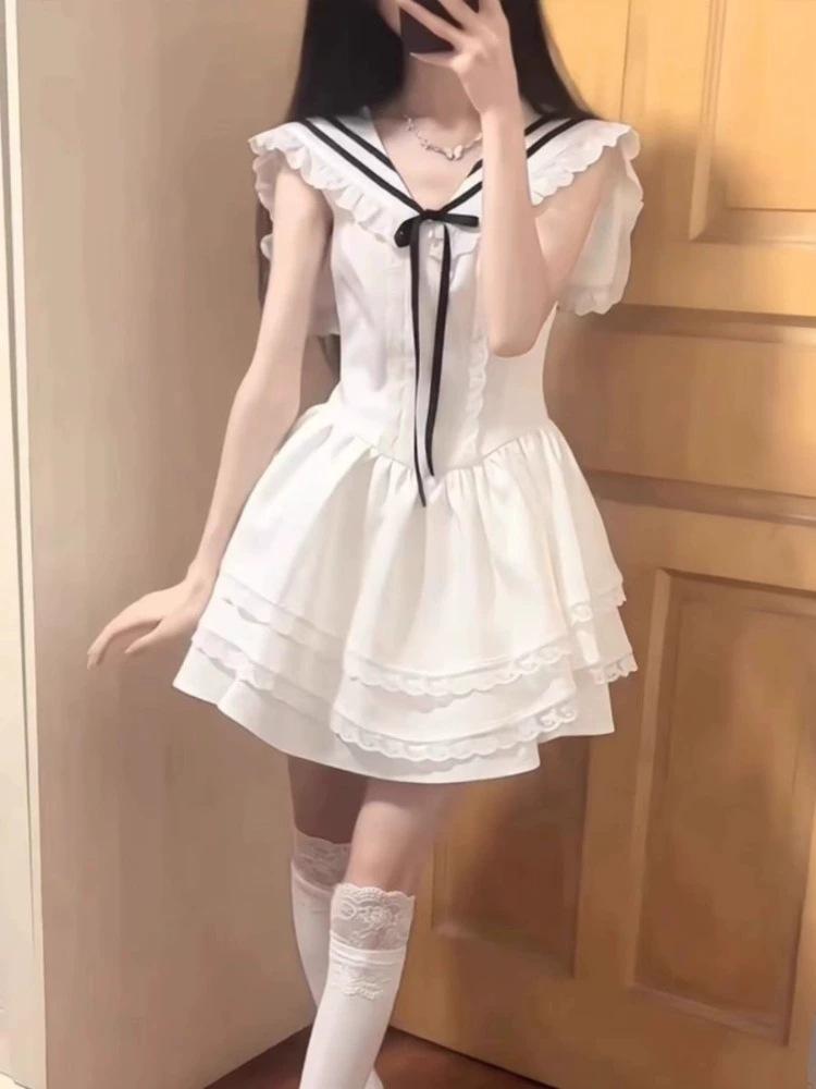 Vestido Blanco Petit con Cuello Azul Marino Estilo Universitario 2025 Nuevo Francés Primer Amor Falda Tutú Cintura Falda Corta Trendy