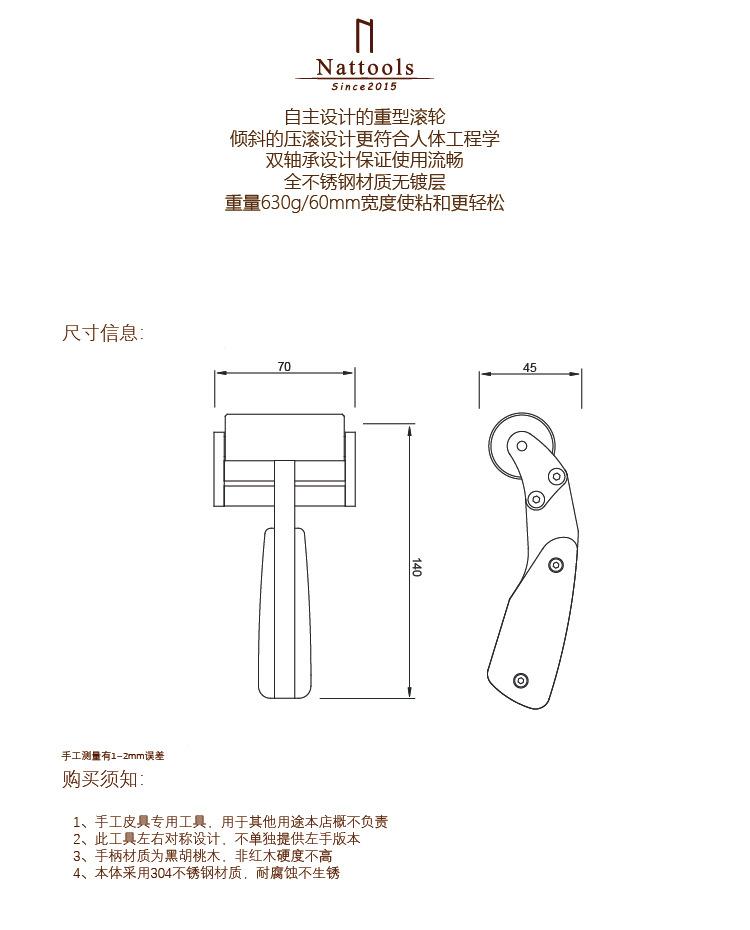 Rodillo de presión adhesivo para cuero Nattools de acero inoxidable de alta resistencia, rodillo para cuero hecho a mano, rodillo para cuero