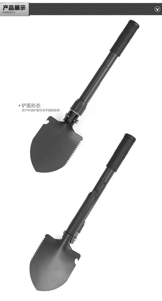 Características: Plegable, de tamaño pequeño, fácil de transportar. Cuando se despliega, un extremo es una pala y el otro extremo es un pico. Flexible, plegable, un artículo esencial para actividades de campamento al aire libre