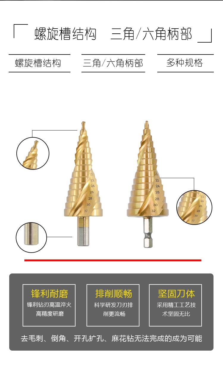 Características:Las principales ventajas de las brocas escalonadas con ranura en espiral sobre las brocas escalonadas con ranura recta comunes son la fuerte capacidad de evacuación de viruta, una mejor guía y un corte más suave.