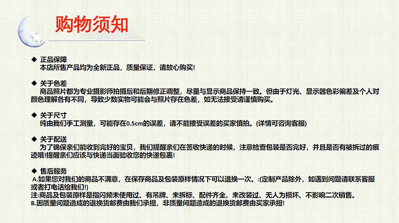 | 1. Todos nuestros enlaces con una cantidad mínima de pedido de 2-3 piezas se pueden pedir directamente. Si los artículos están en stock, los enviaremos lo antes posible después de realizar el pedido. Si descubrimos que el stock está agotado, notificaremos al cliente inmediatamente (ya que puede haber casos en los que el stock ya se haya vendido o aún esté siendo repuesto, y el enlace no se haya actualizado a tiempo). ¡Lamentamos sinceramente esta situación! 2. Nuestra tienda es tanto mayorista, personalizador y minorista. Los productos al por mayor y personalizados no admiten devoluciones ni reembolsos. La imagen principal de los enlaces de productos minoristas a veces puede diferir del producto real enviado. Algunas imágenes de enlace son para demostrar la funcionalidad del producto. La imagen real del producto generalmente se basa en la imagen de la opción, o consulte al servicio de atención al cliente para aclaraciones si tiene alguna pregunta. 3. Los productos minoristas y mayoristas de nuestra tienda no admiten devoluciones o cambios sin motivo dentro de los siete días por problemas que no sean de calidad. Si hay problemas de calidad, ¡los gastos de envío de devolución y cambio corren a cargo del cliente! ¡No proporcionamos seguro de envío! Para artículos faltantes o reenviados, ¡nuestra empresa cubre los gastos de envío! | ||