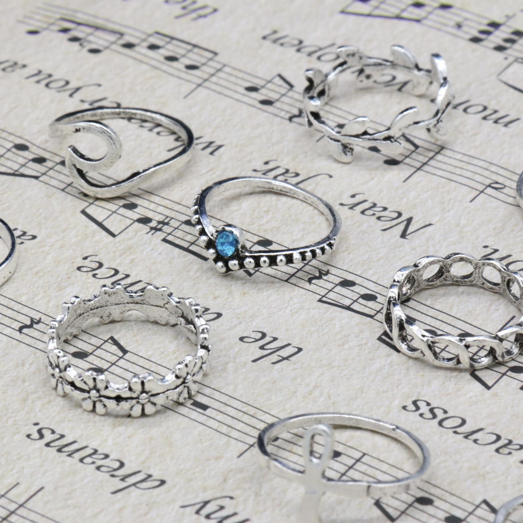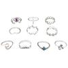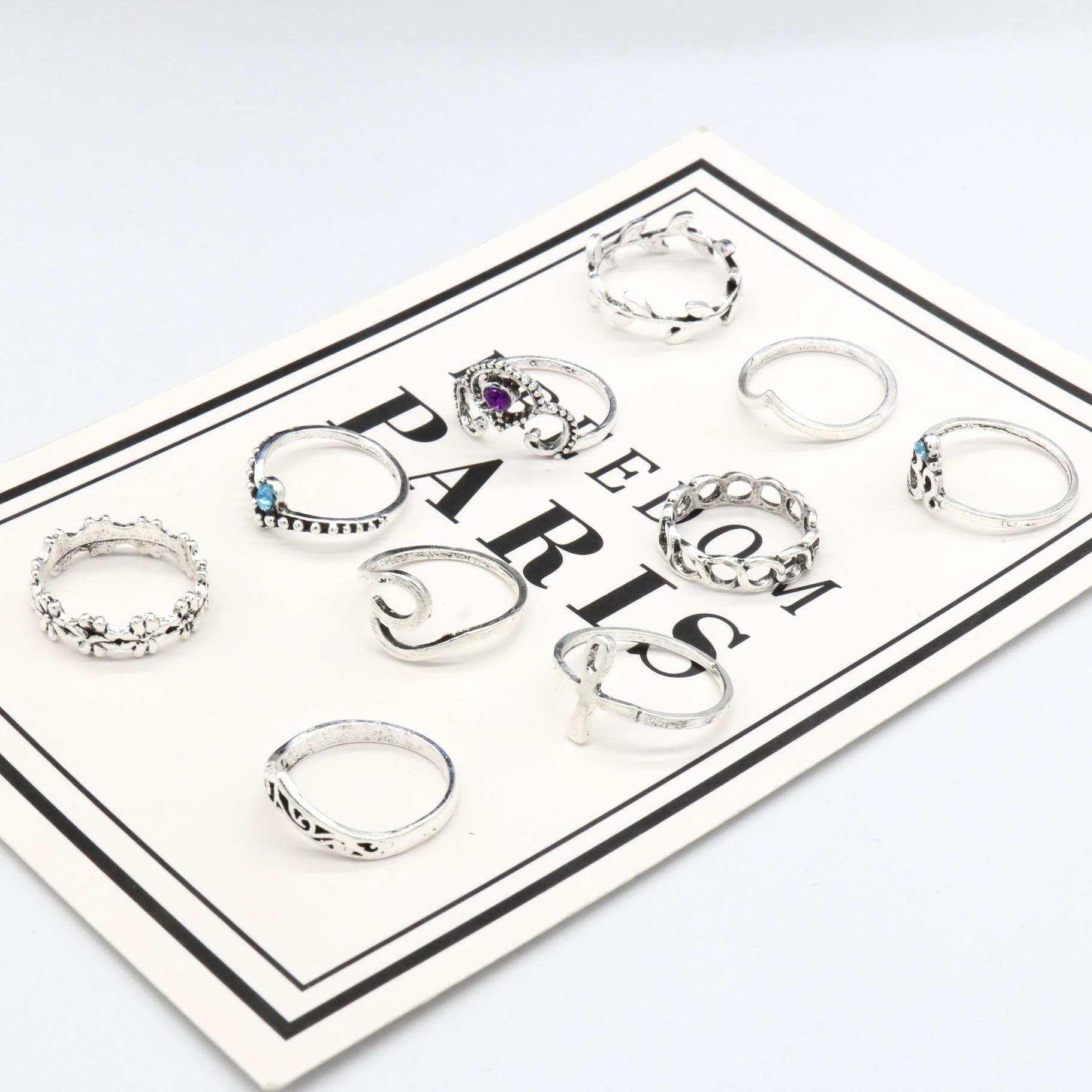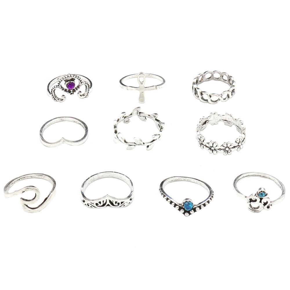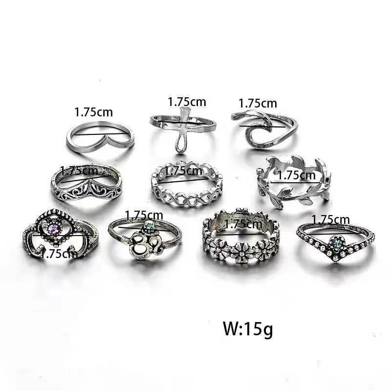 Joyería Nueva Europea y Americana Retro Cristal Incrustado Aleación Filigrana Juego de Diez Piezas Anillo para Nudillo con Forma de V y Flor
