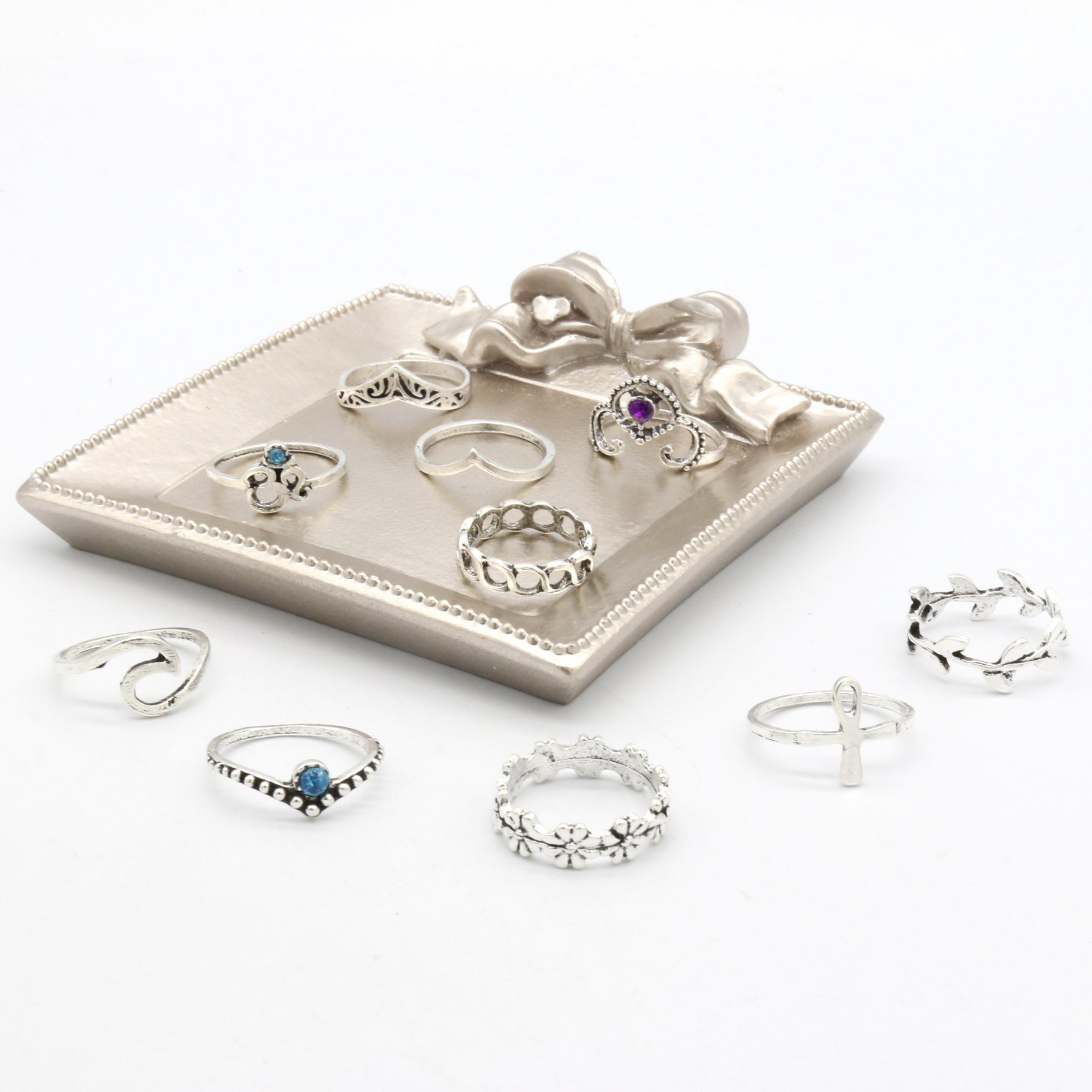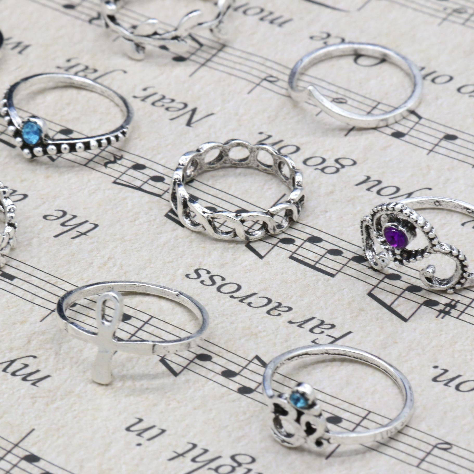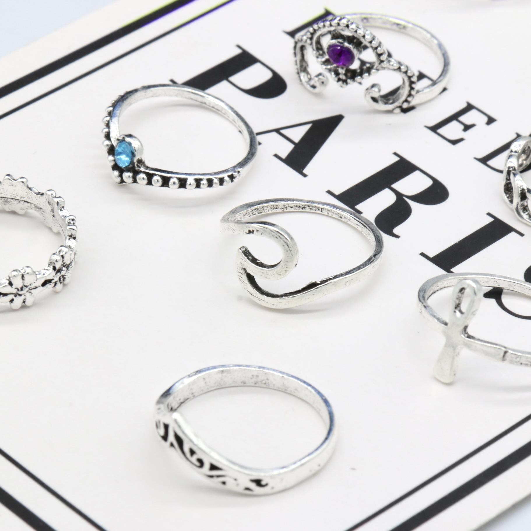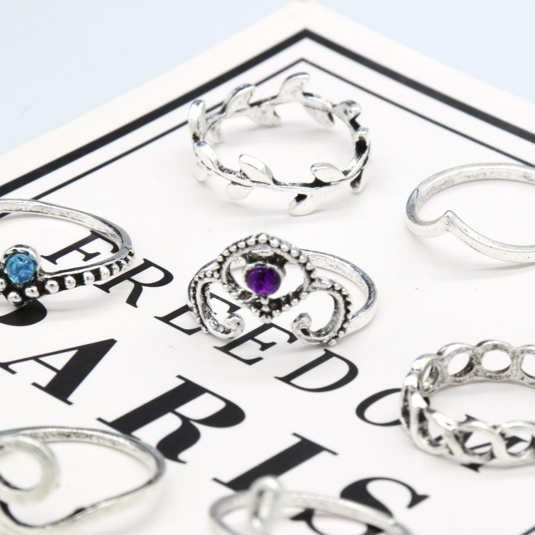 Joyería Nueva Europea y Americana Retro Cristal Incrustado Aleación Filigrana Juego de Diez Piezas Anillo para Nudillo con Forma de V y Flor