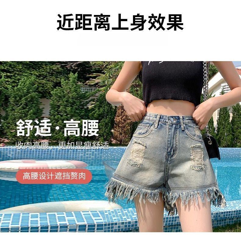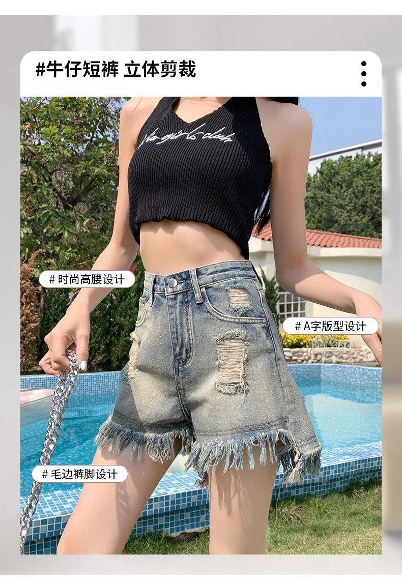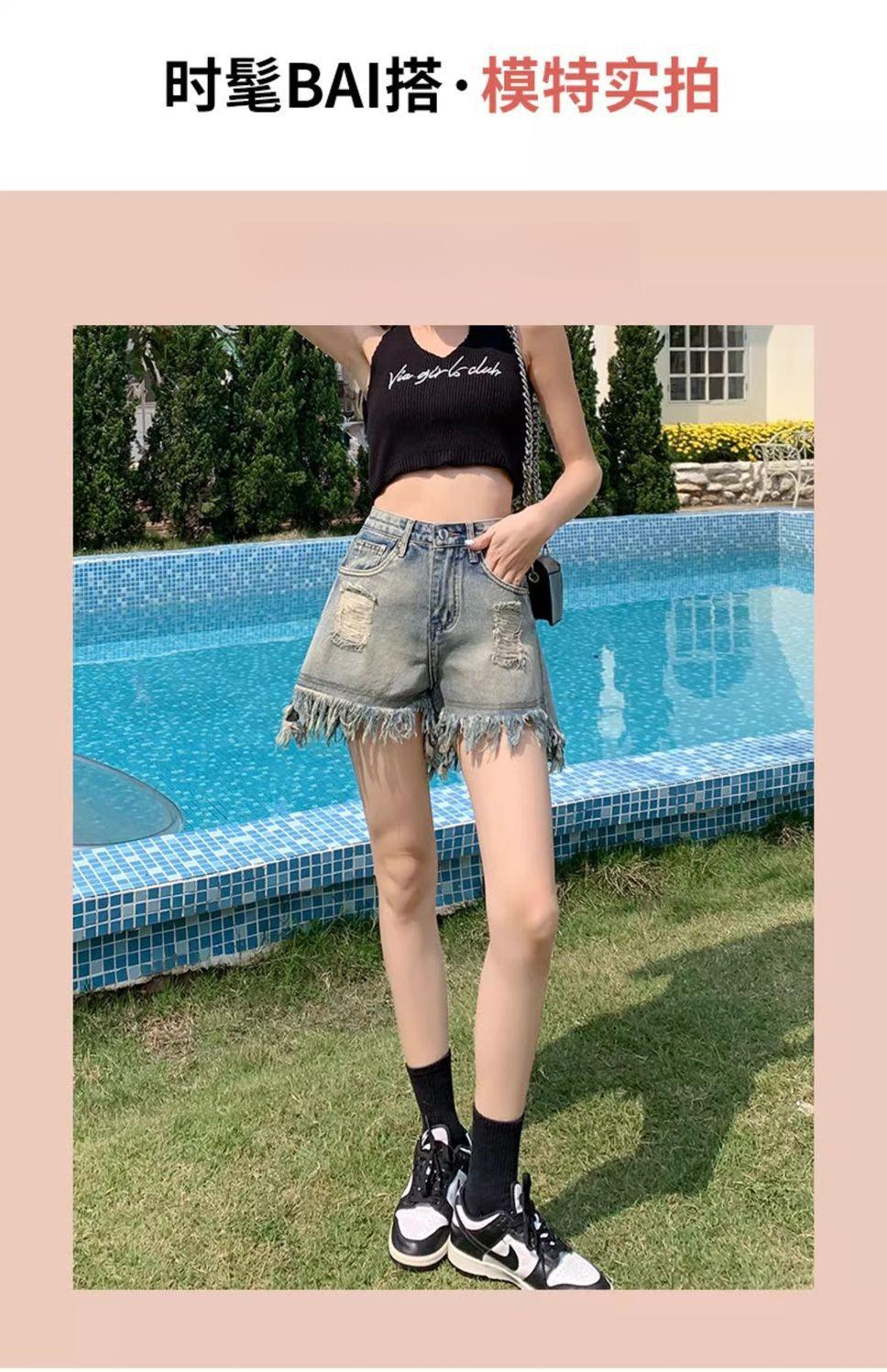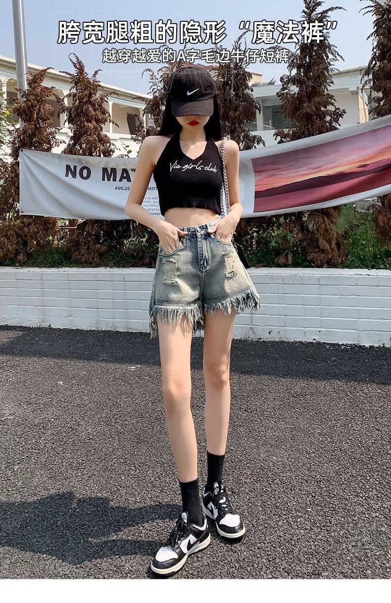 Shorts de mezclilla con flecos para chica americana sexy, verano 2024, nuevos, cintura alta, rotos, adelgazantes, más fáciles de combinar, línea A, borde crudo, pantalones cortos sexys