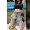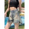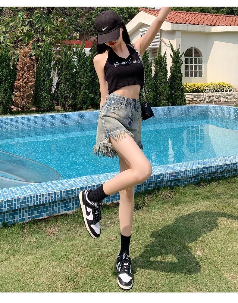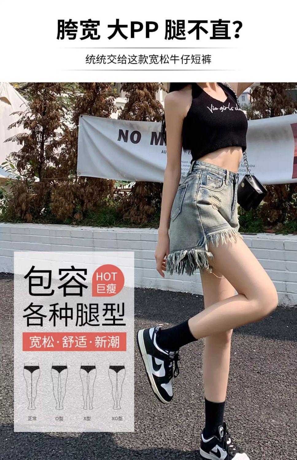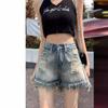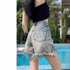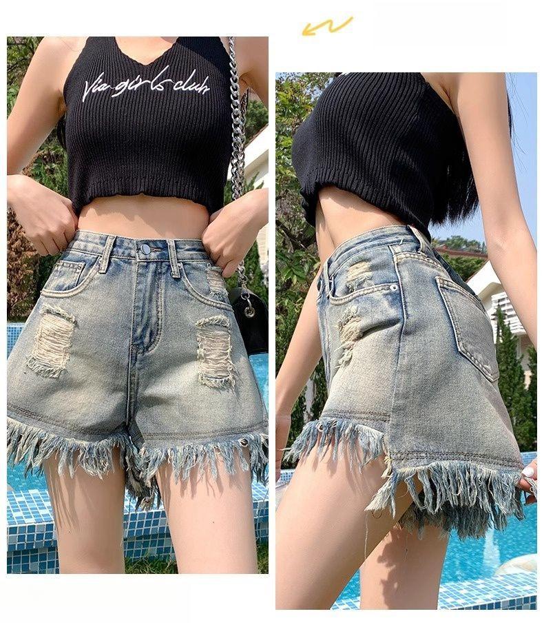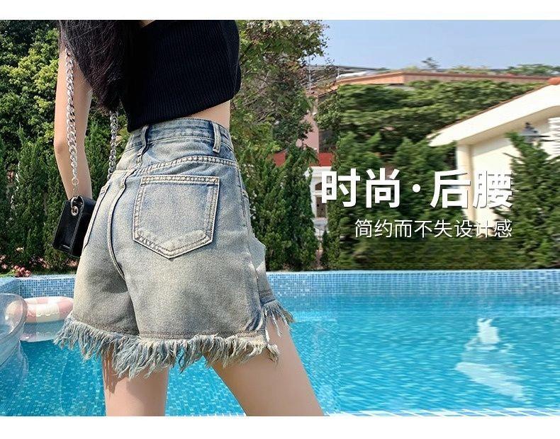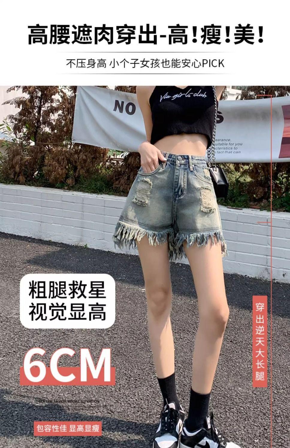Shorts de mezclilla con flecos para chica americana sexy, verano 2024, nuevos, cintura alta, rotos, adelgazantes, más fáciles de combinar, línea A, borde crudo, pantalones cortos sexys