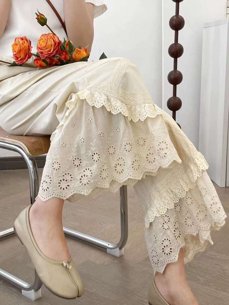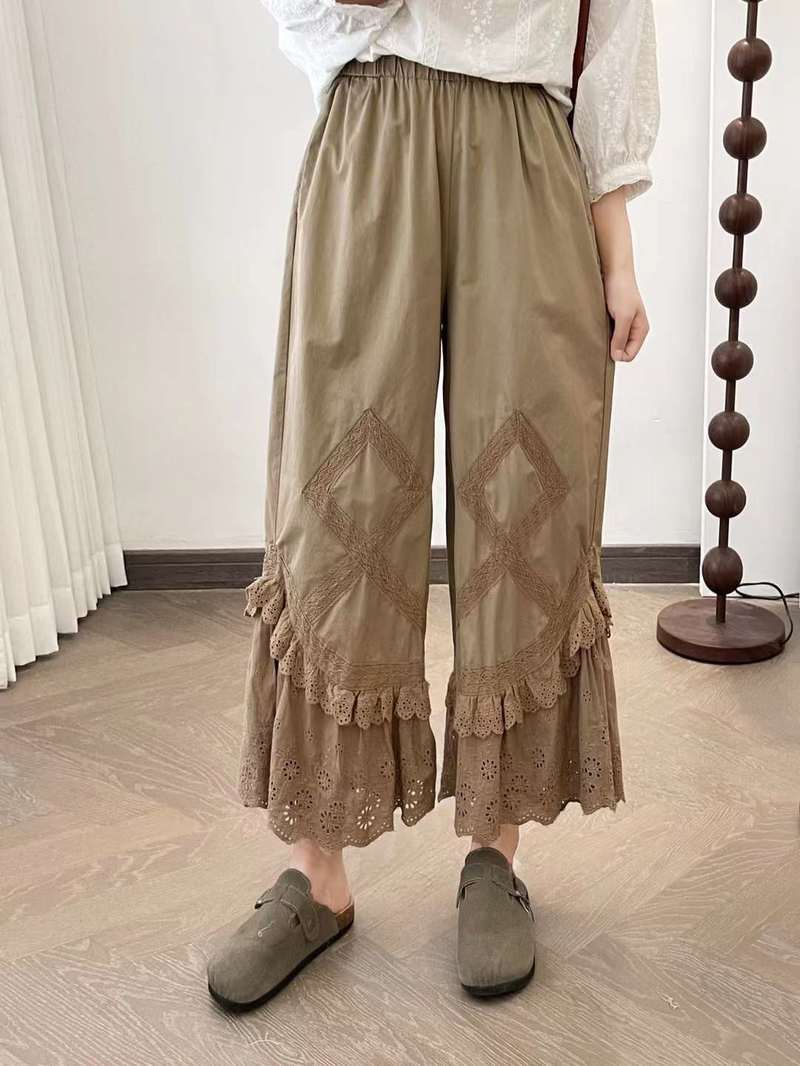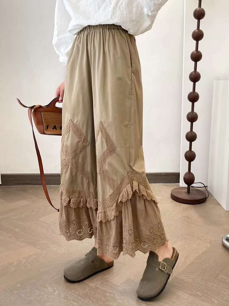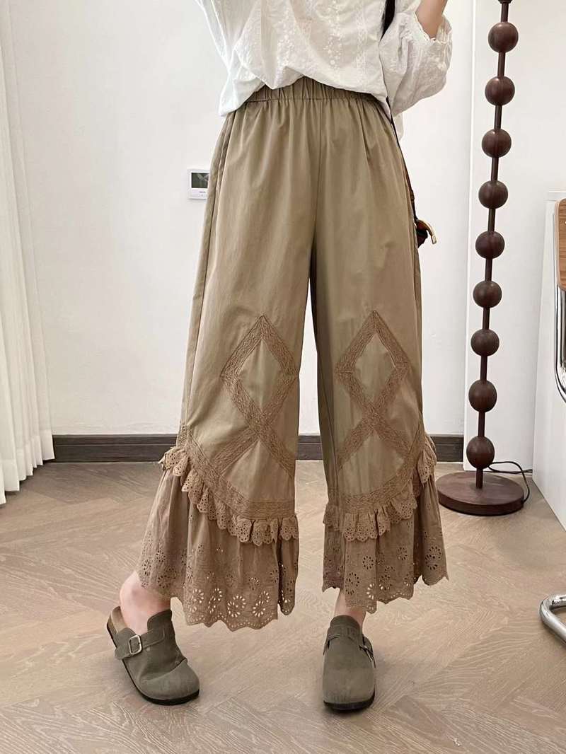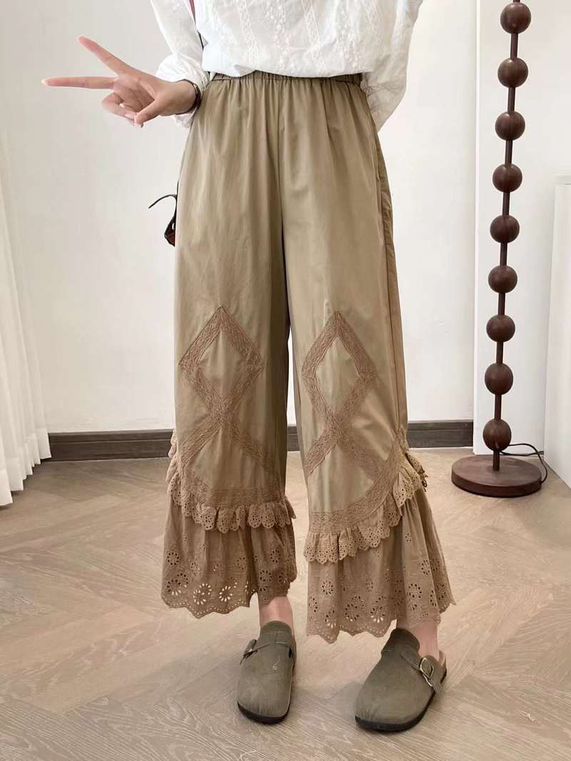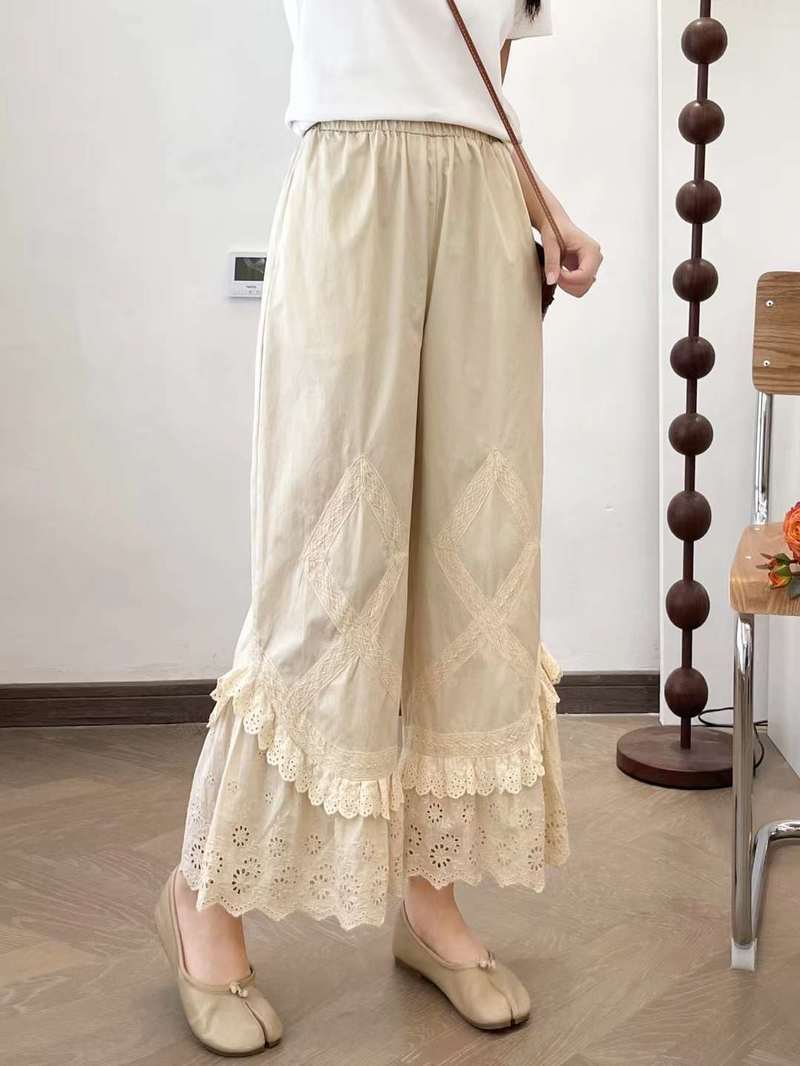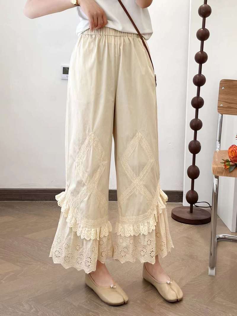 Primavera 2025 Encaje Multicapa Bordado Empalme Cintura Elástica Pantalones Casuales para Mujer Pantalones Nueve Puntos