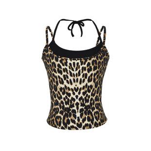 Camisola Chaleco de Dos Piezas Falso Estilo Retro Americano Estampado de Leopardo para Mujer 2025 Nuevo Sexy Halter Cuello Anudado Top sin Mangas