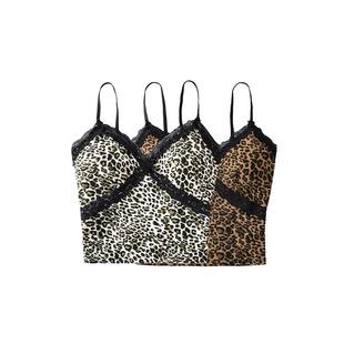 Top Corto Sexy Europeo y Americano Capa Base de Chica Hot Ropa Interior para Mujer Estampado de Leopardo Ribete de Encaje con Almohadillas en el Pecho Camiseta sin Mangas de Tirantes Espagueti al por Mayor