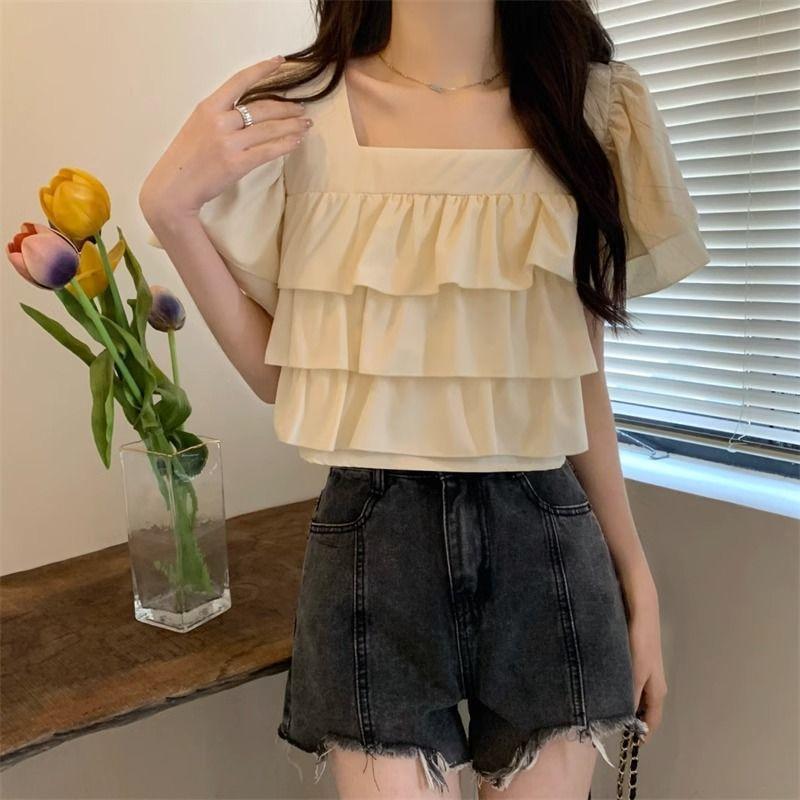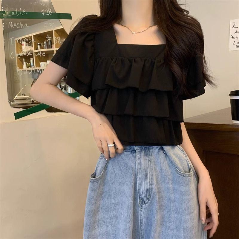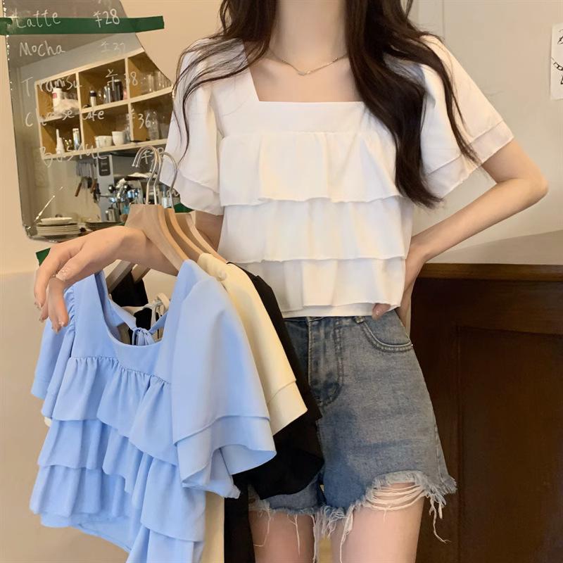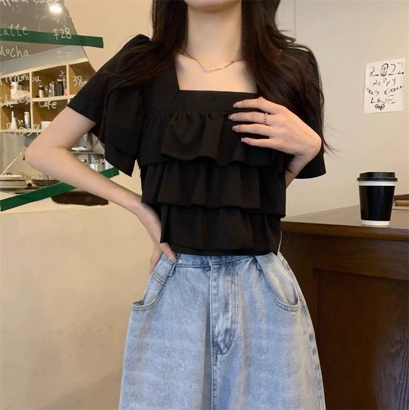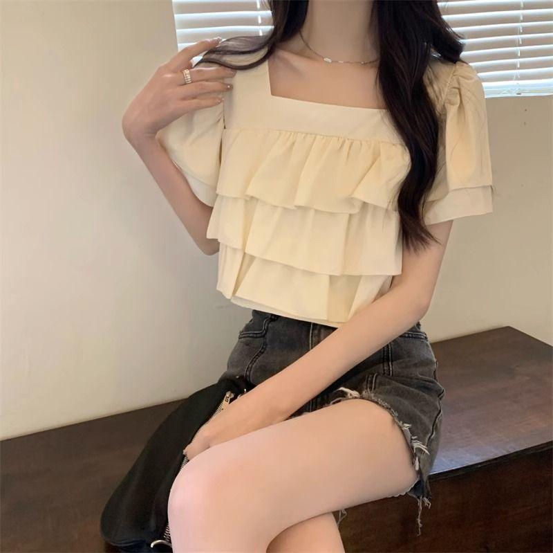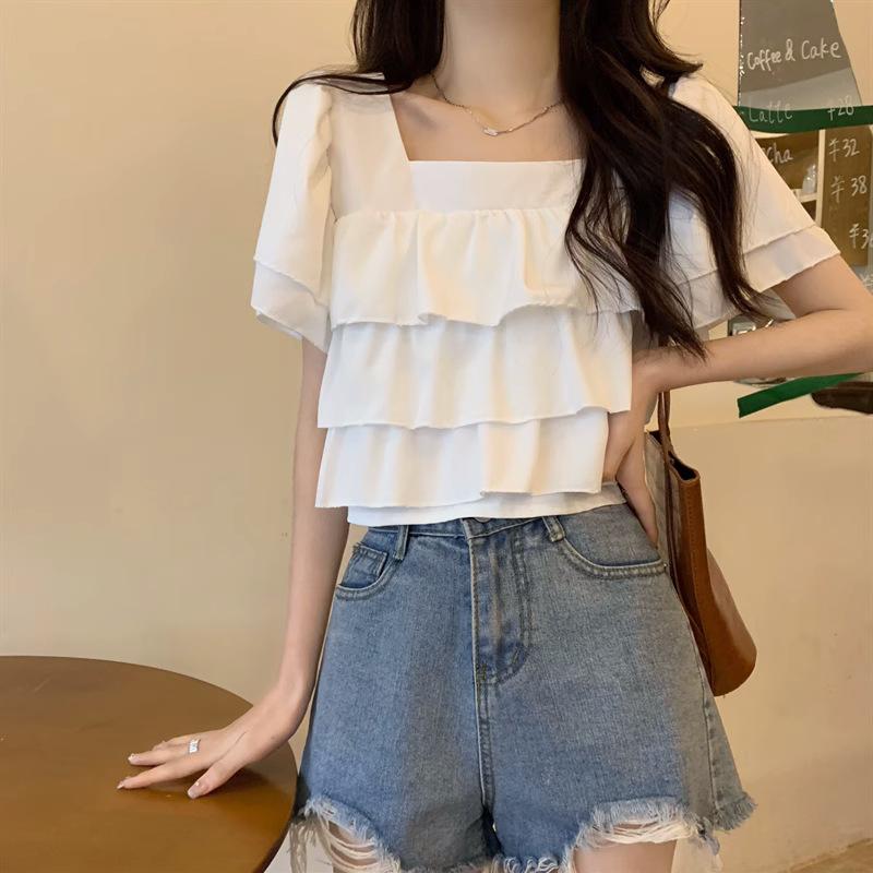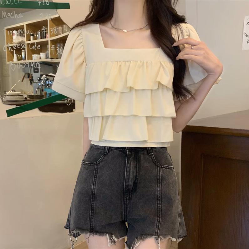 Camisa de Gasa 2025 Verano Nuevo Estilo Coreano Corte Holgado Adelgazante Manga Corta Cuello Cuadrado Versátil Elegante Top con Volantes para Mujer