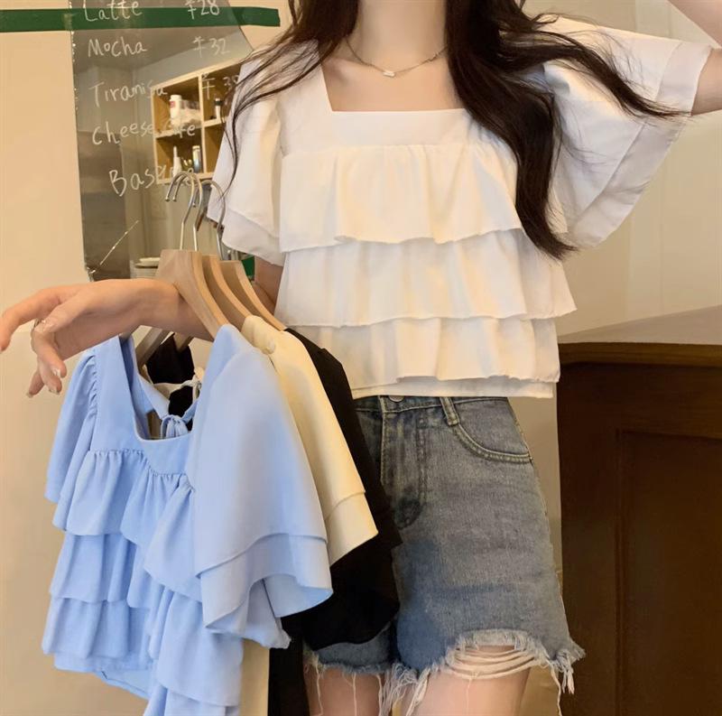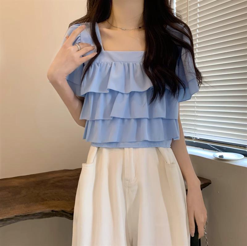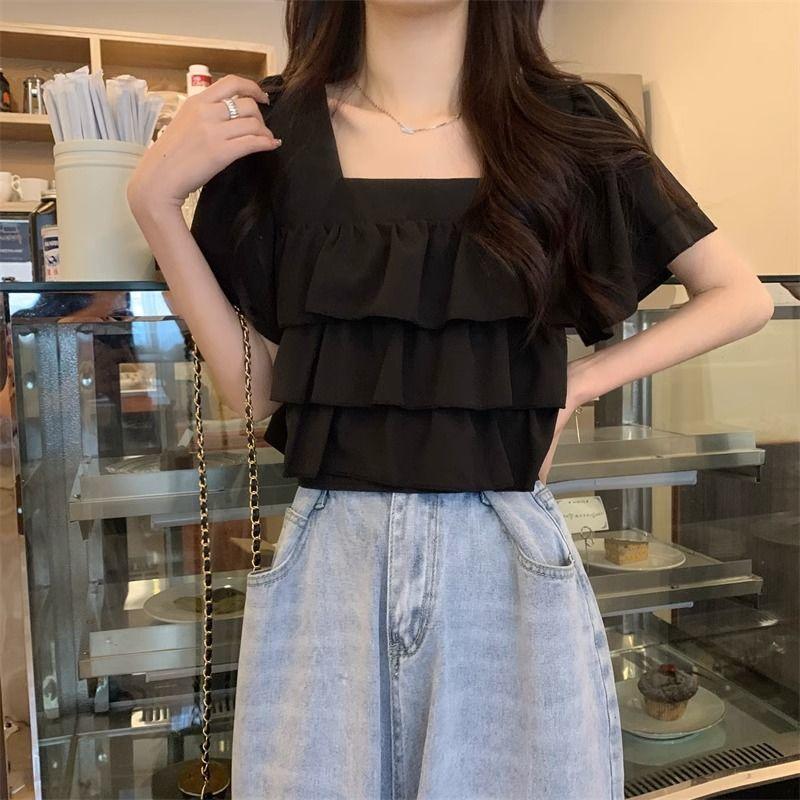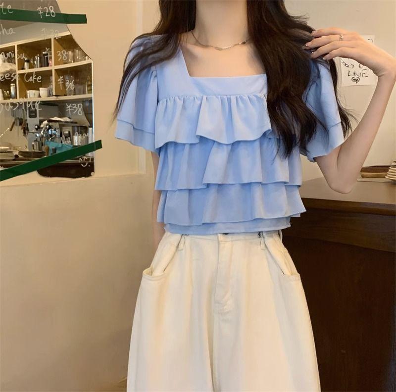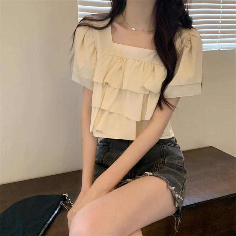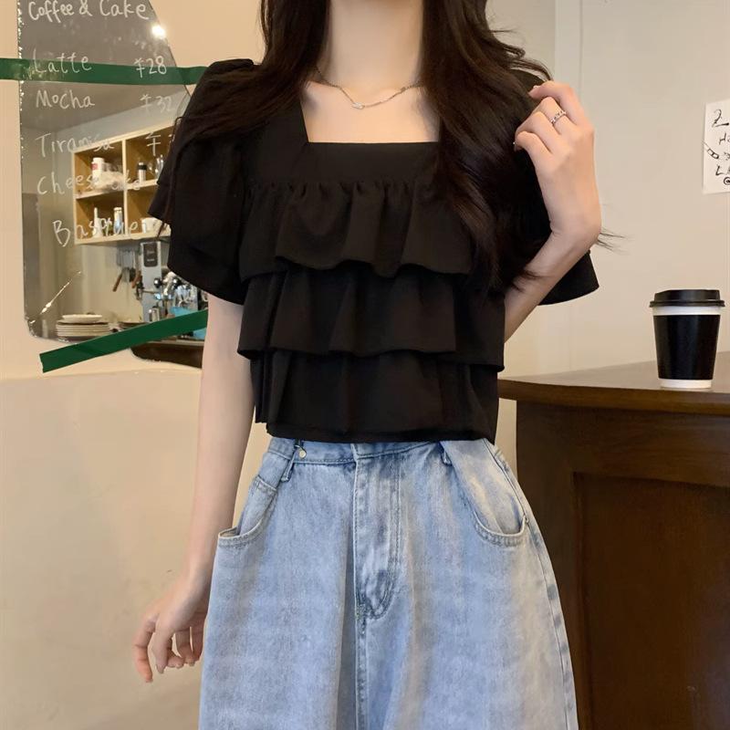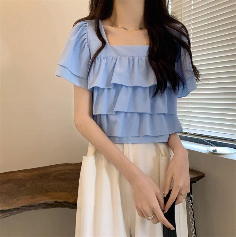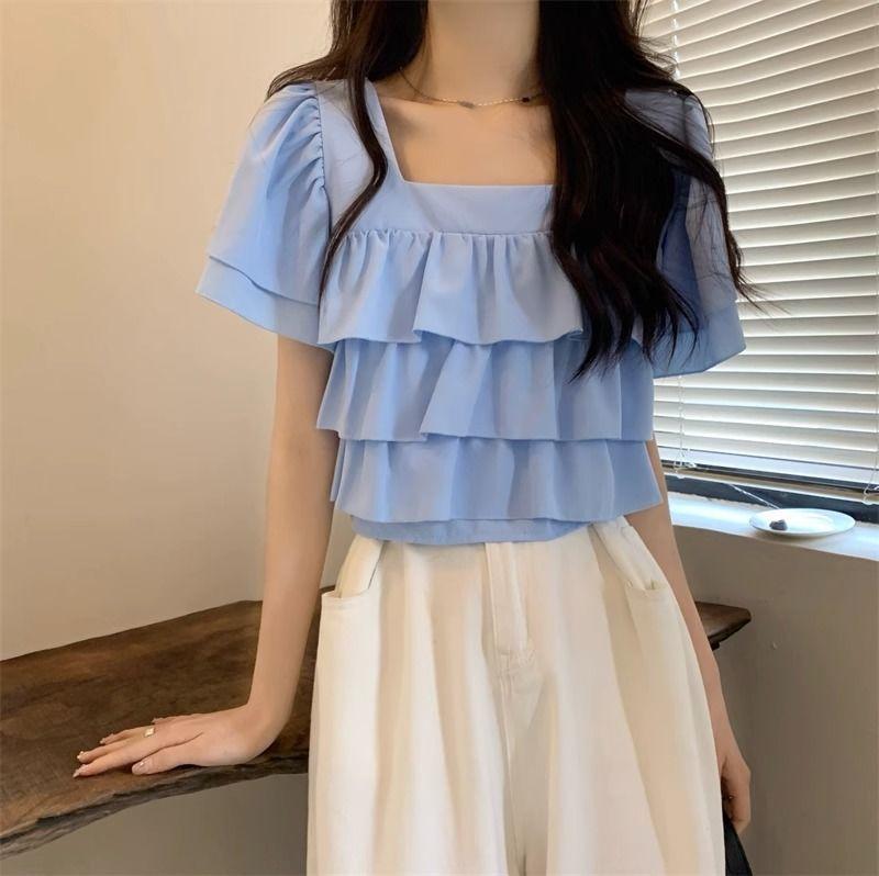 Camisa de Gasa 2025 Verano Nuevo Estilo Coreano Corte Holgado Adelgazante Manga Corta Cuello Cuadrado Versátil Elegante Top con Volantes para Mujer