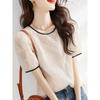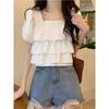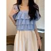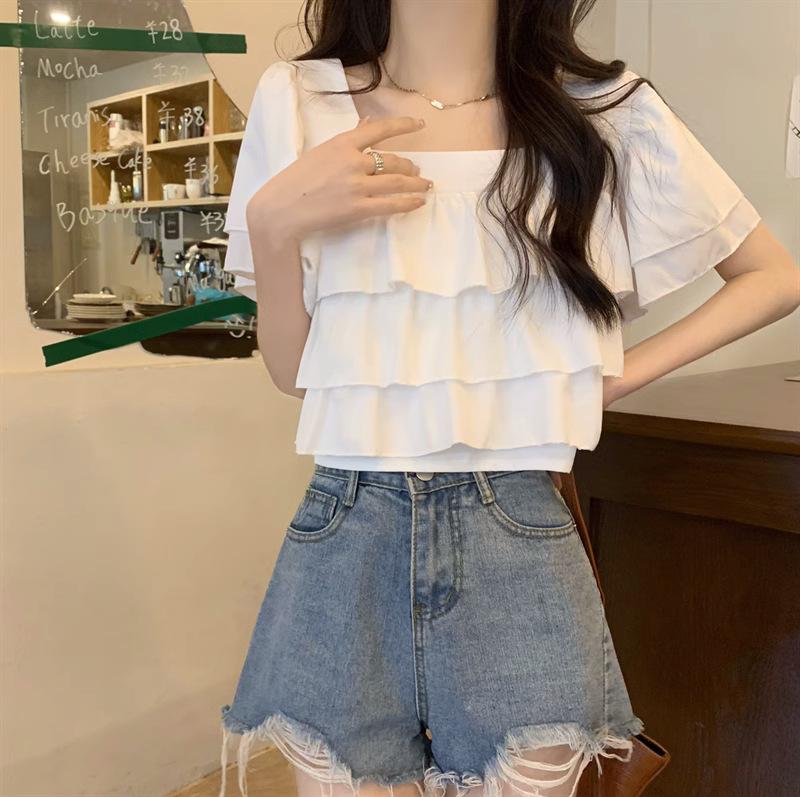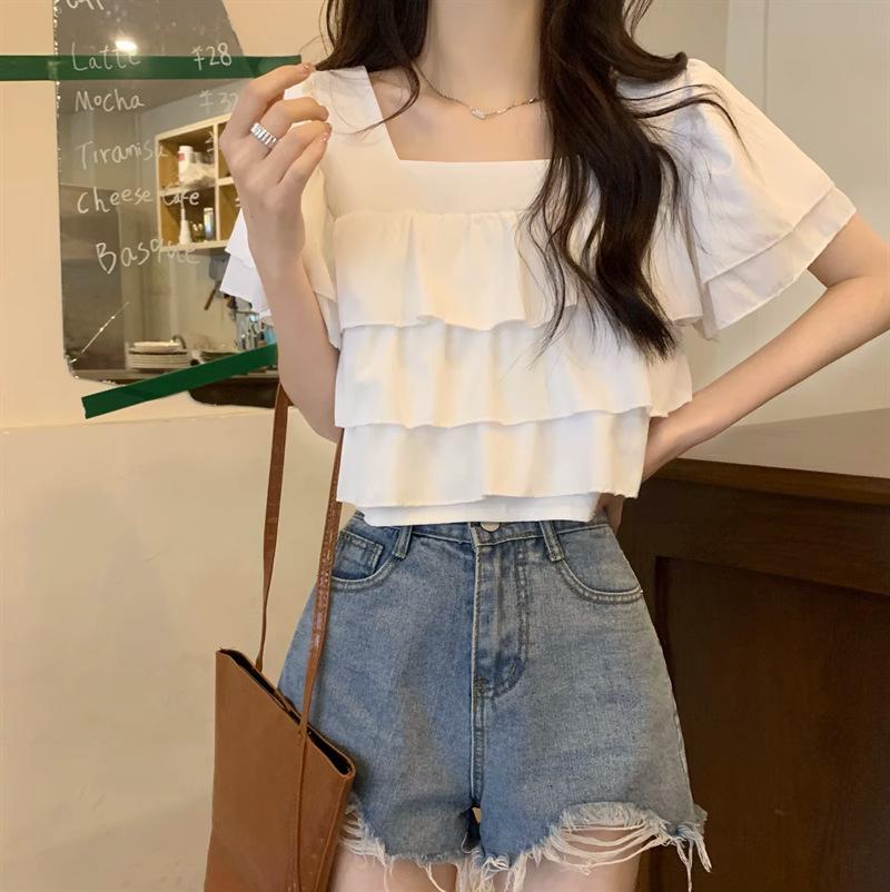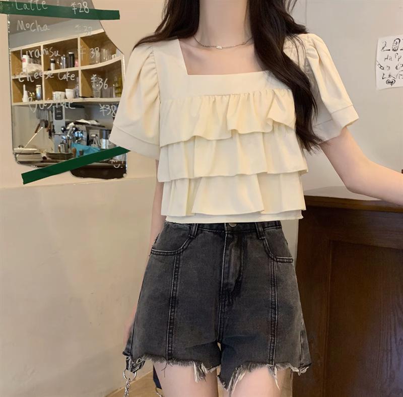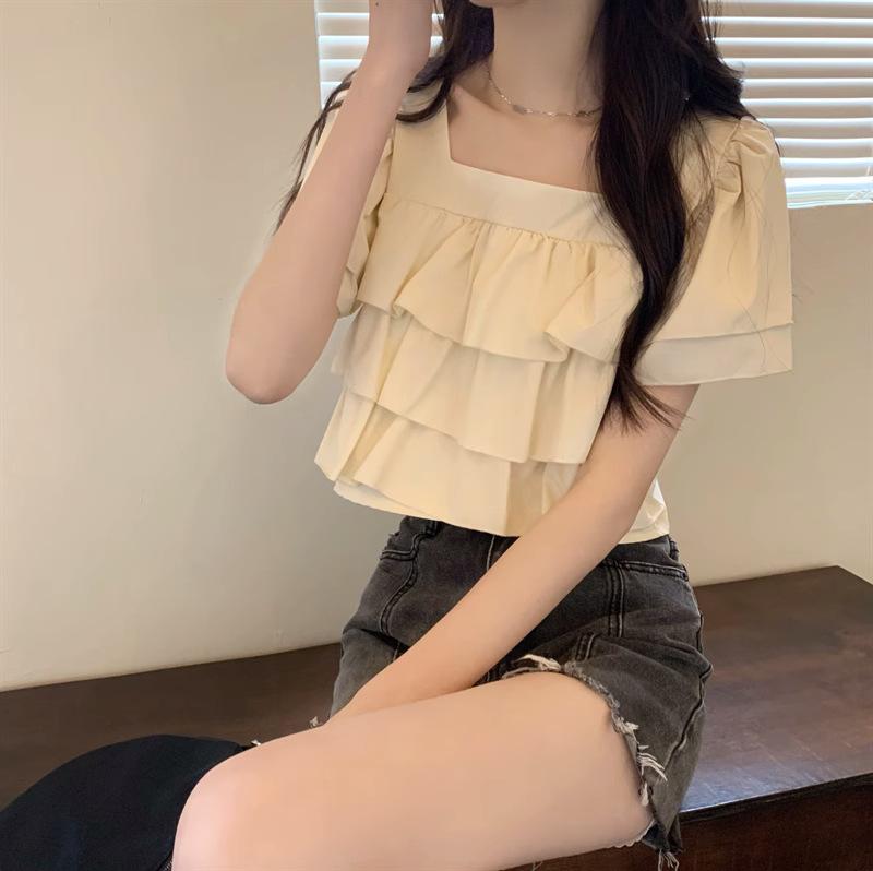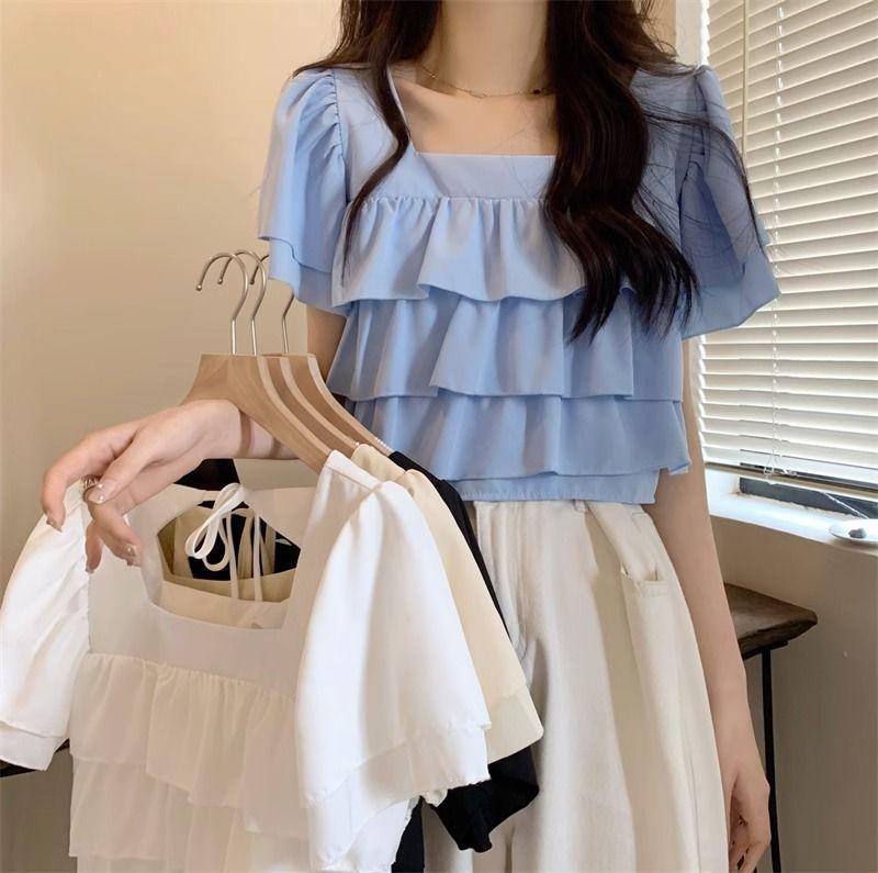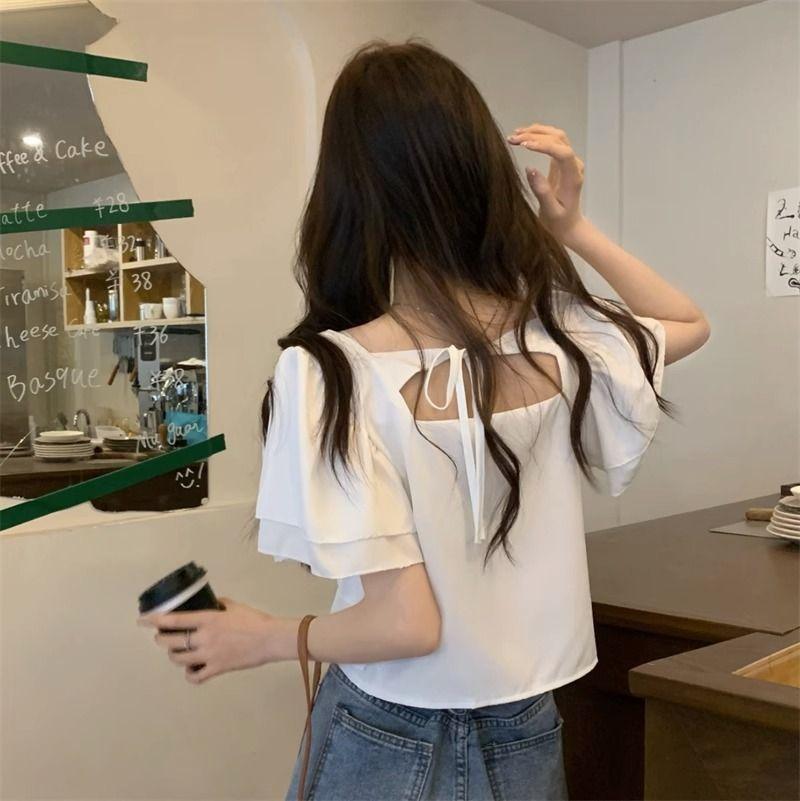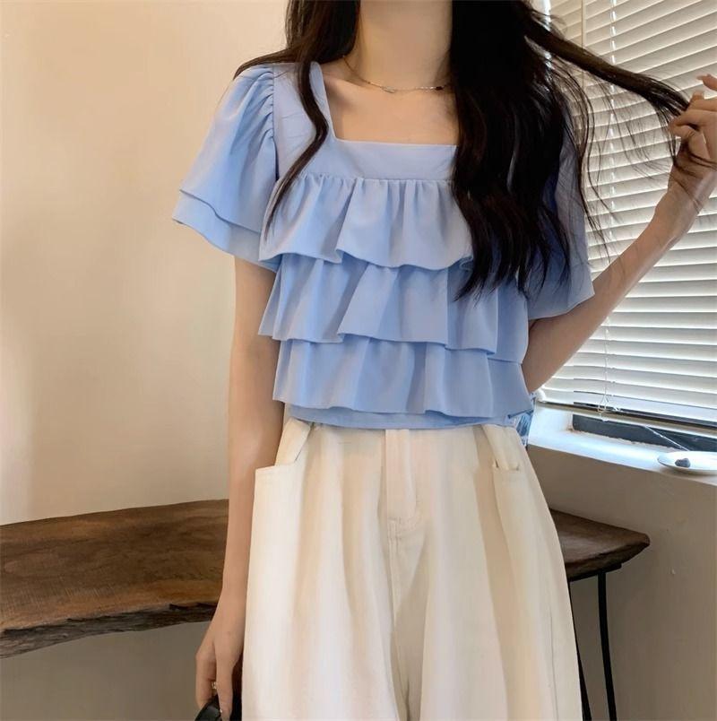 Camisa de Gasa 2025 Verano Nuevo Estilo Coreano Corte Holgado Adelgazante Manga Corta Cuello Cuadrado Versátil Elegante Top con Volantes para Mujer